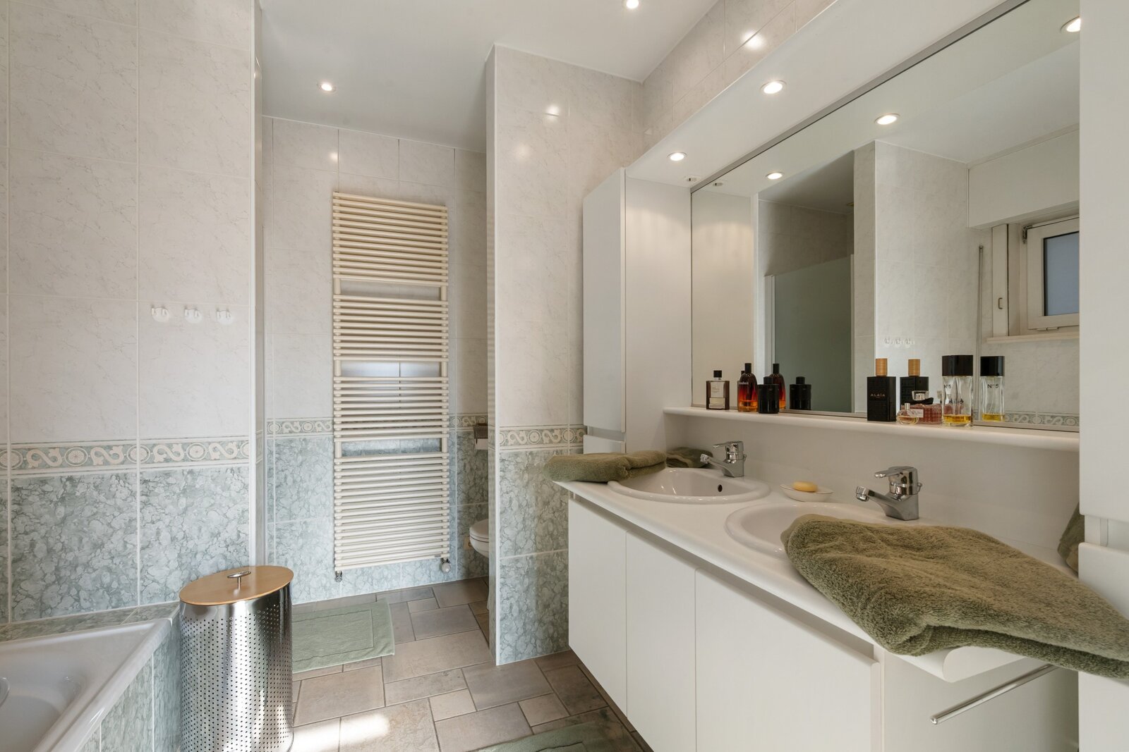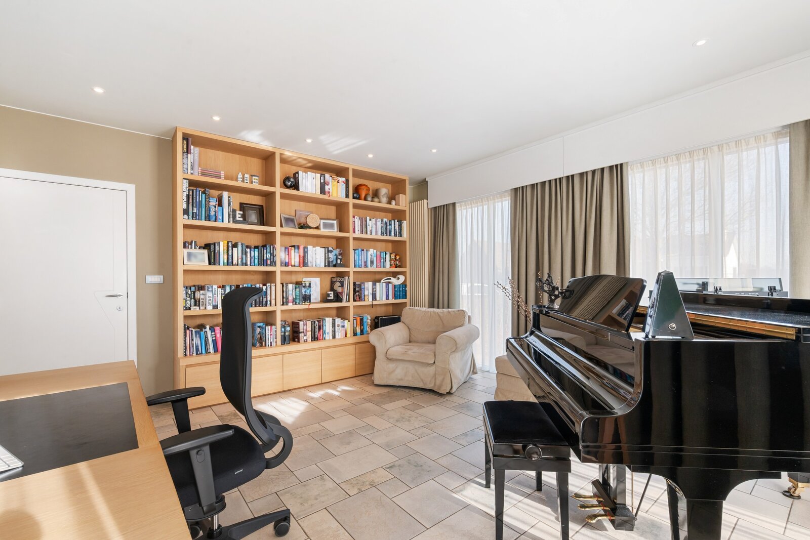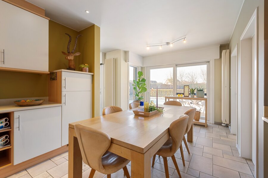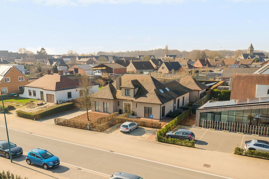 Het gelijkvloers biedt verder een ruime slaapkamer, een badkamer met bad en douche, en een dubbele inpandige garage. Op de eerste verdieping bevinden zich vier ruime slaapkamers, een extra kamer (dressing/bureau/zesde slaapkamer) en een tweede badkamer met bad en toilet.