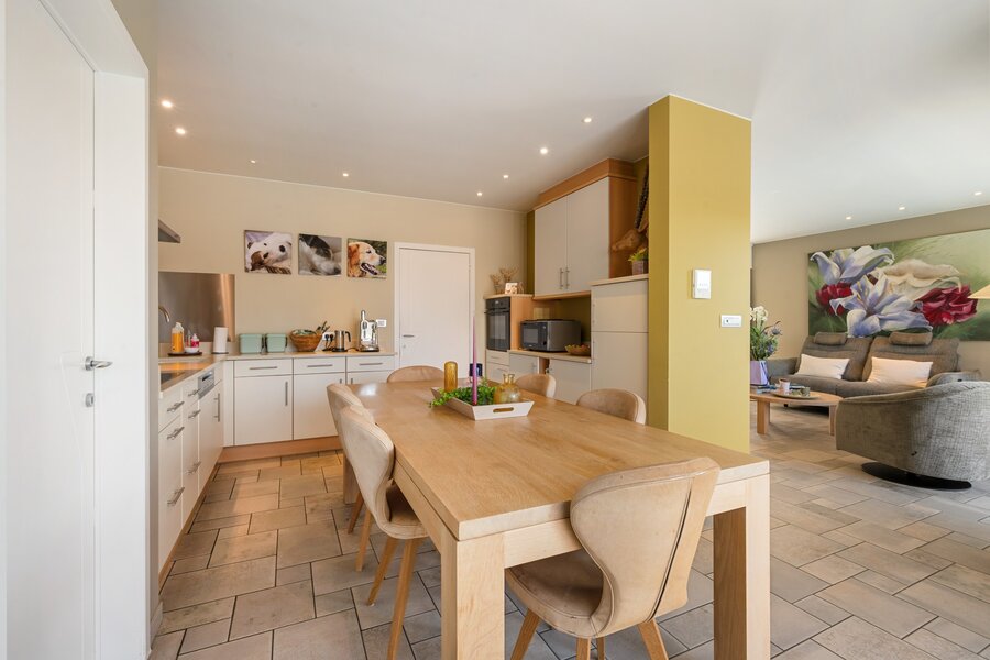 Bij binnenkomst kom je in een ruime inkomhal met toegang tot het gastentoilet, de keuken met eetplaats, de lichtrijke living en de voormalige dokterspraktijk. Keuken en living vormen een mooi geheel en geven beide uit op het zonnige terras met zicht op het privézwembad. Aansluitend is er een grote berging met veel opbergruimte.
