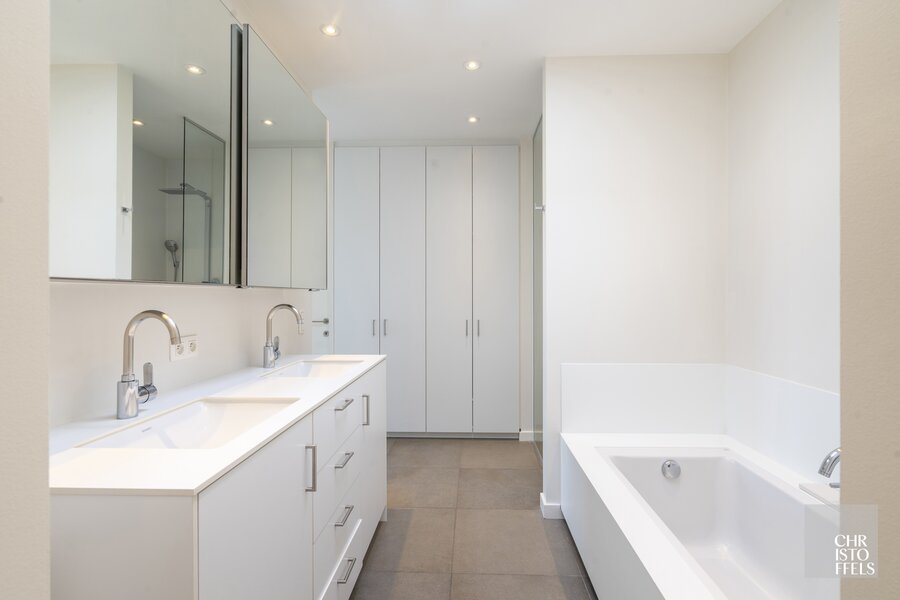 The entrance hall with wardrobe wall and separate storage room ensures a practical layout. The sleeping quarters consist of a master bedroom, a dressing room that can also be used as a second bedroom, and a luxurious Corian bathroom with double washbasin, duo bathtub, walk-in shower, and toilet.