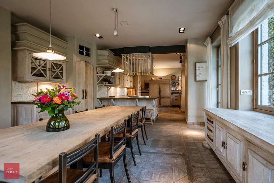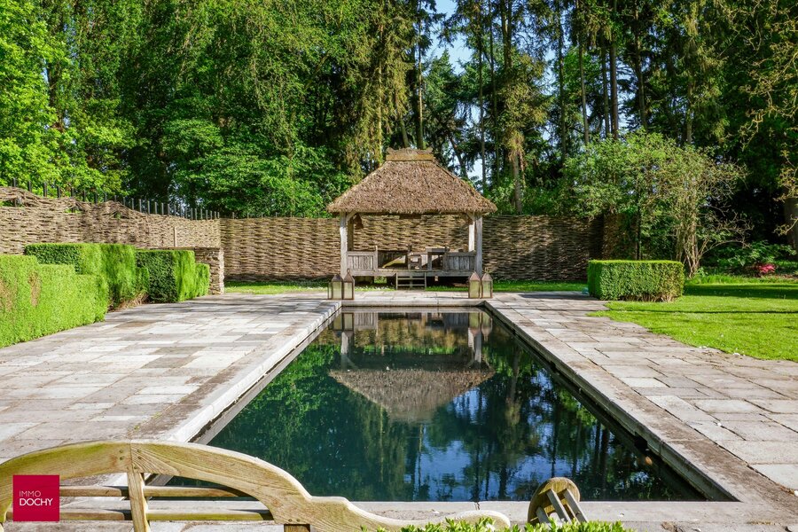 Bestaande uit inkomhal, living, eetplaats, ingerichte leefkeuken, wasplaats (bijkeuken), bureel, 4 ruime slaapkamers, 4 badkamers, dressing, volledig onderkelderd, dubbele garage, mancave en zolder. Prachtige tuin met terrassen, bos en zwembad op ca. 2,3ha. Volledig vernieuwd in 2002. Hogere prijsklasse. Alle info enkel telefonisch of ten kantore.