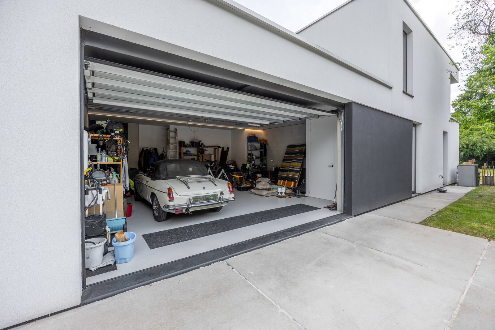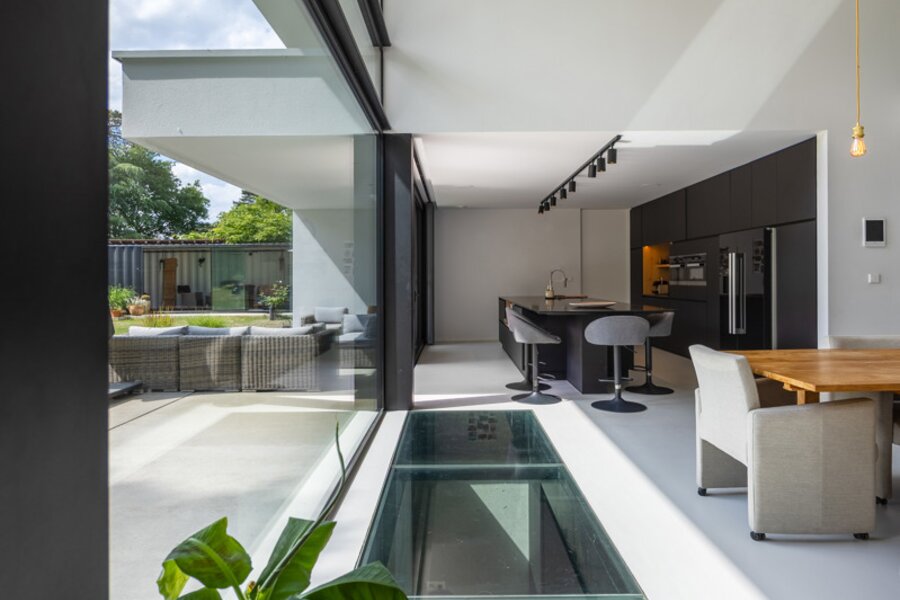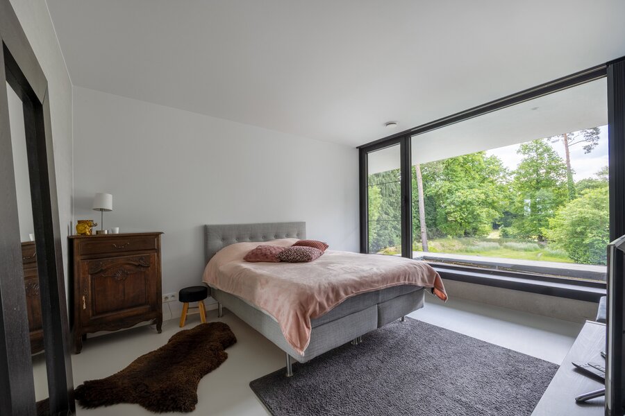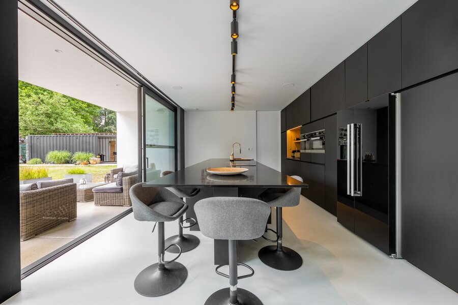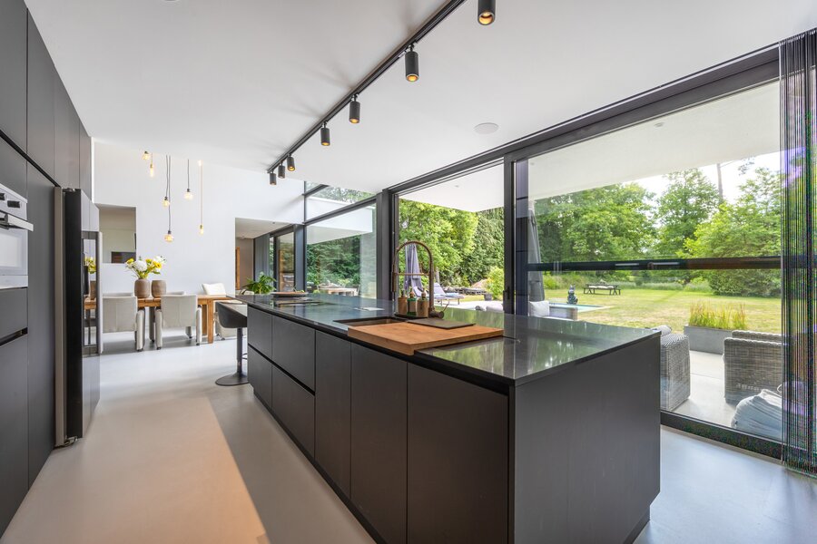 Gelijkvloers Inkomhal met ingemaakte vestiairekasten en gastentoilet. Toegang tot de leefruimte met veel natuurlijke lichtinval, ingedeeld in een salon met gashaard, een eetkamer open tot in de nok, en een hypergeïnstalleerde open keuken uitgerust met een kook- en eeteiland (5 m), koffiecorner met Quooker-kraan, inductievuur met ingebouwde dampkap, powerport, Amerikaanse koelkast/diepvries, vaatwasmachine, oven en combi-oven. Aansluitend bevindt zich een berging/wasplaats met doucheruimte voor huisdieren, dienstingang, aparte koele berging en een dubbele inpandige garage met tweede aansluiting voor wasmachine en droogkast en laadpaal.
