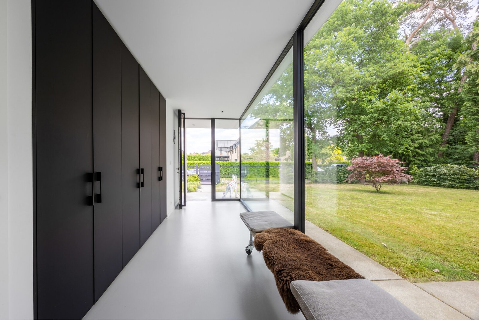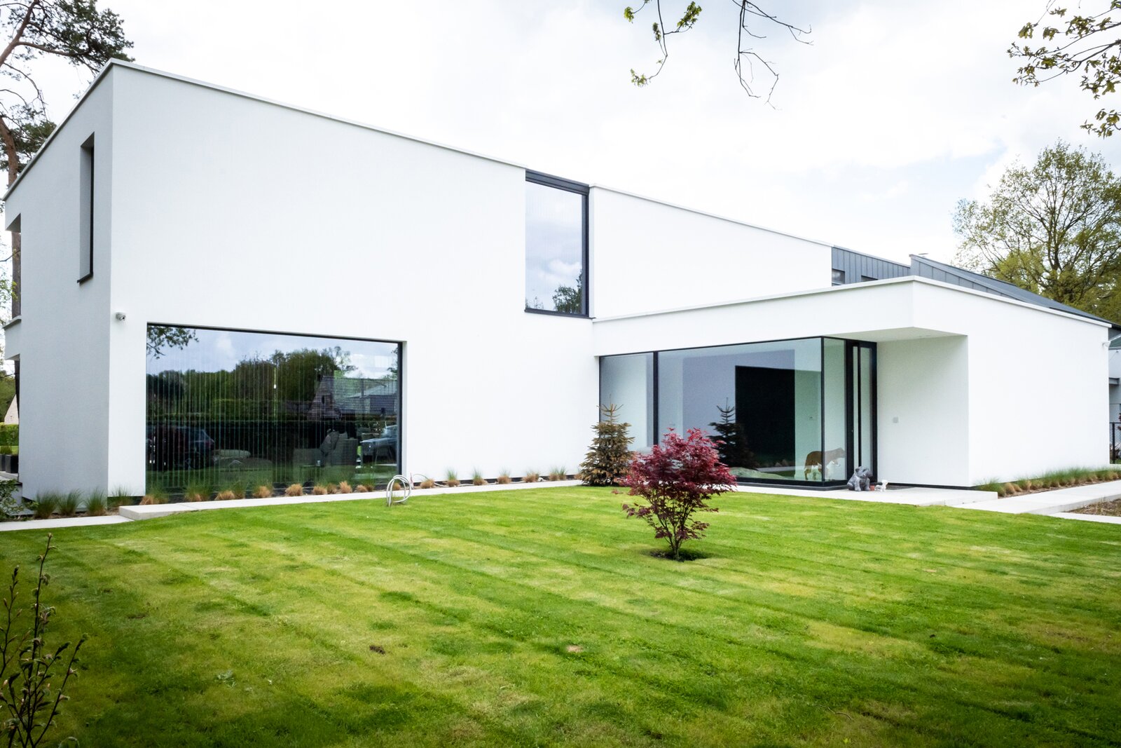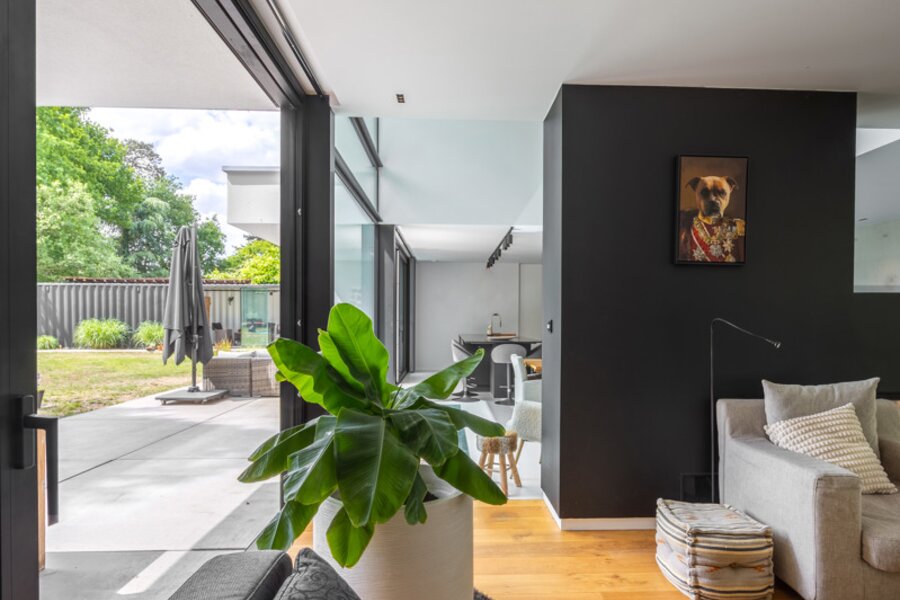 Gelijkvloers Inkomhal met ingemaakte vestiairekasten en gastentoilet. Toegang tot de leefruimte met veel natuurlijke lichtinval, ingedeeld in een salon met gashaard, een eetkamer open tot in de nok, en een hypergeïnstalleerde open keuken uitgerust met een kook- en eeteiland (5 m), koffiecorner met Quooker-kraan, inductievuur met ingebouwde dampkap, powerport, Amerikaanse koelkast/diepvries, vaatwasmachine, oven en combi-oven. Aansluitend bevindt zich een berging/wasplaats met doucheruimte voor huisdieren, dienstingang, aparte koele berging en een dubbele inpandige garage met tweede aansluiting voor wasmachine en droogkast en laadpaal.