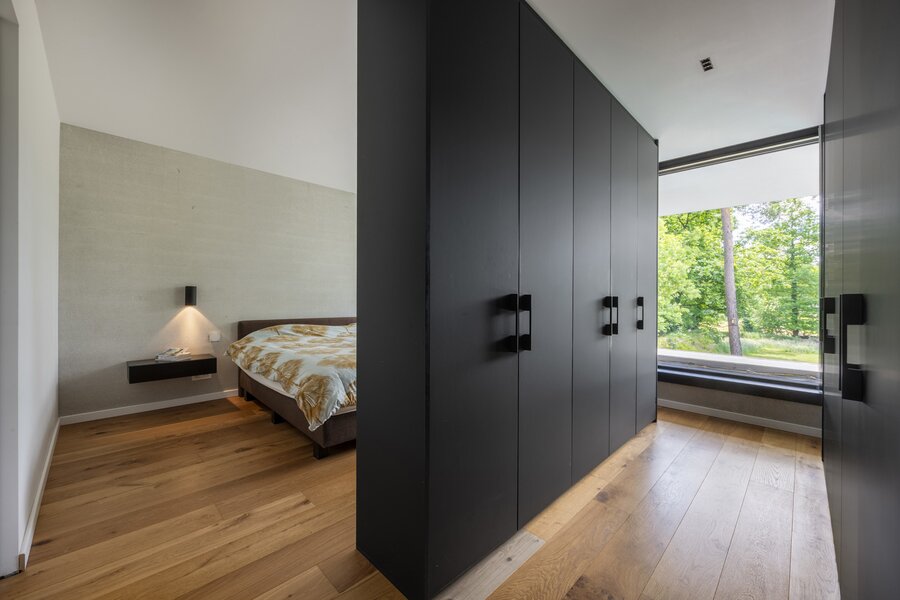 Verdieping +1 Overloop met volledige kastenwand (9 m²), toegang tot slaapkamer 1, slaapkamer 2 en badkamer 1 (douche en lavabo). Apart toilet op de gang. De hoofdslaapkamer is uitgerust met ingerichte dressing en badkamer ensuite (ligbad, inloopdouche, dubbele lavabo en toilet).