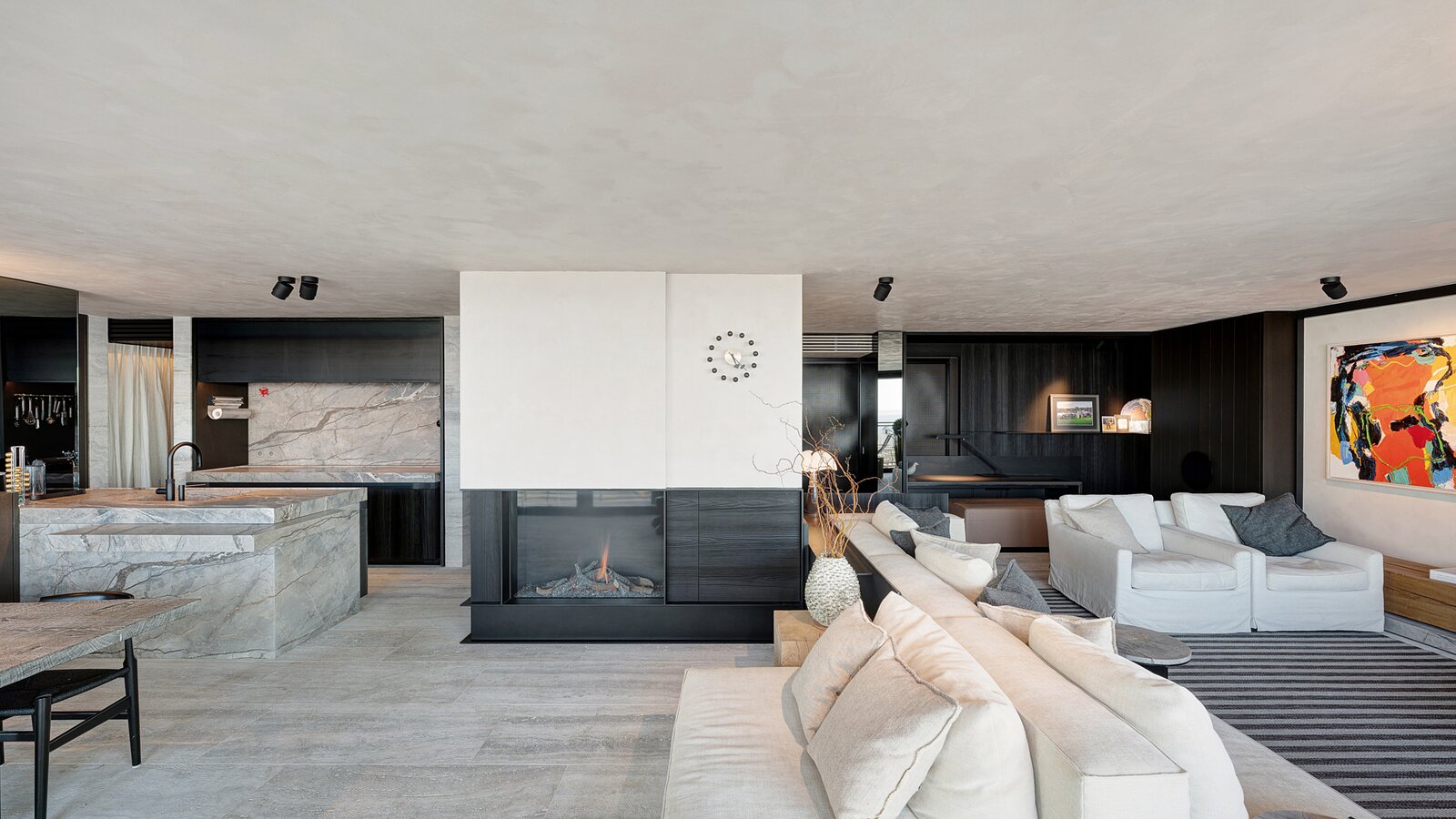 The spacious entrance hall with cloakroom and guest toilet leads to the bright living room with lounge, office corner, and cozy gas fireplace. Large windows open onto the front terrace (13 m²) and offer a beautiful panoramic view of the sea. The open kitchen is equipped with Miele appliances and is complemented by a practical storage room, utility room, and separate laundry room.