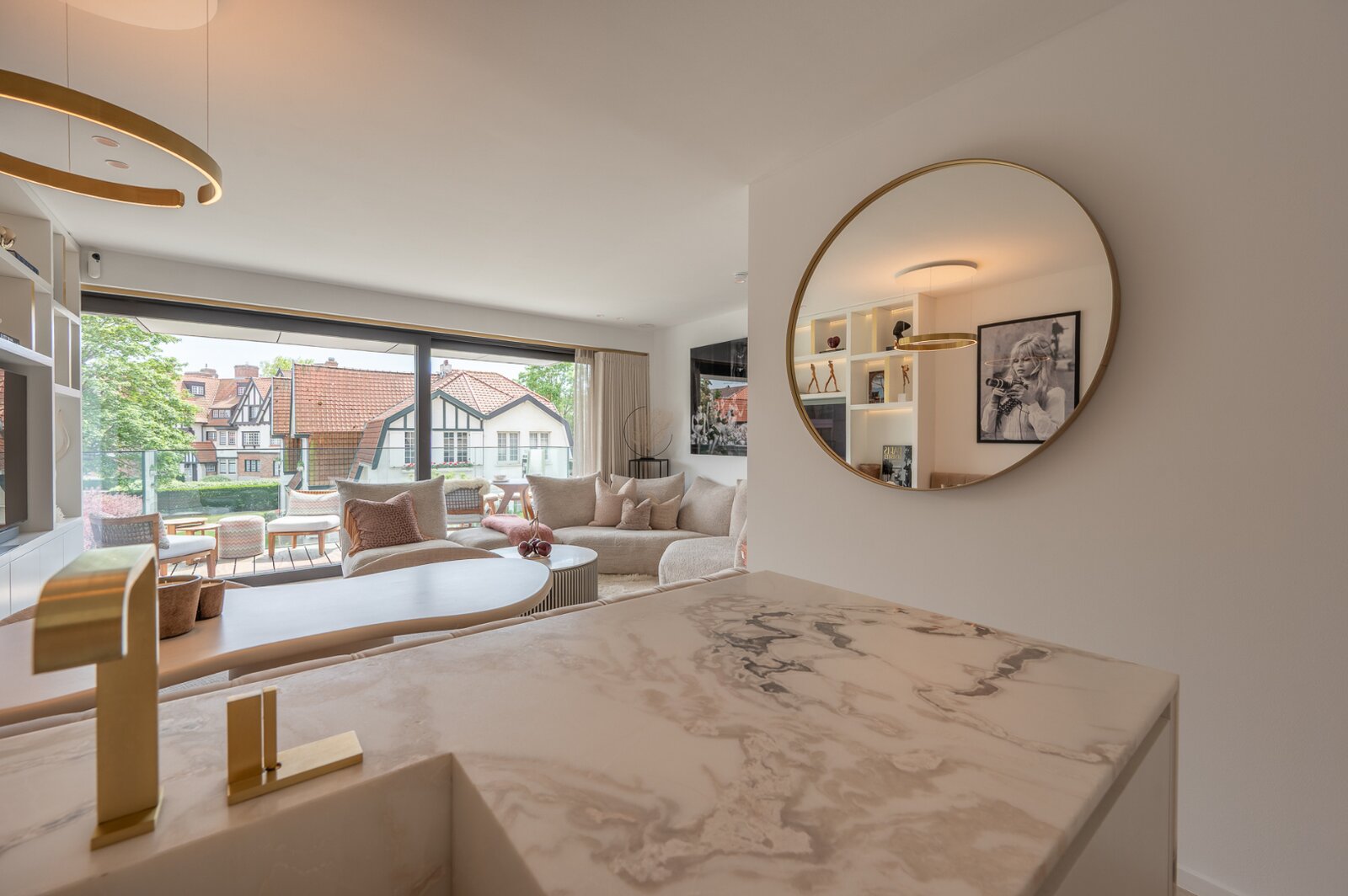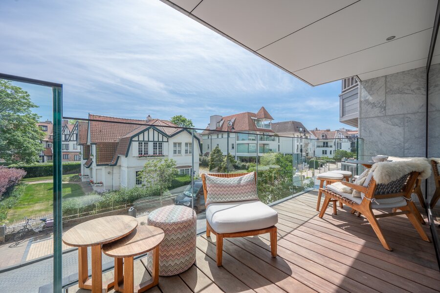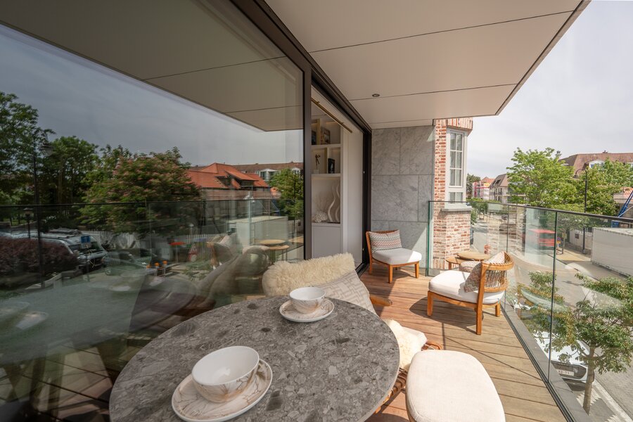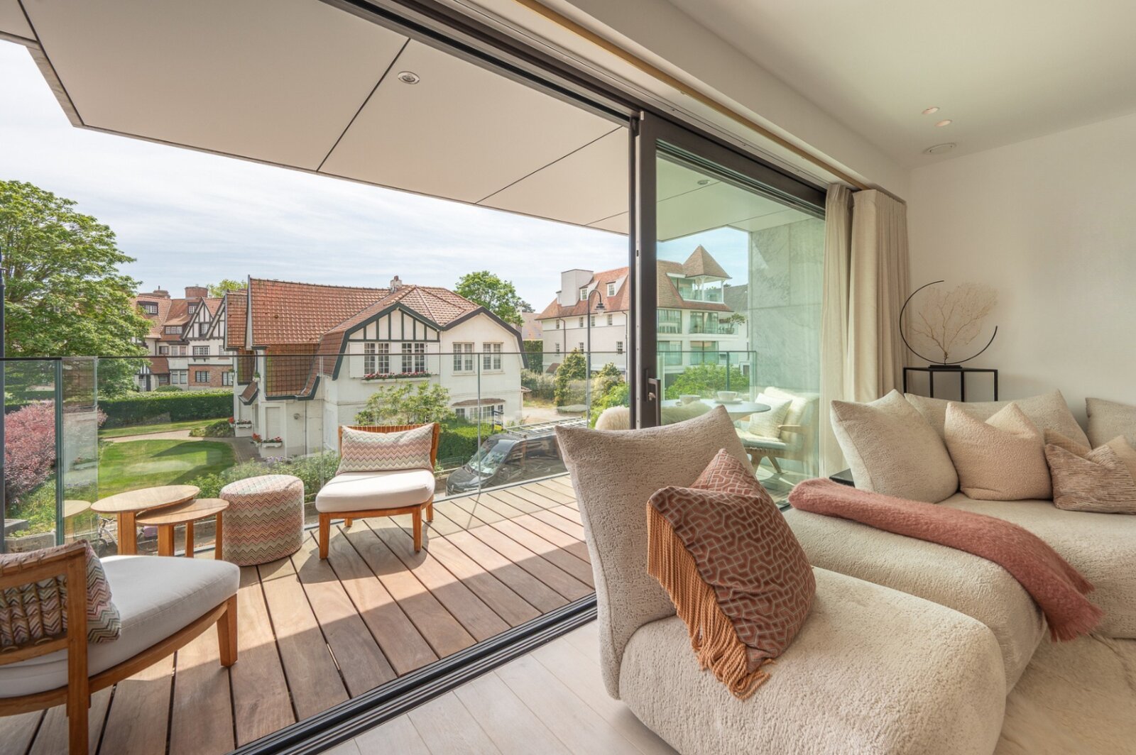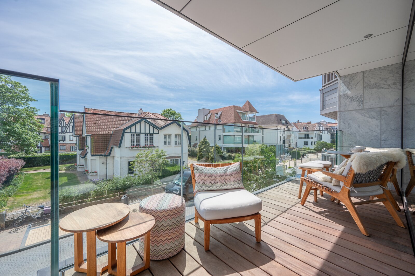 Top finished new construction apartment (sale under registration duties) with 2 bedrooms and spacious south facing terrace with open view on the green, located in the prestigious residence "Pogany" on the Kustlaan in the Zoute.
