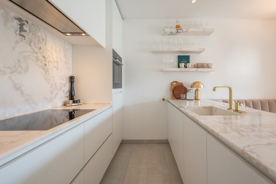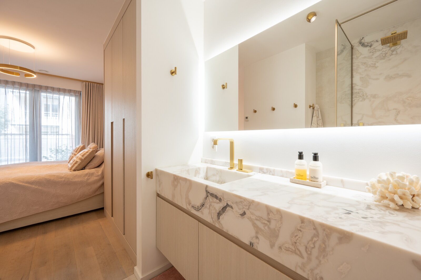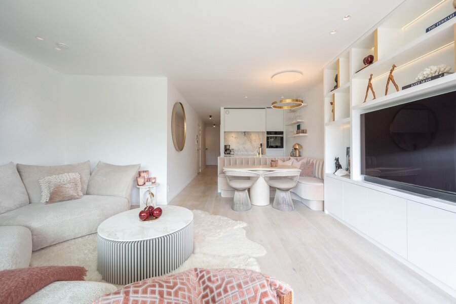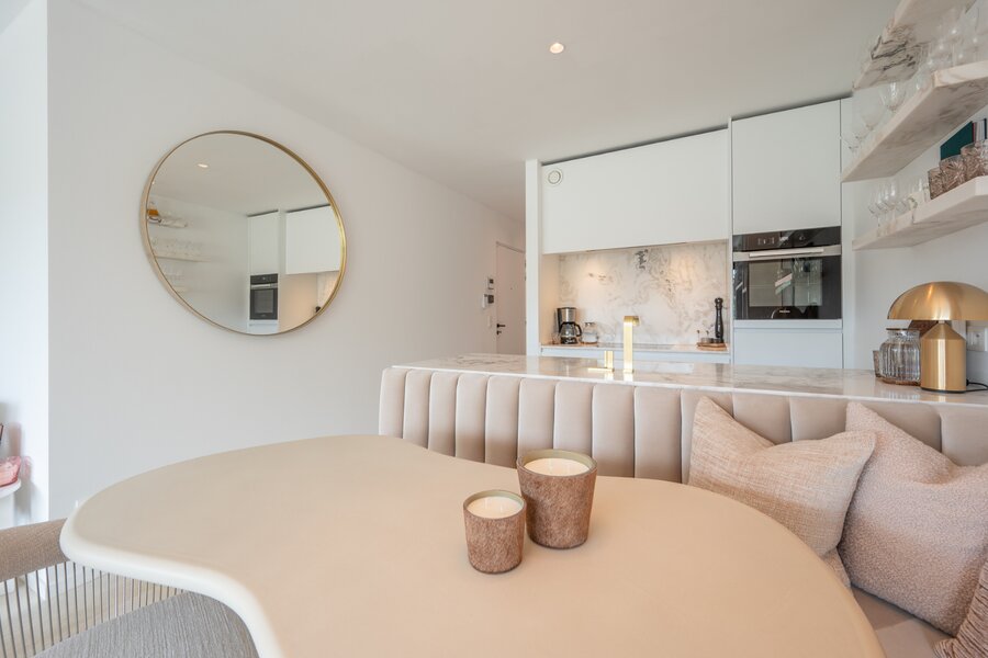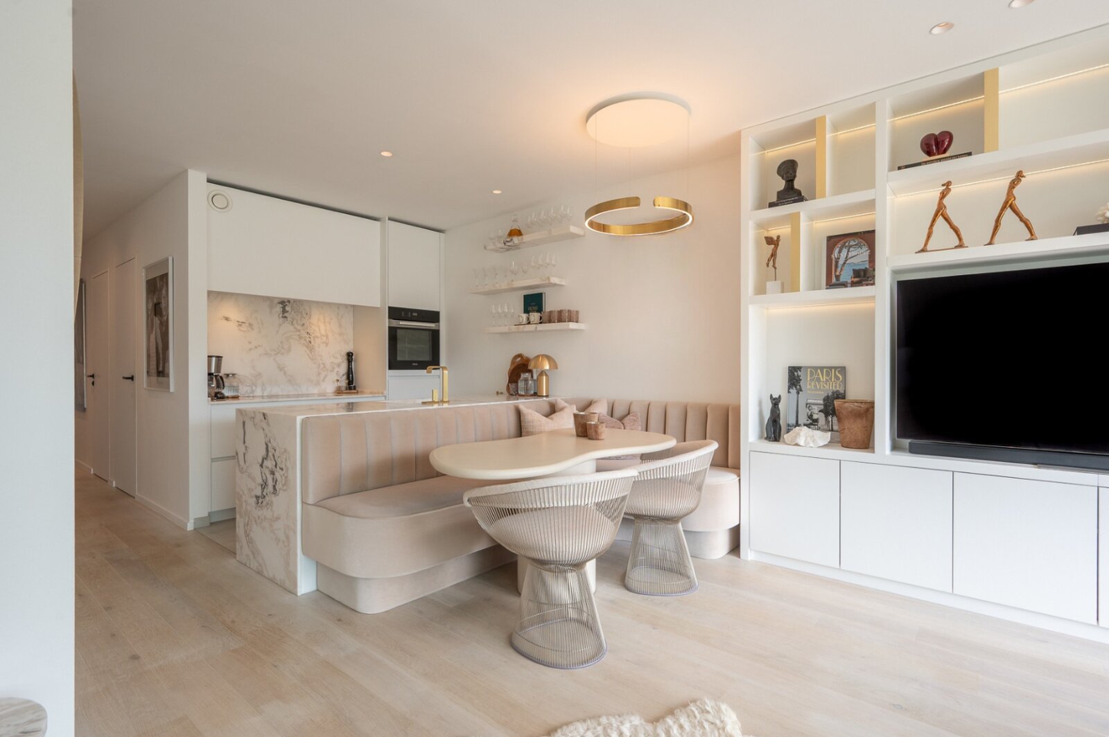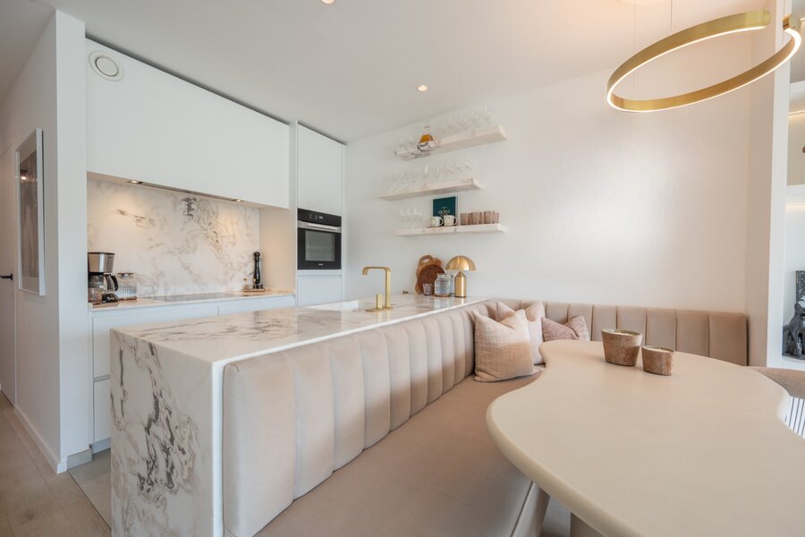 Top finished new construction apartment (sale under registration duties) with 2 bedrooms and spacious south facing terrace with open view on the green, located in the prestigious residence "Pogany" on the Kustlaan in the Zoute.
