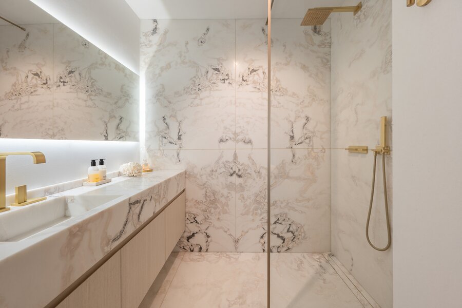 Entrance with checkroom and guest toilet. Bright living room consisting of luxuriously equipped open kitchen with island, dining area and lounge opening onto the south facing terrace with open view of the green. Bedroom 1 with fitted wardrobes and luxury marble shower room. Bedroom 2 with adjoining shower room (currently used as a dressing room). Terrace at the back. Storage room with connection for washer/dryer. Spacious private cellar in the residence. Possibility to take over a rental contract of a large garage in the immediate vicinity of the residence. A visit to this beautiful apartment is warmly recommended!