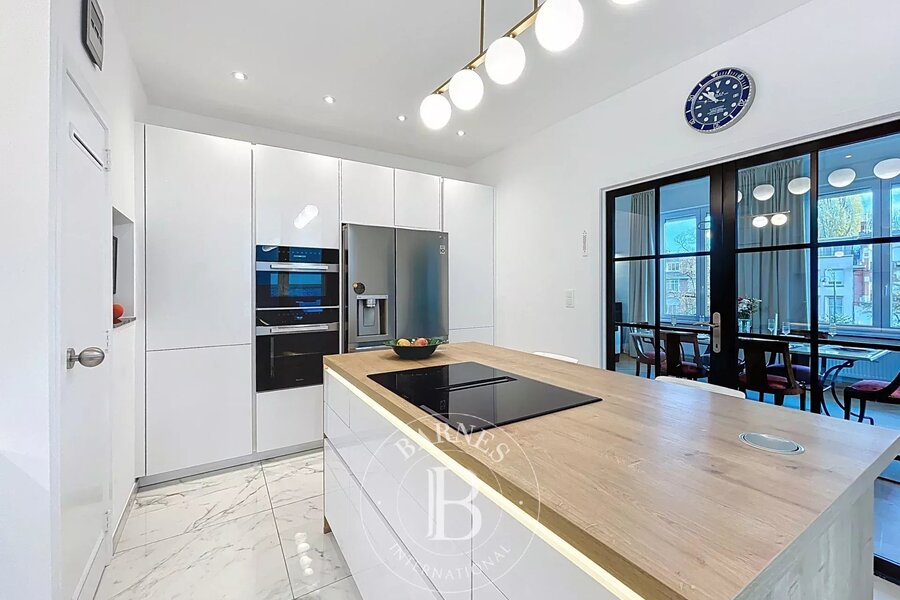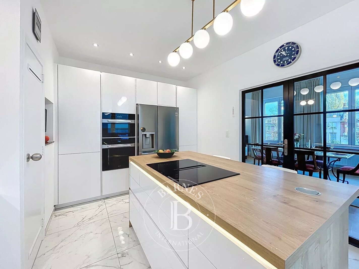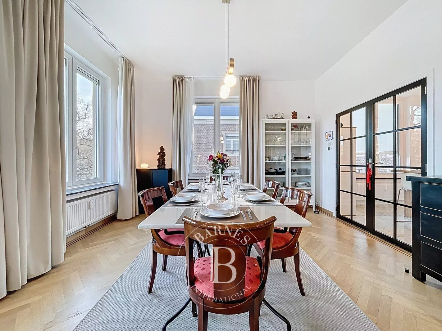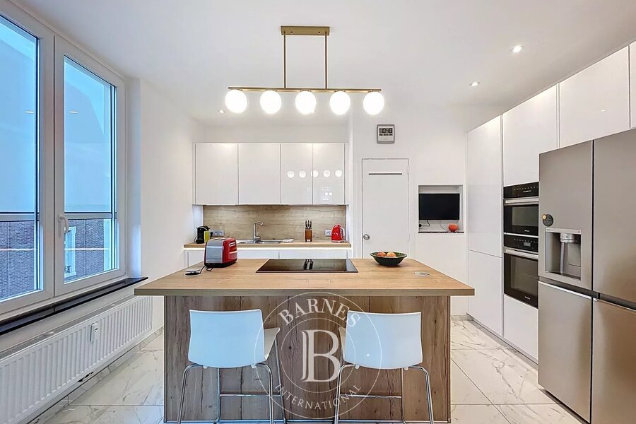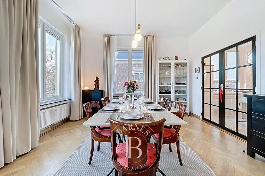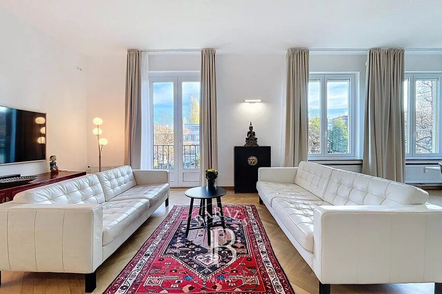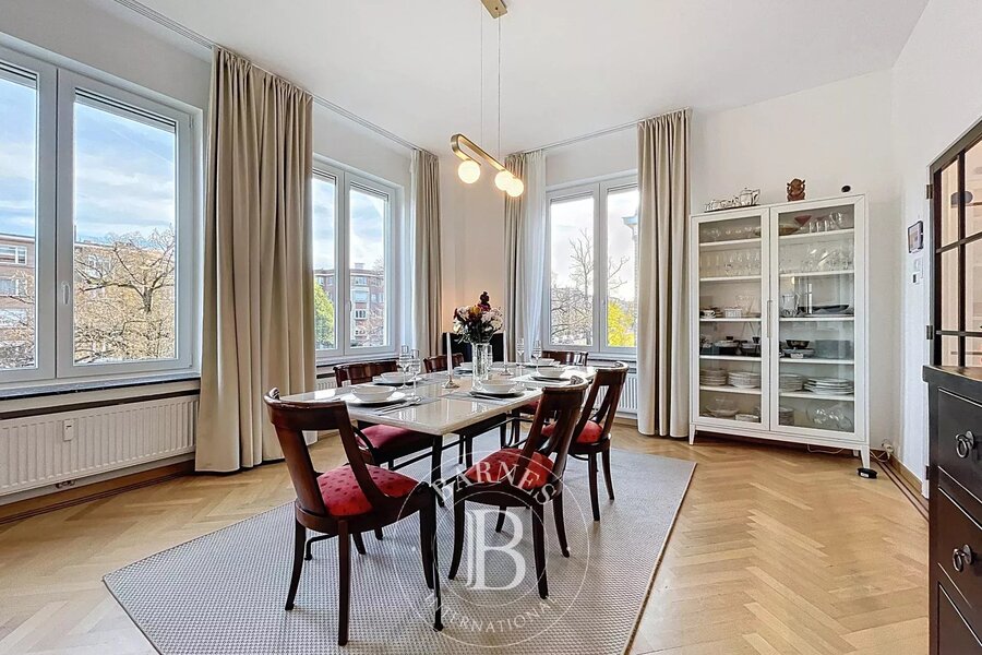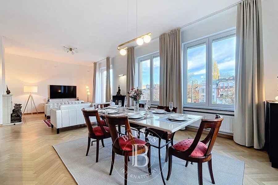 Barnes offers you a superb 141 m² 3-facade apartment, completely renovated in 2024, located on the second floor of a luxury building. It comprises a marble-floored entrance hall, a ±41 m² living and dining room with solid oak parquet laid in Hungarian style, including a living room with open fire and a dining room adjoining a fully equipped independent kitchen with central island and American fridge. The sleeping area offers three bedrooms with parquet floors (12 m², 14 m² and 22 m²), a bathroom, a shower room, a guest toilet and a laundry room. A cellar completes the property. A lock-up garage is available as an option at a price of €30,000, as is a maid's room measuring ±10 m² at a price of €20,000. PEB D-. Technical aspects: acoustic frames, radiators, electricity, kitchen, sanitary facilities, armored door, RJ45 cabling. Monthly charges: ±400 € (heating, hot and cold water, syndic, garden and common maintenance, insurance, etc.) plus ±100 € for the reserve fund.