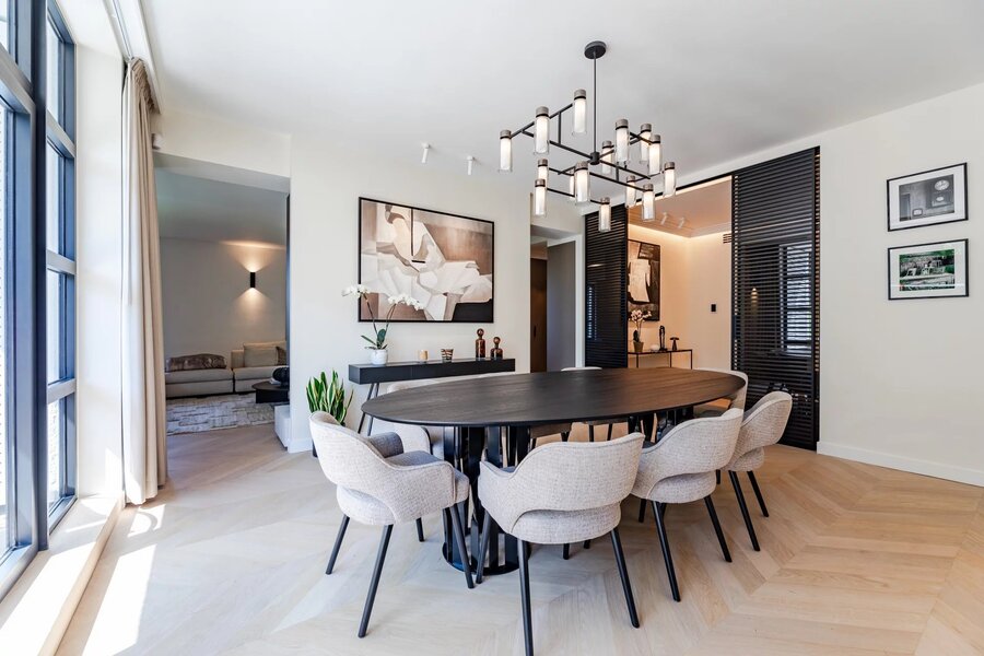 A large entrance hall with checkroom and guest toilet, a spacious living room with open fire and integrated bar, a bright dining room with access to a beautiful 15m2 terrace ideally facing south-west with a tree-lined view, a hyper-equipped semi-open kitchen (top-of-the-range Italian brand Binova Cucine).