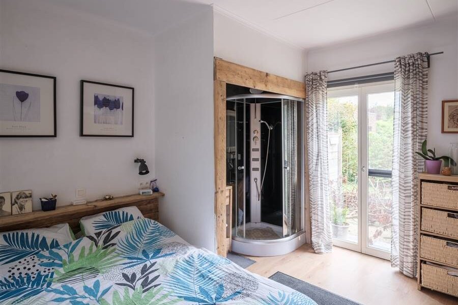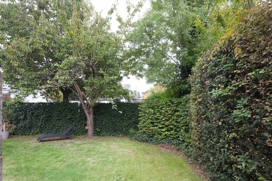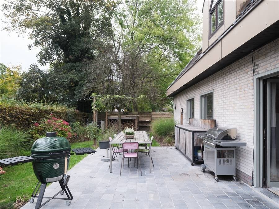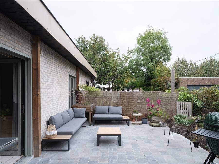 Buiten geniet je van twee terrassen, zowel aan de zijkant als achteraan en een tuin die logisch is opgesplitst in twee afzonderlijke delen. Ideaal om ook buiten van een eigen plek te genieten.