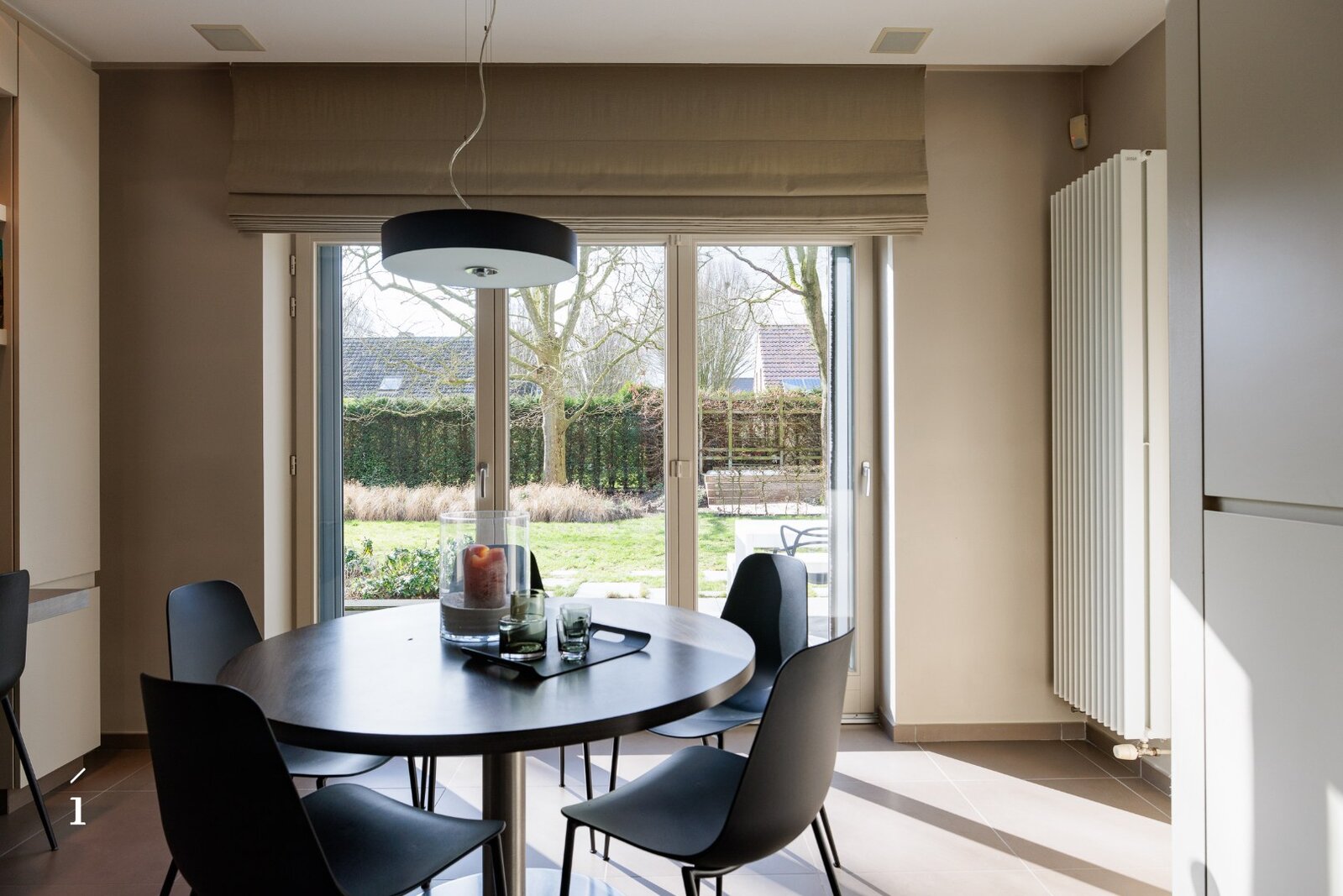 Op het gelijkvloers verwelkomt een aangename inkomhal met vestiaire en gastentoilet. De ruime en lichtrijke zithoek met open haard vormt samen met de eethoek een harmonieus geheel. De leefkeuken sluit hier perfect op aan en geeft rechtstreeks toegang tot het zonneterras, uitgerust met zonnetent. Aansluitend bevinden zich een praktische wasplaats/berging en een dubbele garage met automatische poorten.