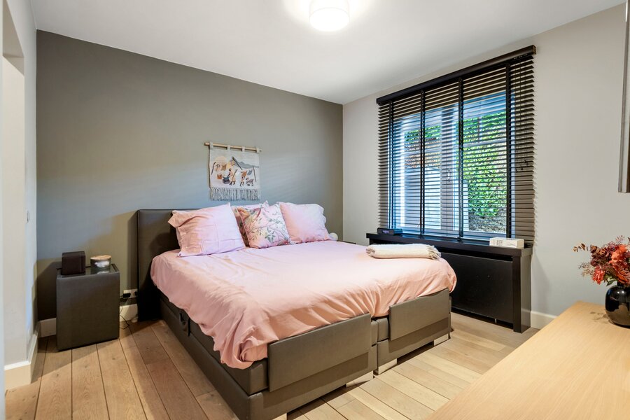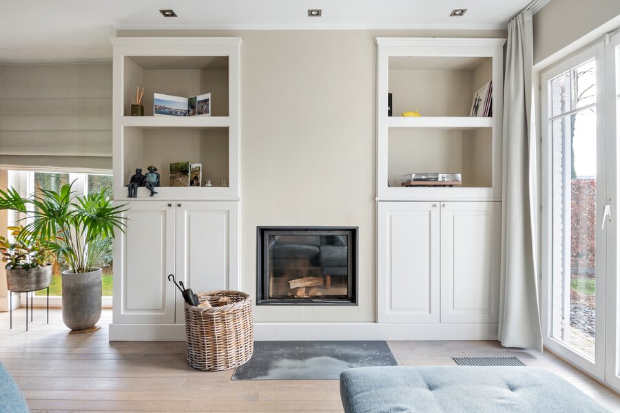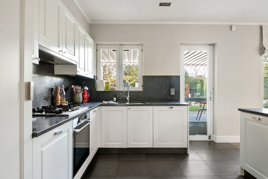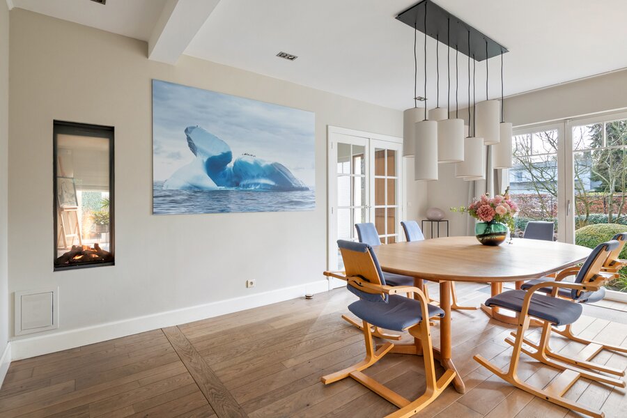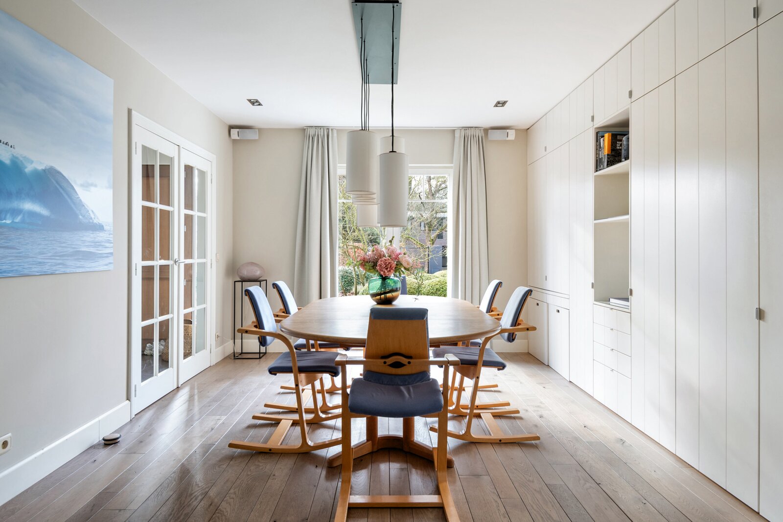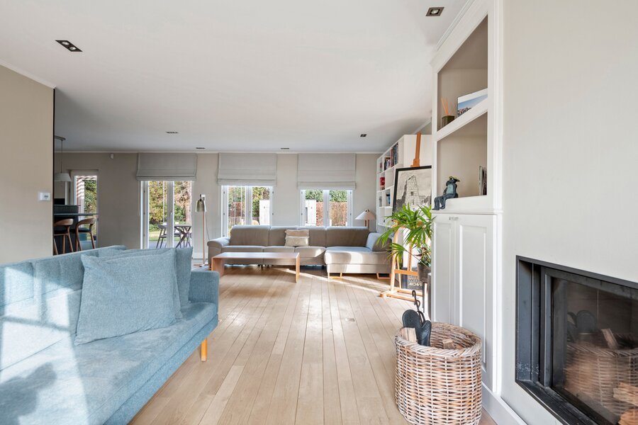 Via de inkomhal met gastentoilet komt u in de leefruimte met open haard en mooi zicht op de tuin. Aansluitend bevindt zich de luxueuze keuken met alle nodige toestellen en keukeneiland. Verder hebbe we de gezellige eetkamer met ingemaakte kasten en doorkijkgashaard naar de leefruimte. De volledig beglaasde wintertuin heeft een volledig zicht op de tuin en beschikt over warmtestralers, draaibare lamellen aan het plafond en een geluidsinstallatie.