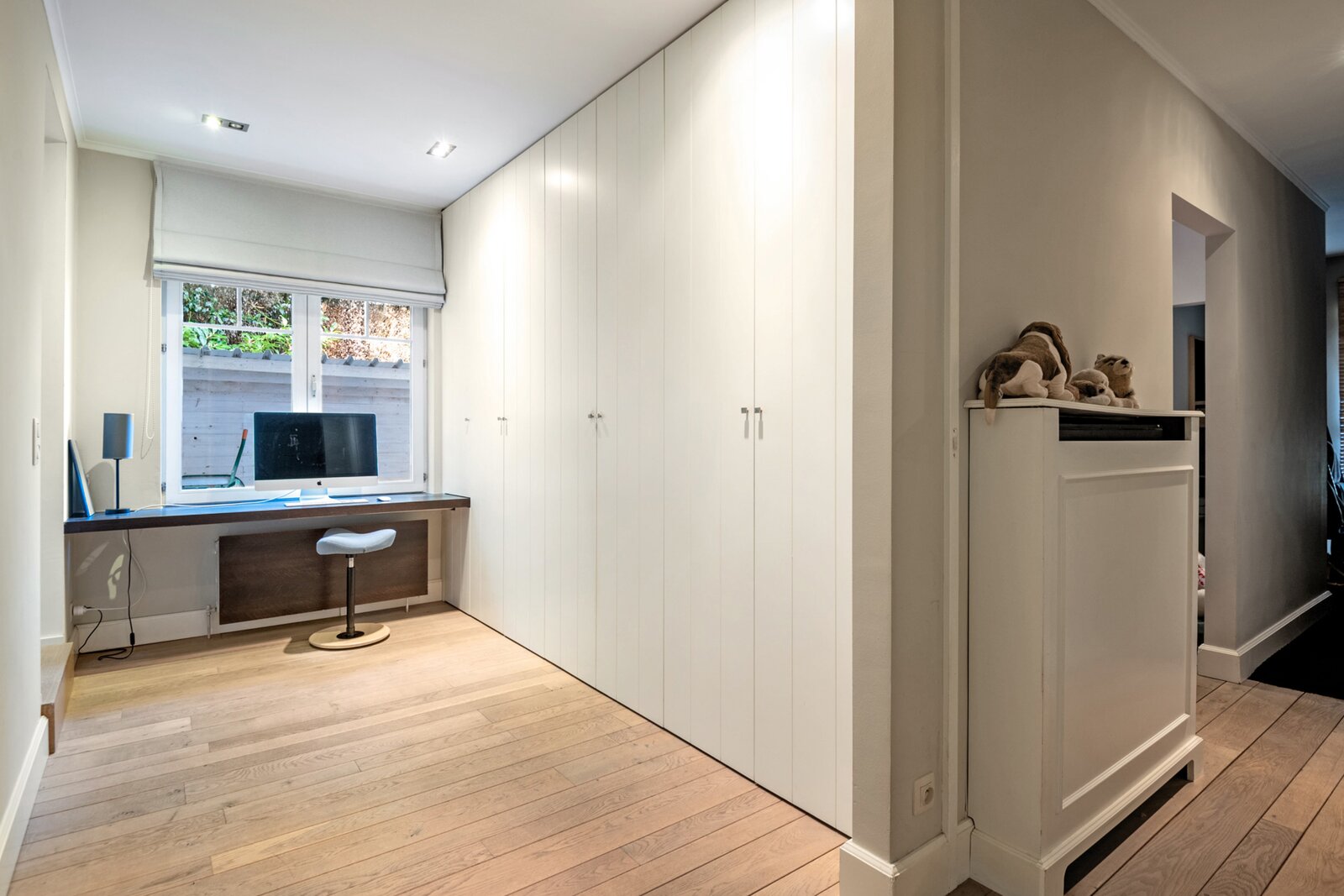 Op het gelijkvloers zijn verder een bureau, de master bedroom met dressing en een badkamer aanwezig, evenals toegang tot de dubbele garage met voorzieningen voor wasplaats.
