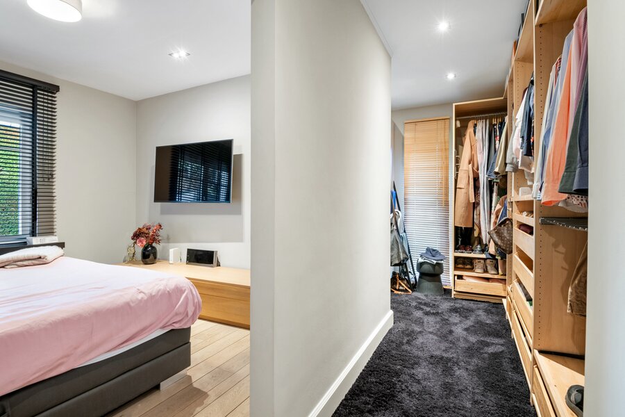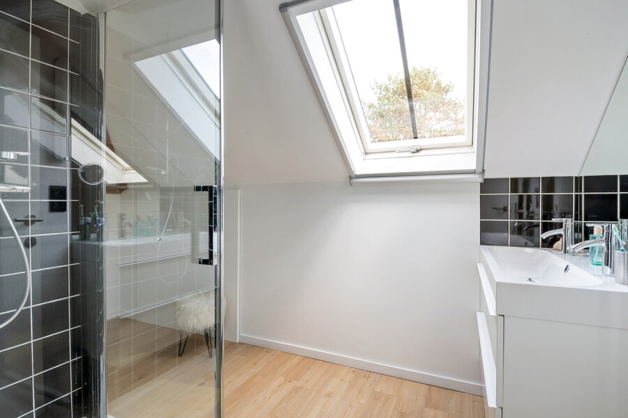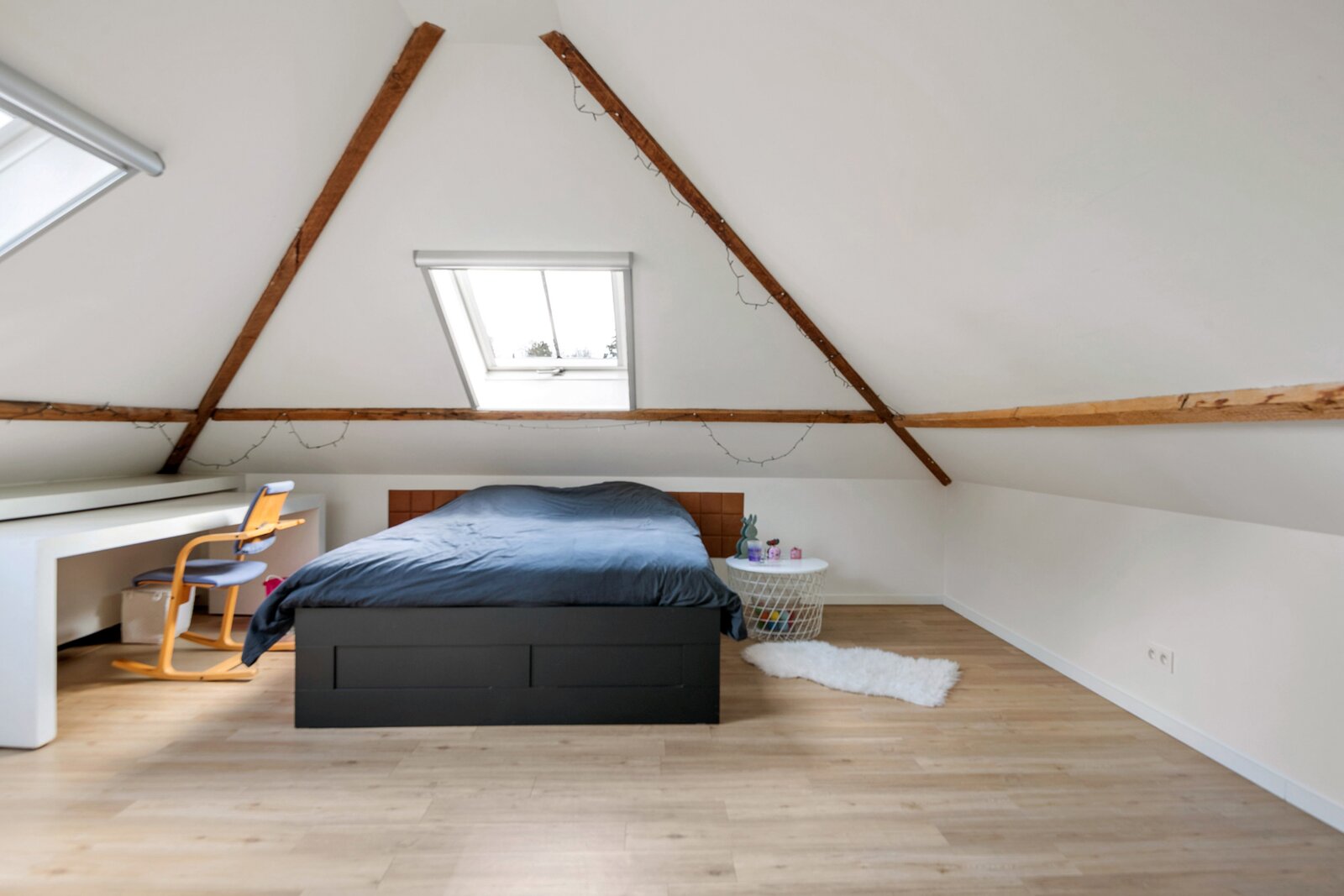 Op de eerste verdieping bevinden zich een ruime overloop die kan dienen als bibliotheek, tv- of speelkamer, twee slaapkamers en een tweede badkamer. Extra bergruimte is voorzien via een zolder boven de uitbouw