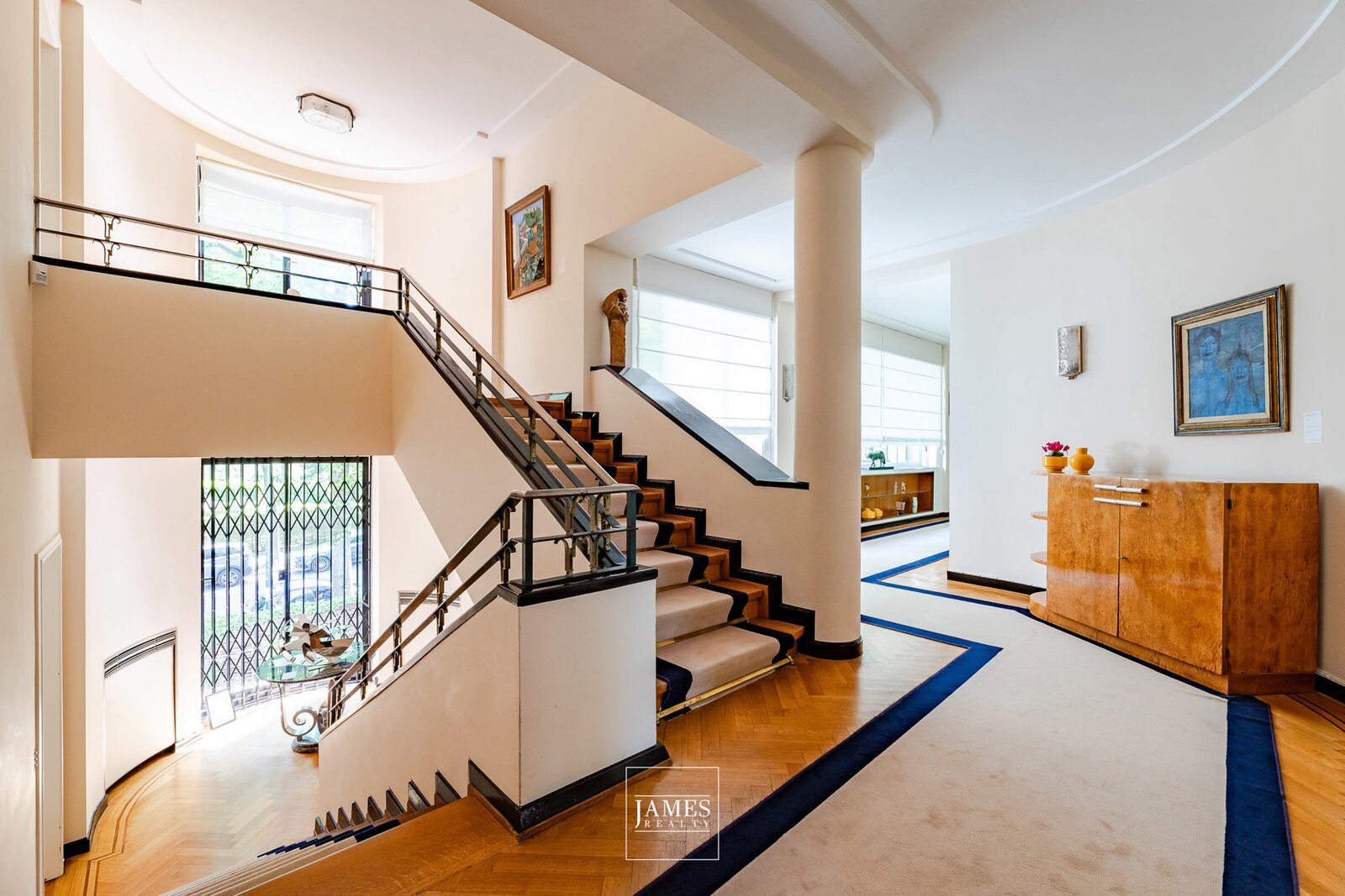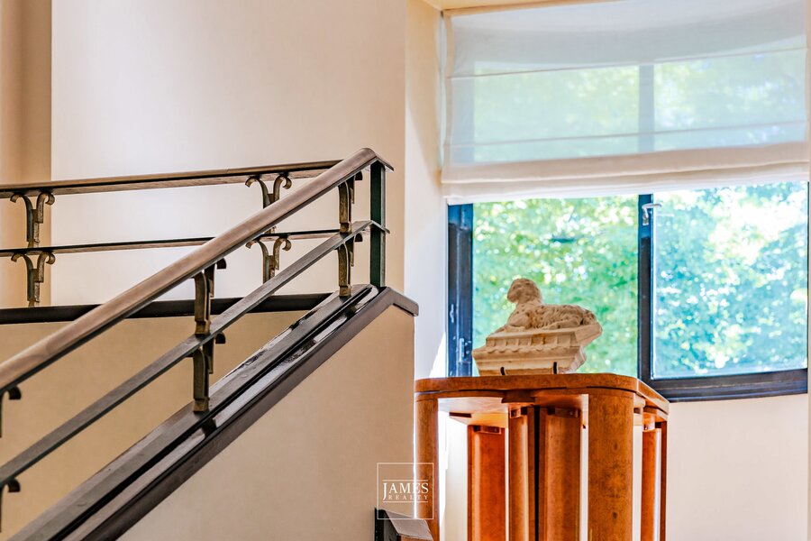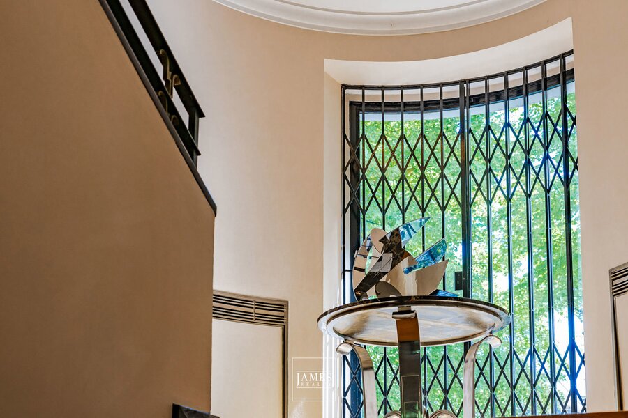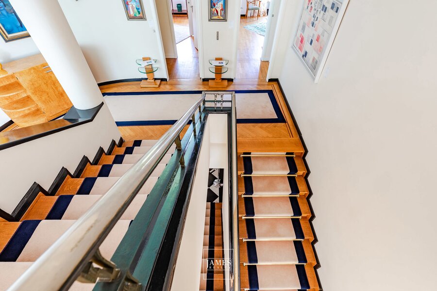All original features have been carefully conserved: custom-designed exotic wood floors, handcrafted fireplaces, wrought ironwork, original joinery, and a spectacular central staircase flooded with light.