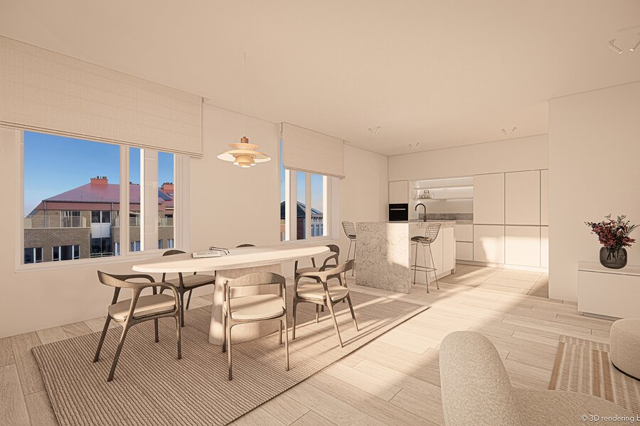 Het beslaat de volledige 3e verdieping en biedt een riante woonoppervlakte van 161m² plus een groot terras van 27m². De lift komt rechtstreeks toe in het appartement. De leefruimte baadt in het daglicht dankzij de grote raampartijen langs 3 zijden, en een grote schuifraam naar het west georiënteerde terras. Deze leefruimte biedt plaats aan een echte leefkeuken, volwaardige eetkamer en ruime zithoek. De masterbedroom heeft een ensuite badkamer en de (kinder/logeer)2 kamers delen een 2e badkamer. Ondergronds heeft u een grote kelderberging. Bij dit penthouse zijn tot slot 2 carports voorzien.