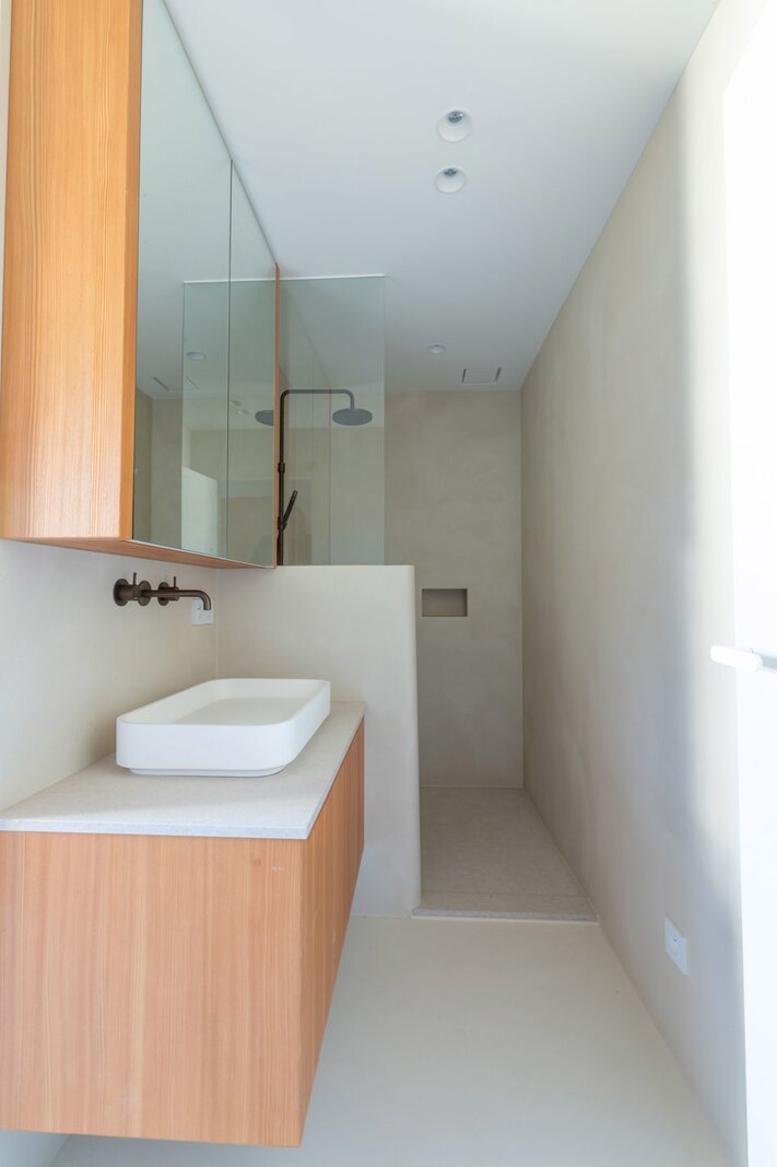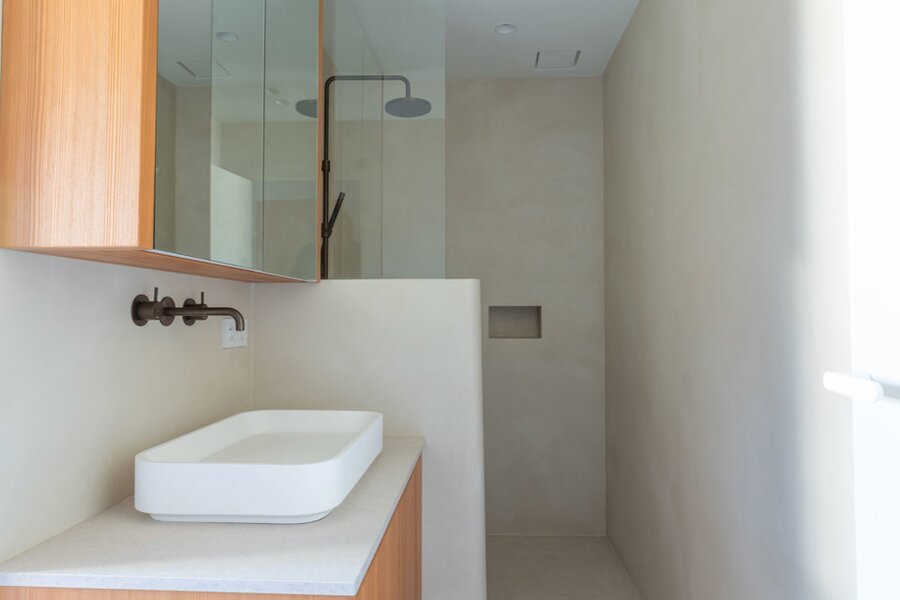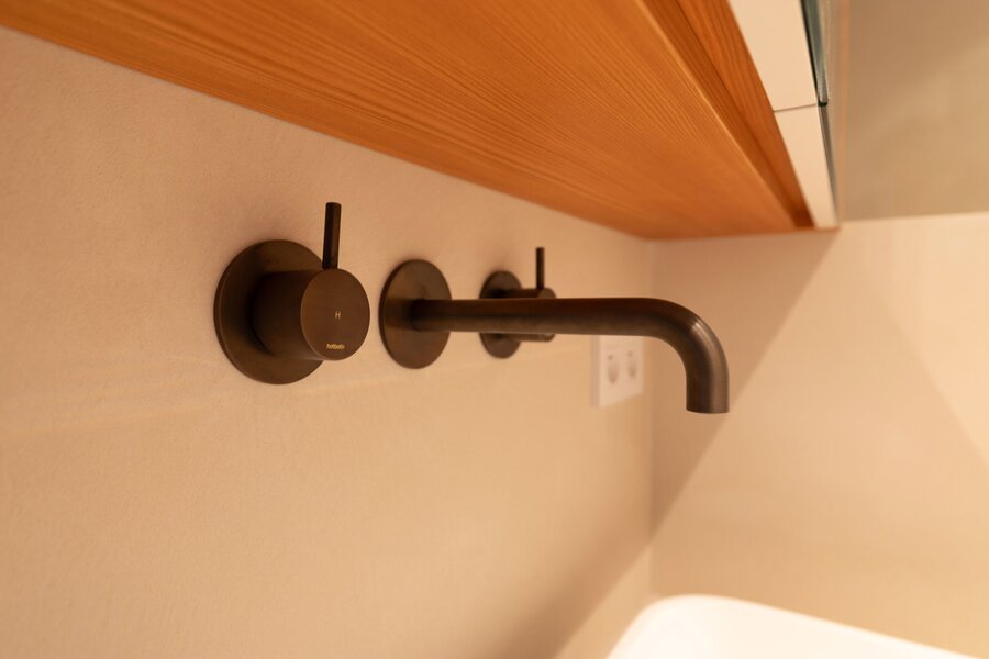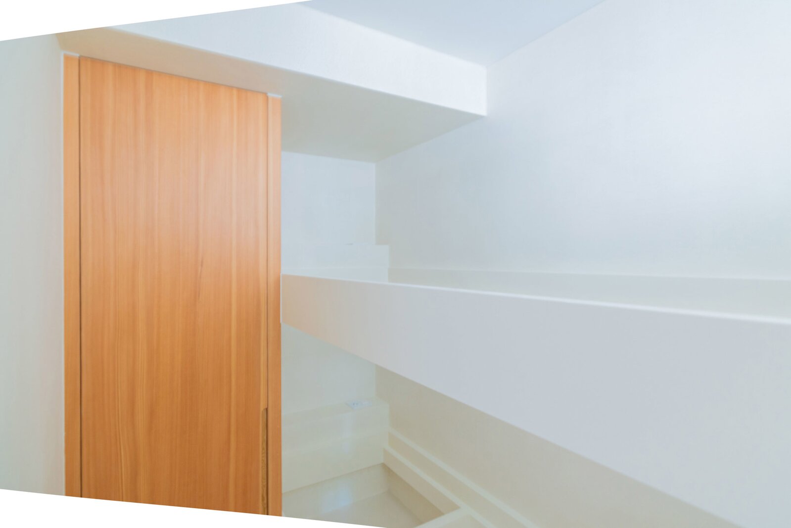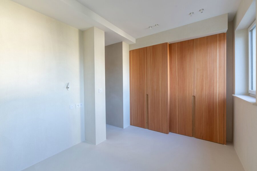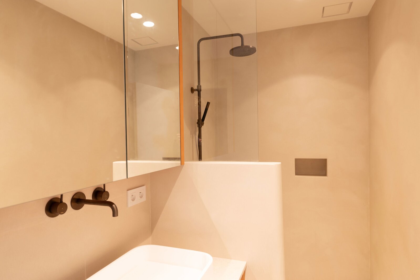 The renovated apartment features an entryway with a coat closet and a guest bathroom. The bright living room includes a dining area and access to the outdoor space. A fully equipped open kitchen with Miele appliances. Through the night hall, you reach the bathroom with a sink and walk-in shower (Mortex), the first bedroom/office space with built-in closets (Afromosia wood), and the second bedroom with bunk beds and built-in closets.