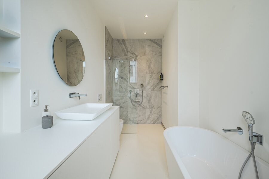 The penthouse includes an entrance hall with a custom-made built‑in unit serving as a cloakroom and storage space, two bedrooms — one of which has its own covered terrace — a full bathroom with bathtub, shower, toilet, washbasin, and a separate toilet.