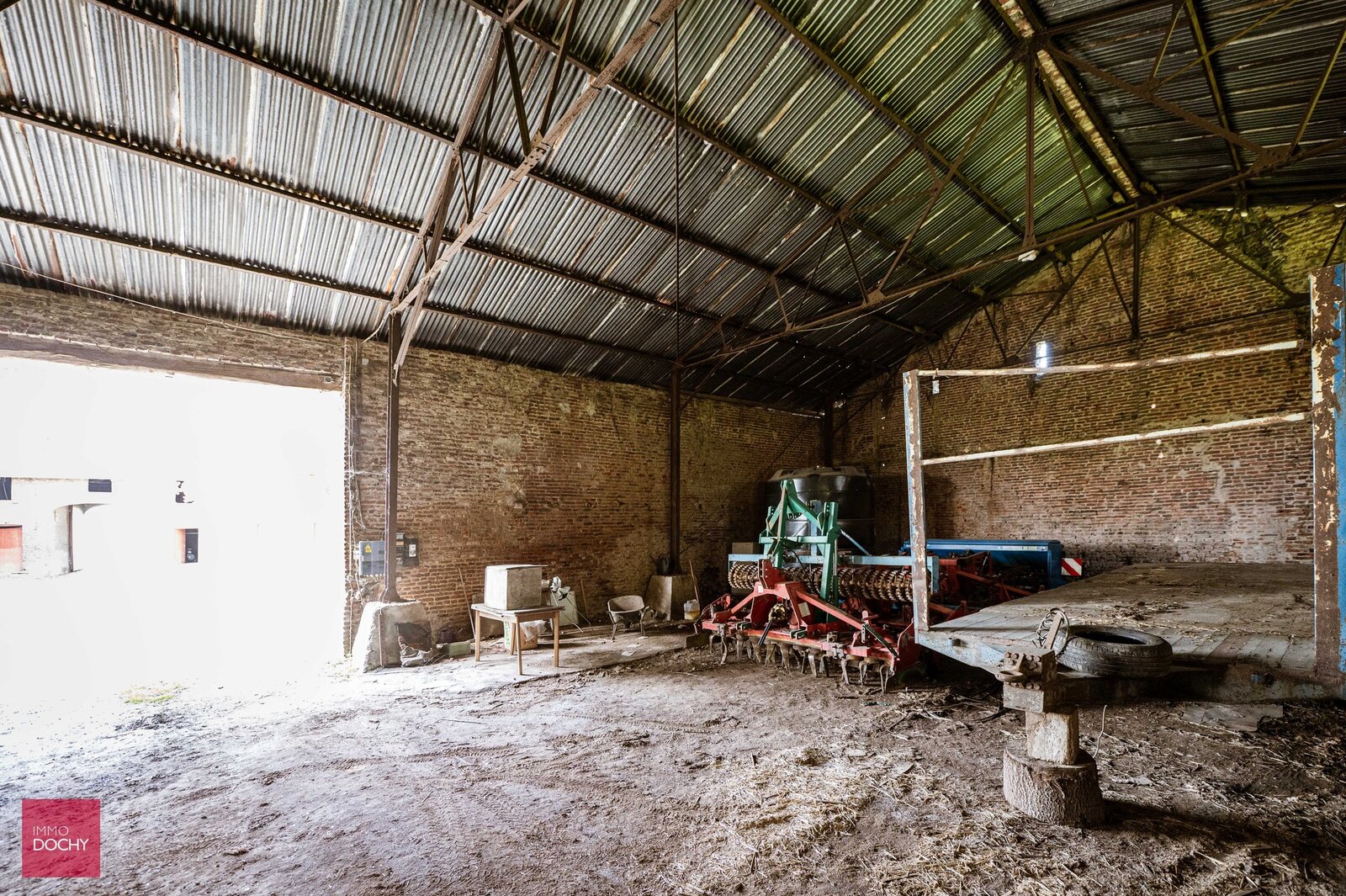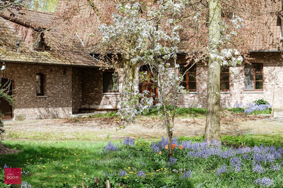 Inkomhal, ruime keuken, wasplaats, bureel, 3 slaapkamers, badkamer, kelders (+ kruipkelder), grote zolder, 2 garages, poortgebouw, conciërgewoning (woonkamer, kitchenette, slaapkamer en badkamer), grote schuur (ca 450m²)), berging, binnenkoer met tuin en weiden.
