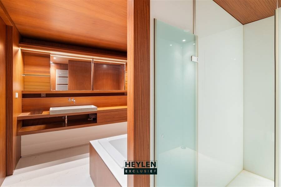 Het slaapgedeelte omvat: royale masterbedroom met ensuite dressing, luxueuze badkamer met bad én douche, tweede slaapkamer met ingemaakte kasten en eigen badkamer met inloopdouche, derde slaapkamer achteraan met toegang tot dressing