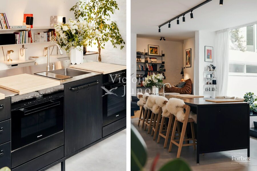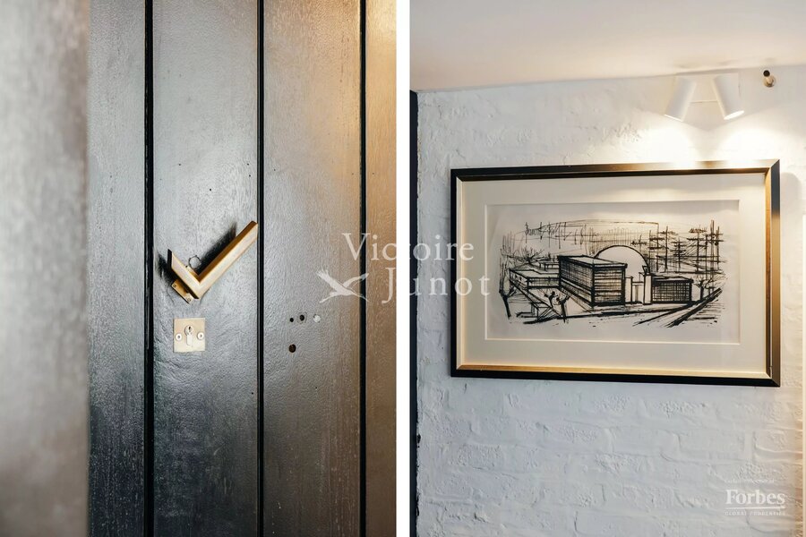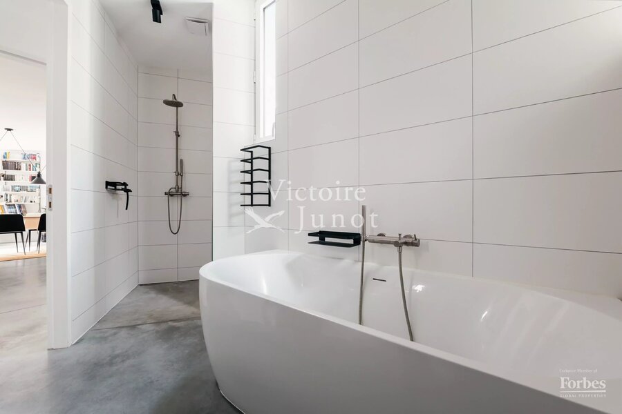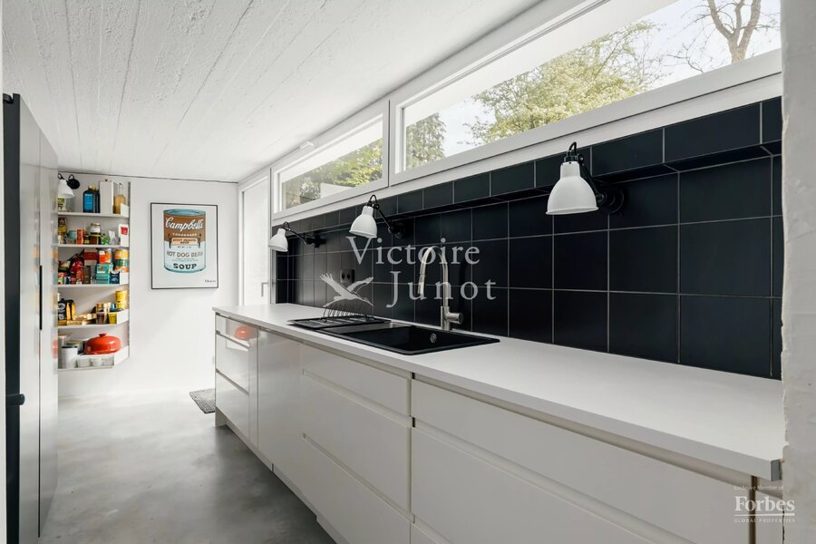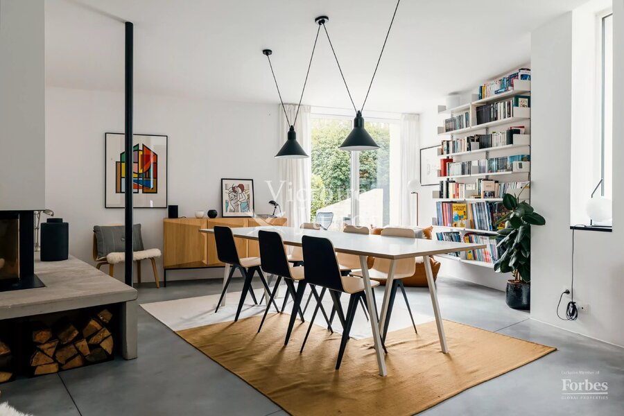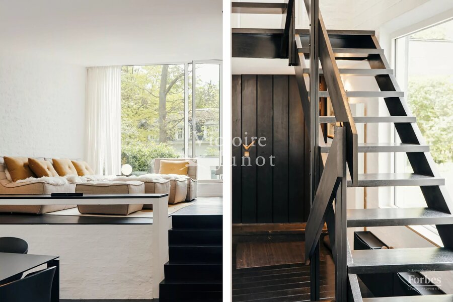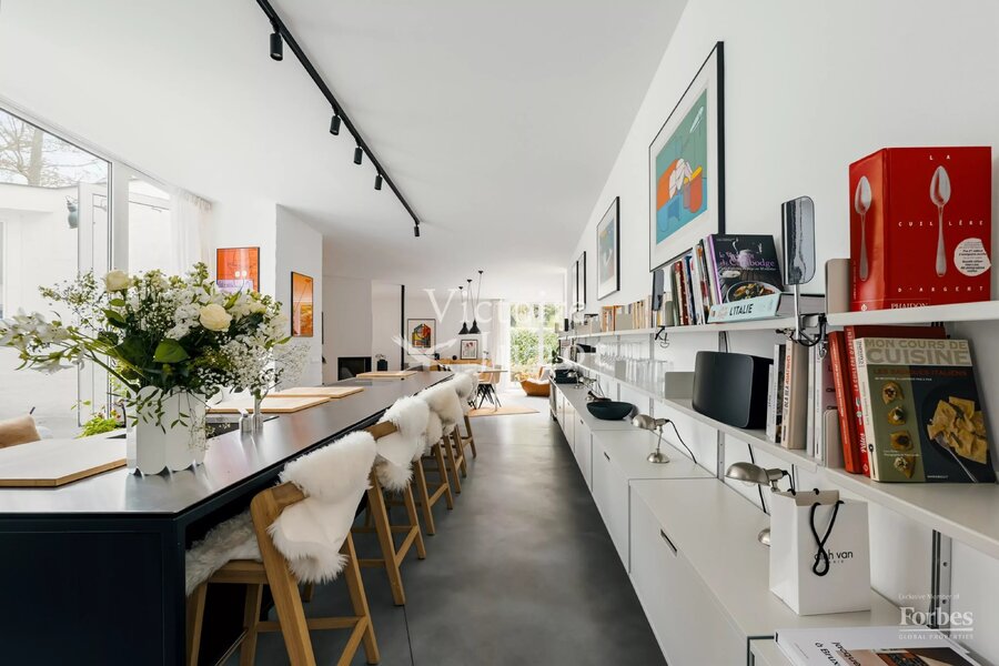 Spanning approx. 290 sqm (gross) on a 557 sqm plot, it underwent a complete renovation in 2022, scrupulously respecting the original design while integrating modern comfort standards: new boiler, high-performance insulation, underfloor heating, new window frames, compliant electricity, custom-made cabinetry and worktops, polished concrete floors, wooden parquet, and a VIPP kitchen.