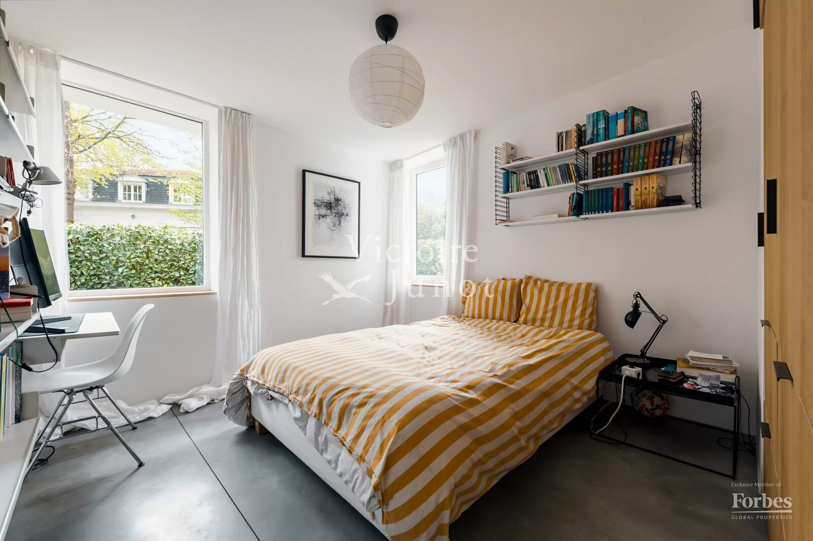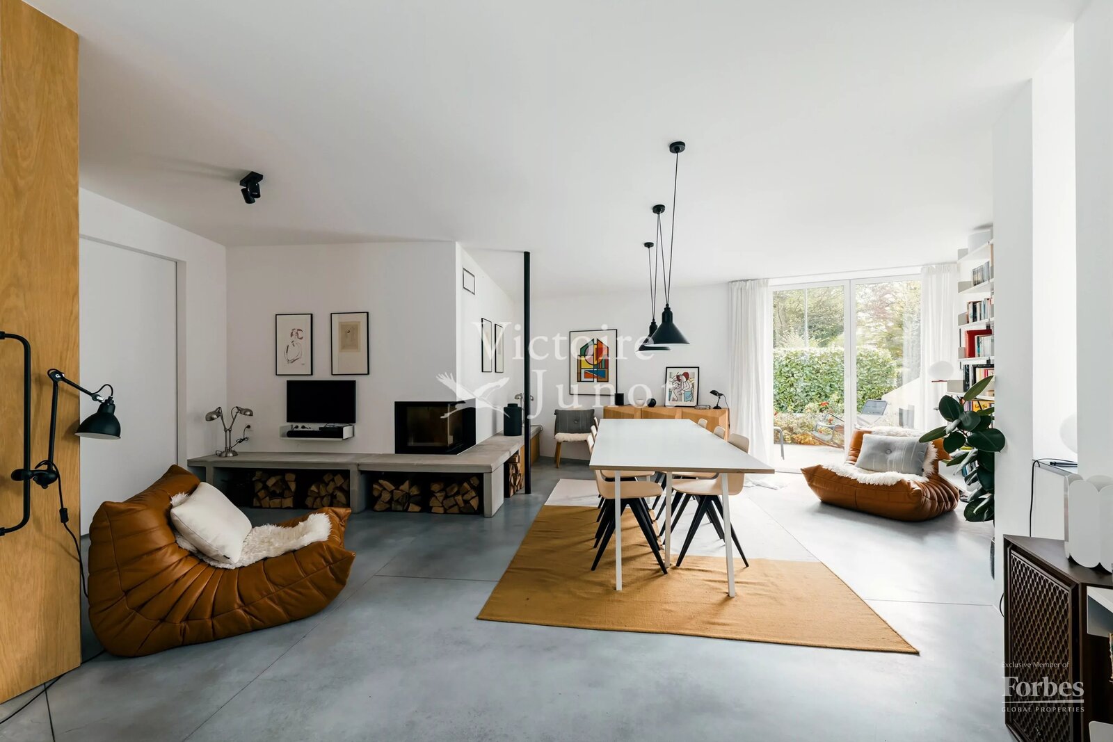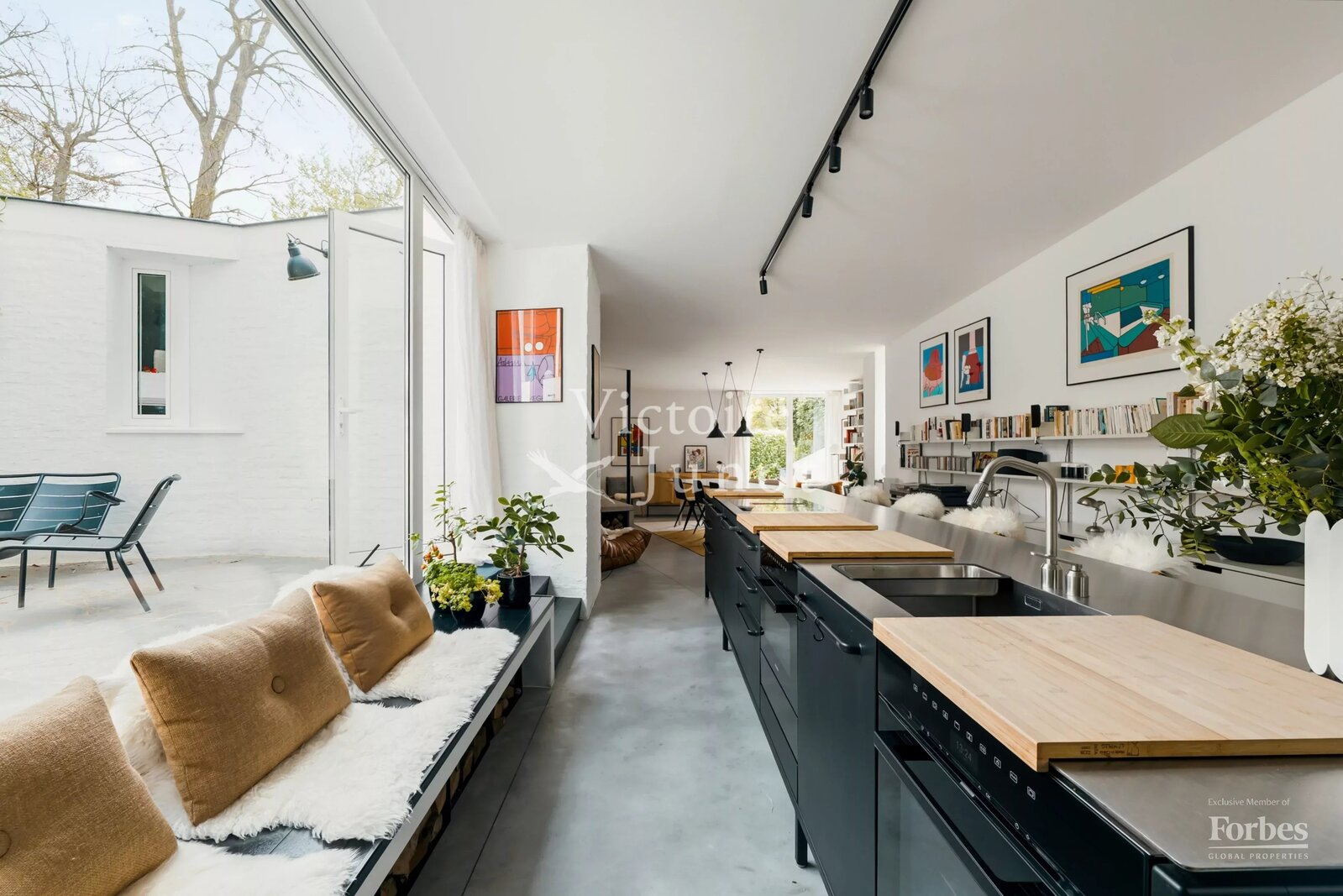 Spanning approx. 290 sqm (gross) on a 557 sqm plot, it underwent a complete renovation in 2022, scrupulously respecting the original design while integrating modern comfort standards: new boiler, high-performance insulation, underfloor heating, new window frames, compliant electricity, custom-made cabinetry and worktops, polished concrete floors, wooden parquet, and a VIPP kitchen.
