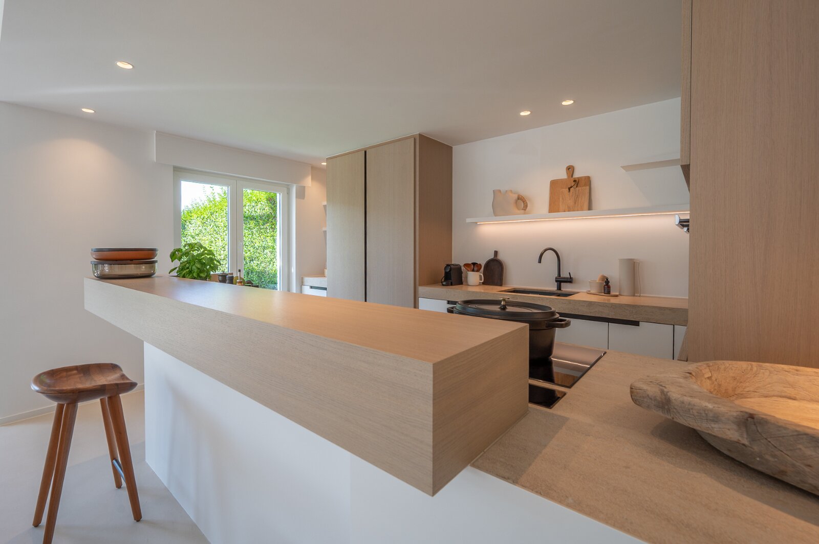 The entrance hall, equipped with a practical storage room and a separate guest toilet, provides access to the bright dining and living area. Large windows create an open and inviting atmosphere, with direct access to the optimally oriented garden with sunny terrace, a wonderful place to enjoy in peace and quiet. The fully equipped open kitchen blends seamlessly into the living area and offers every comfort for everyday use.