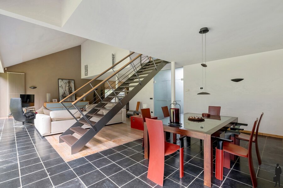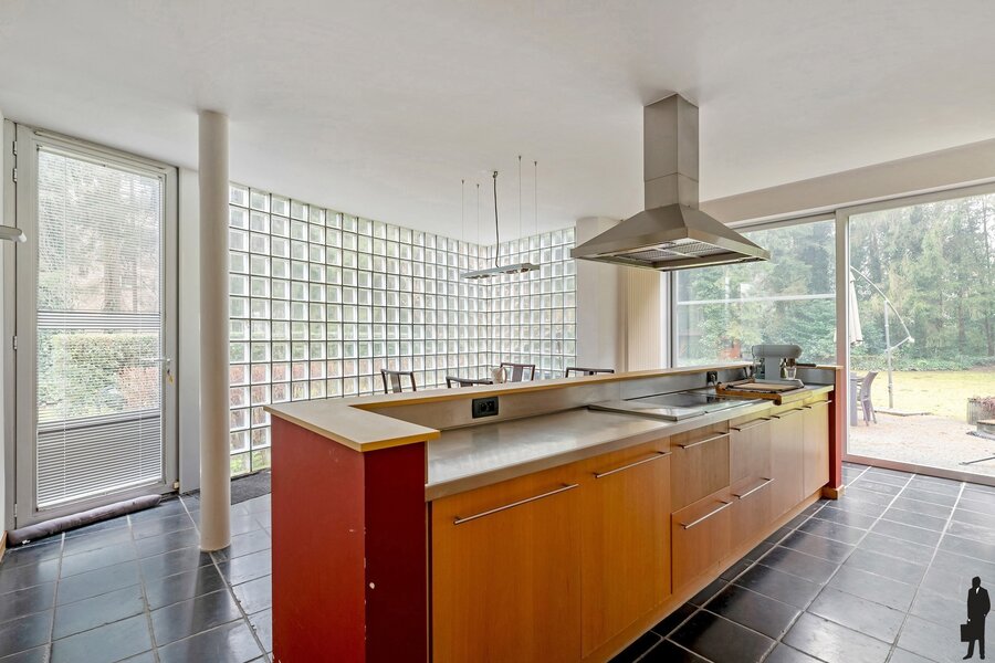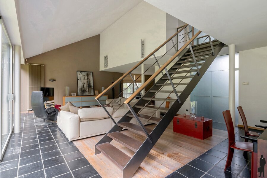 -Leefruimte deels op parket en deels op natuursteen met veel raampartijen opgedeeld in een gezellig salon (47m²) en eetkamer en bureelruimte (15,5 m²)