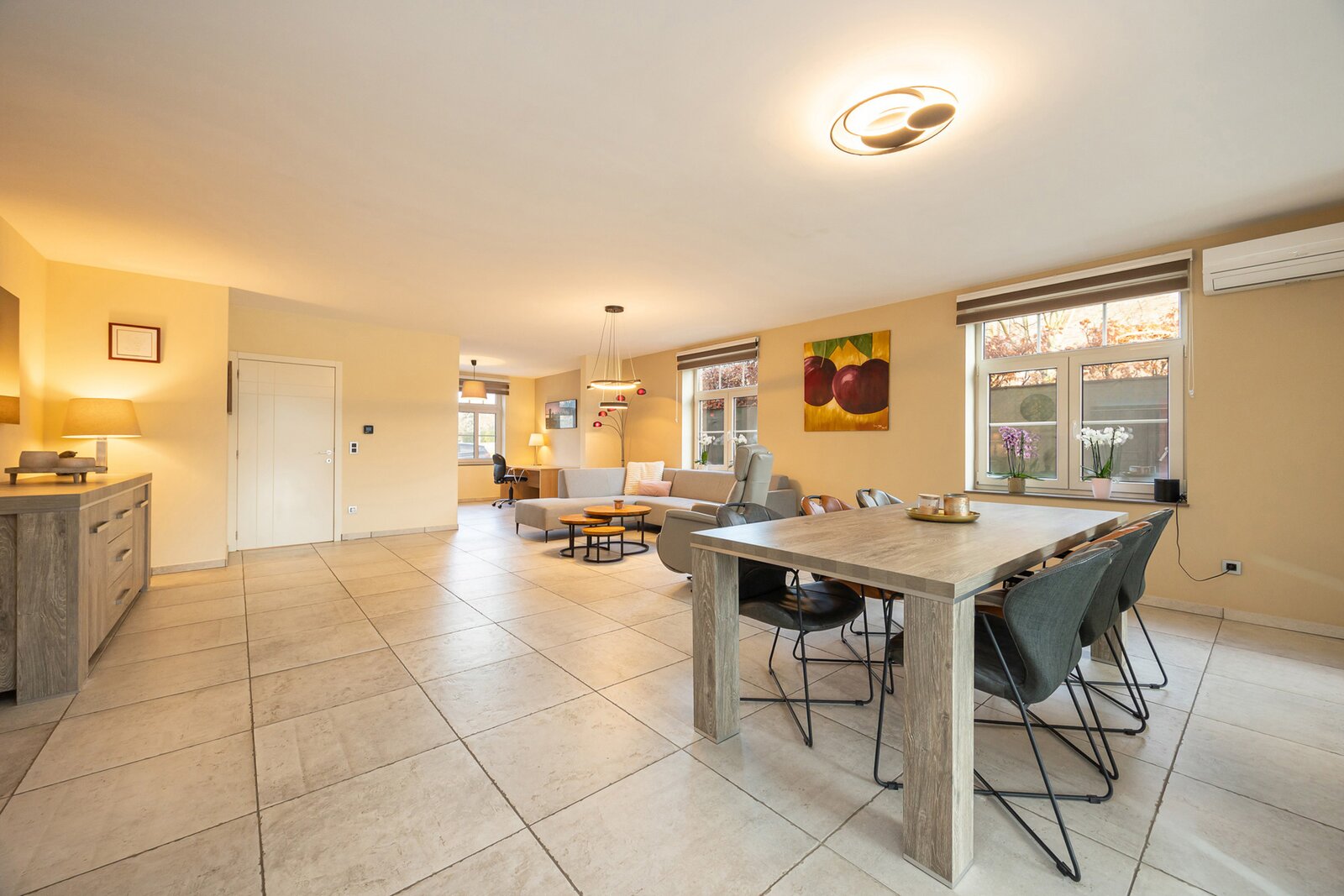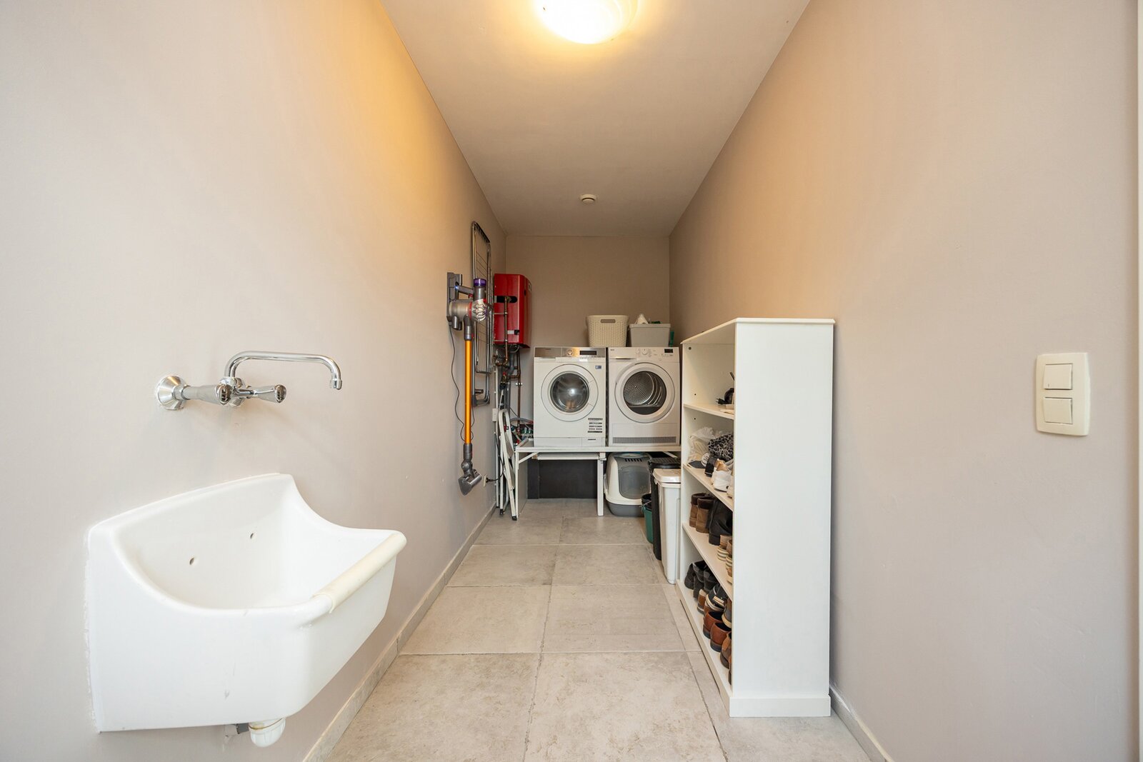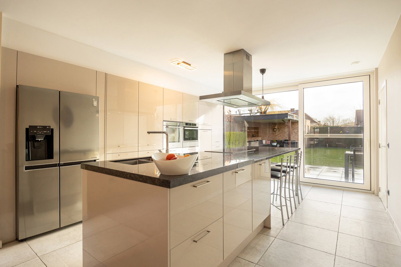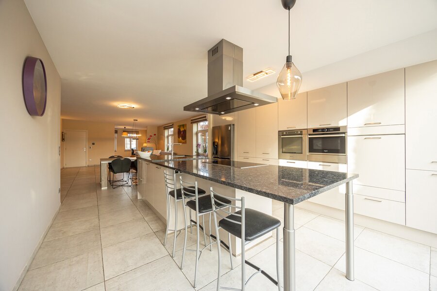 Via de inkomhal met gastentoilet betreedt u de open en lichtrijke leefruimte, opgedeeld in een bureauruimte, gezellige zithoek en eetplaats. De ruime open keuken vormt het hart van de woning en geniet dankzij het grote schuifraam van een prachtig zicht op de tuin. Ze is volledig uitgerust met een Amerikaanse koelkast, oven, combi-oven, inductiekookplaat, dampkap, vaatwasser en beschikt over ruime opbergmogelijkheden. Aansluitend bevindt zich een praktische, koele berging met aansluitingen voor wasmachine en droogkast en een rechtstreekse toegang naar buiten.