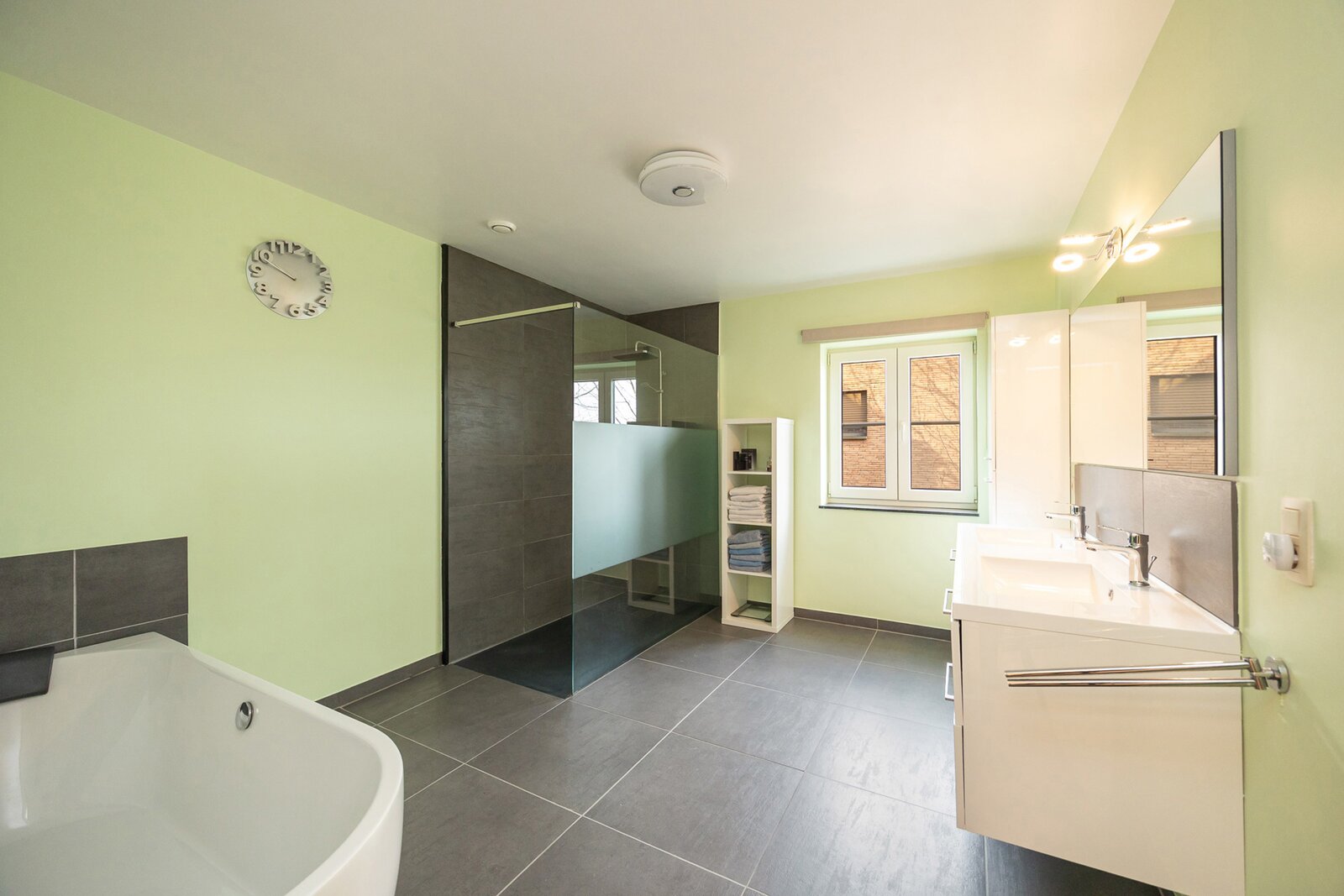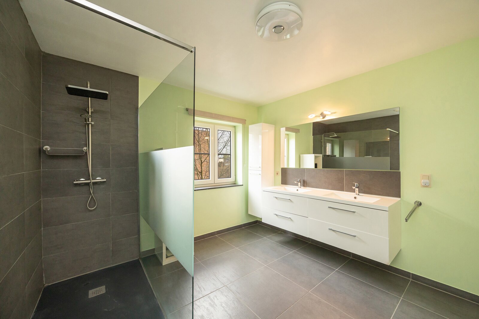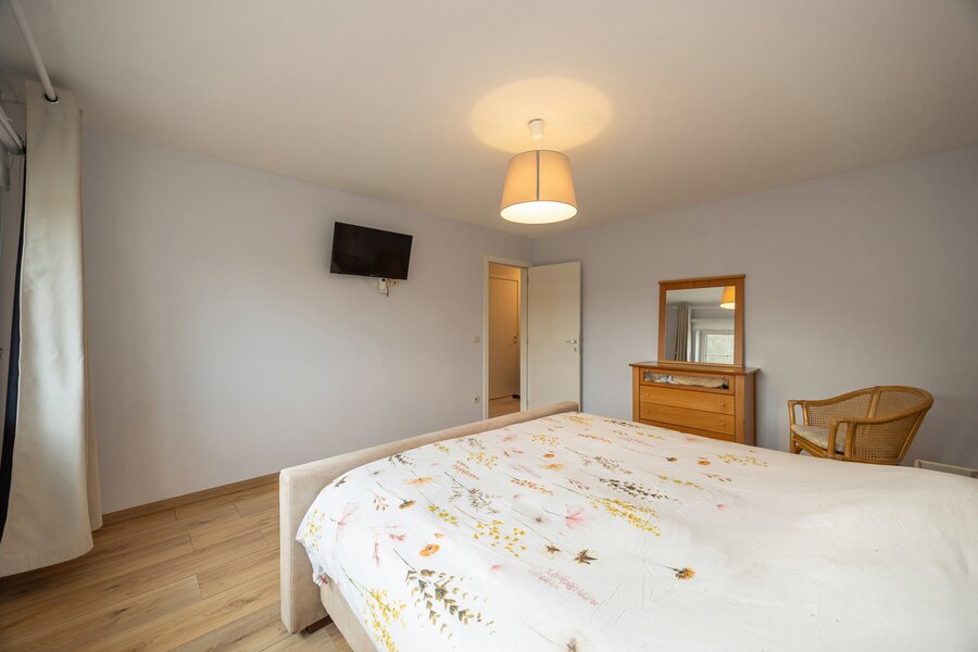 Op de verdieping geeft de nachthal toegang tot twee ruime slaapkamers en een derde, kleinere kamer. De volledig ingerichte badkamer is voorzien van een ligbad, een inloopdouche met verwarmde douchewand en een dubbele wastafel in meubel. Het nachttoilet bevindt zich apart op de gang. Op de tweede verdieping bevindt zich de royale master-bedroom, waar alle aansluitingen reeds voorzien zijn om desgewenst een tweede badkamer te installeren. De hoge plafonds zorgen hier voor een extra gevoel van ruimte en licht.