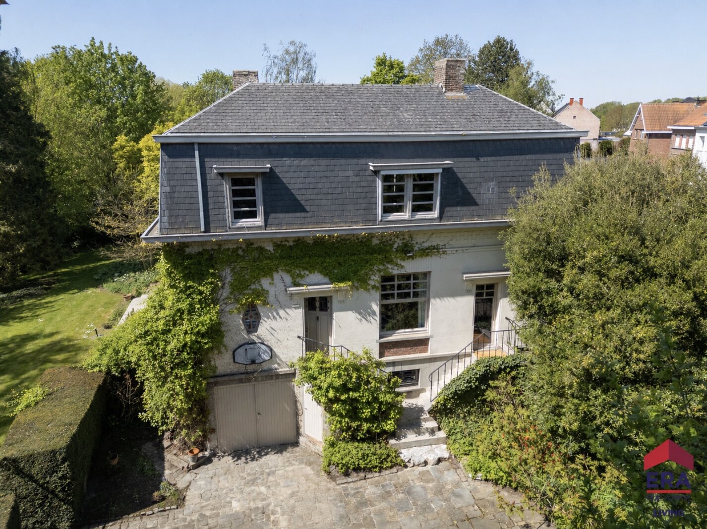 Outside, a charming driveway leads to a cosy inner courtyard, providing access to a large garage. and a full basement, which offers plenty of storage space, as well as scope for a hobby room or additional conversion.