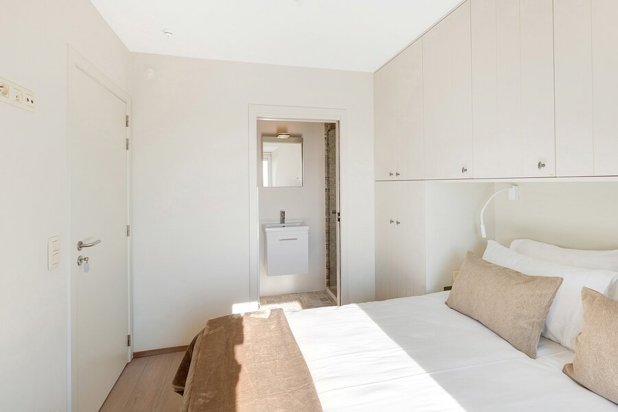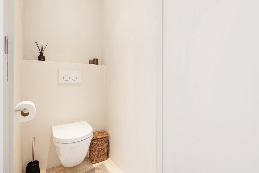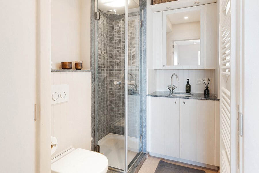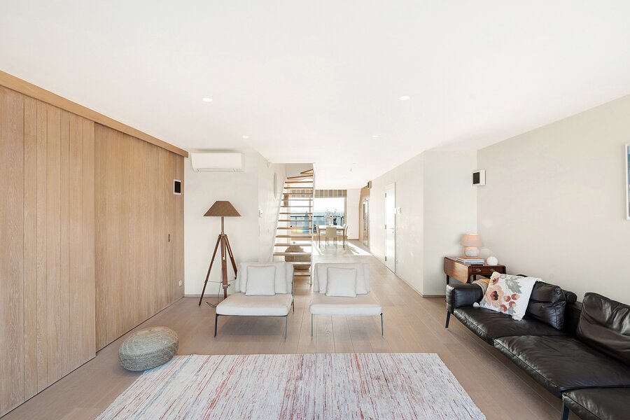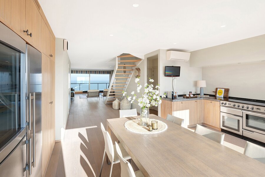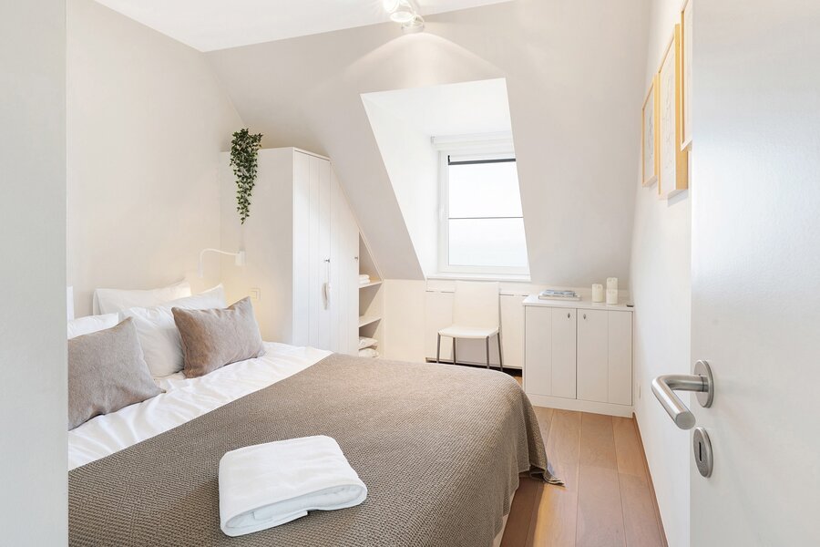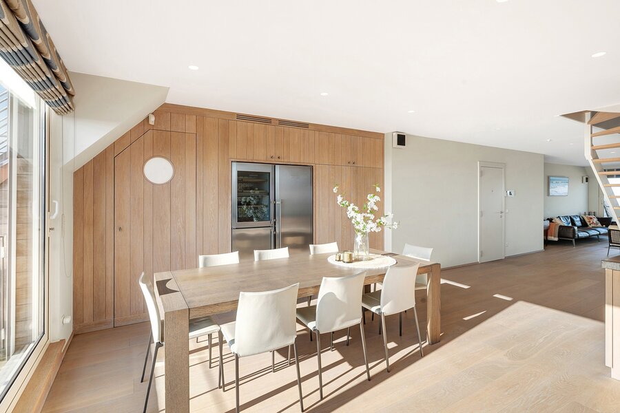 From the generous living area with wide windows and large built-in cabinets in solid oak, you enjoy panoramic sea views. Spacious terraces at both the front and rear offer ample space for a dining table and/or sun loungers. Adjacent is the fully installed kitchen in solid oak with a natural stone worktop. The kitchen is equipped with all classic Miele appliances including a steam oven, and also features a wine cooler, an American-style refrigerator, a separate freezer and an impressive stainless steel cooking range, offering every comfort for enjoyable dinners with family and friends. The living area features parquet flooring and an integrated desk corner. The separate entrance hall includes a double cloakroom cabinet, as well as a guest toilet and a spacious storage room with connections for a washing machine and dryer.