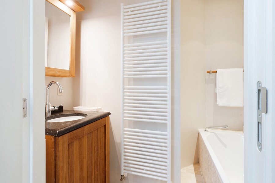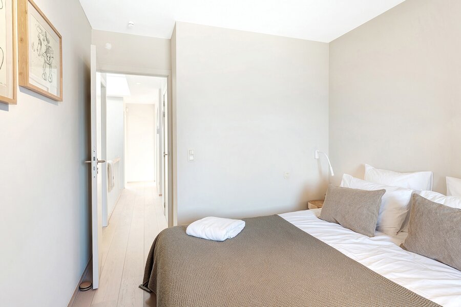 On the upper floor, a night hall leads to four bedrooms and three bathrooms, all finished to a high standard and fitted with custom-made wardrobes, making the apartment perfectly suited for a large family or for those who enjoy hosting guests.