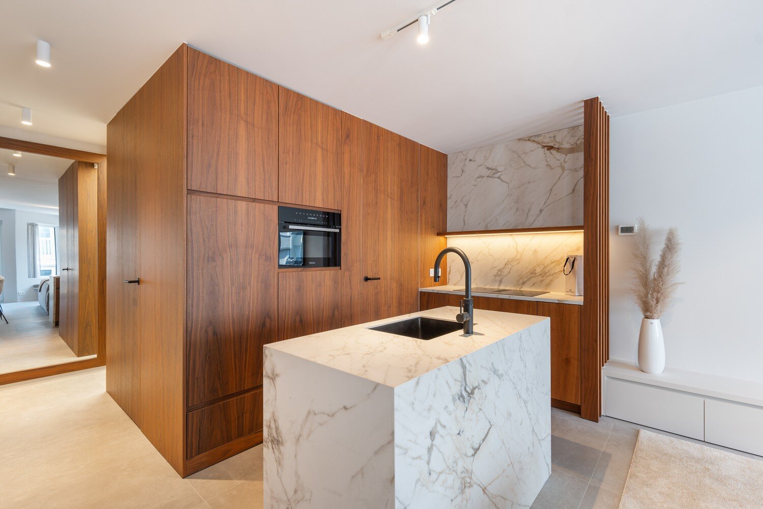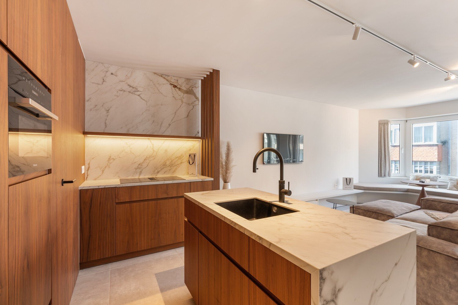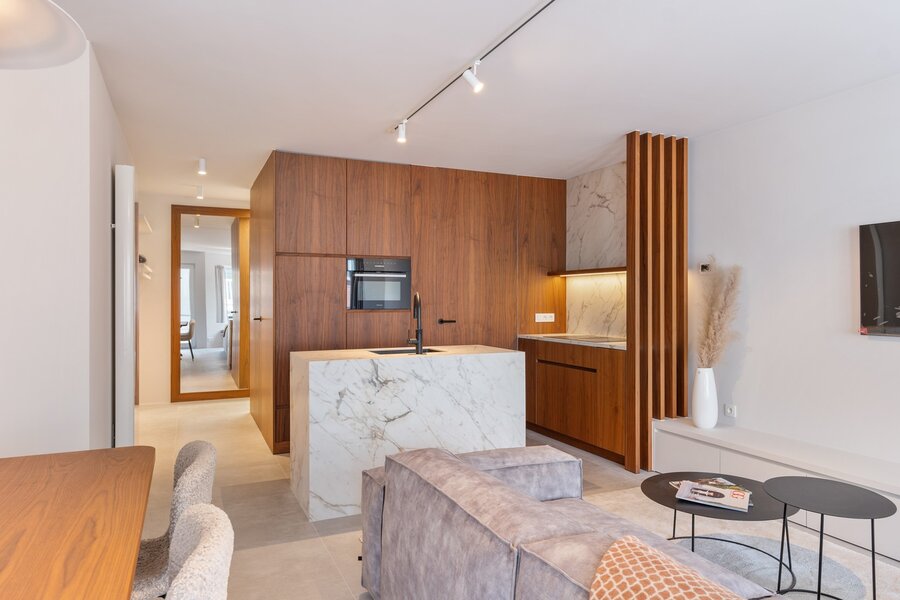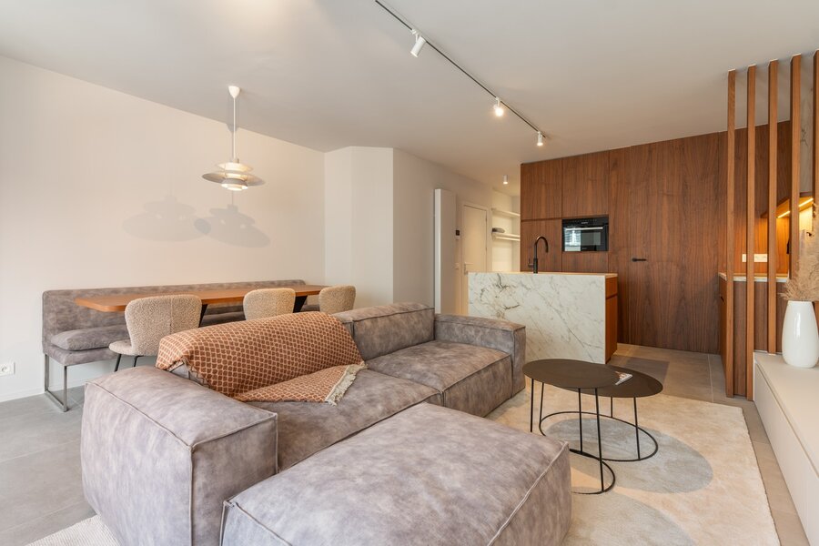 De inkomhal, voorzien van vestiaire en gastentoilet, leidt naar de lichtrijke leefruimte met toegang tot een zonnig terras aan de voorzijde. De zithoek geniet van een open zicht op het Driehoeksplein en een discreet zeezicht. De open keuken is volledig uitgerust met kwalitatieve toestellen en sluit harmonieus aan op het leefgedeelte. Aansluitend bevindt zich een praktische berging met aansluiting voor wasmachine.