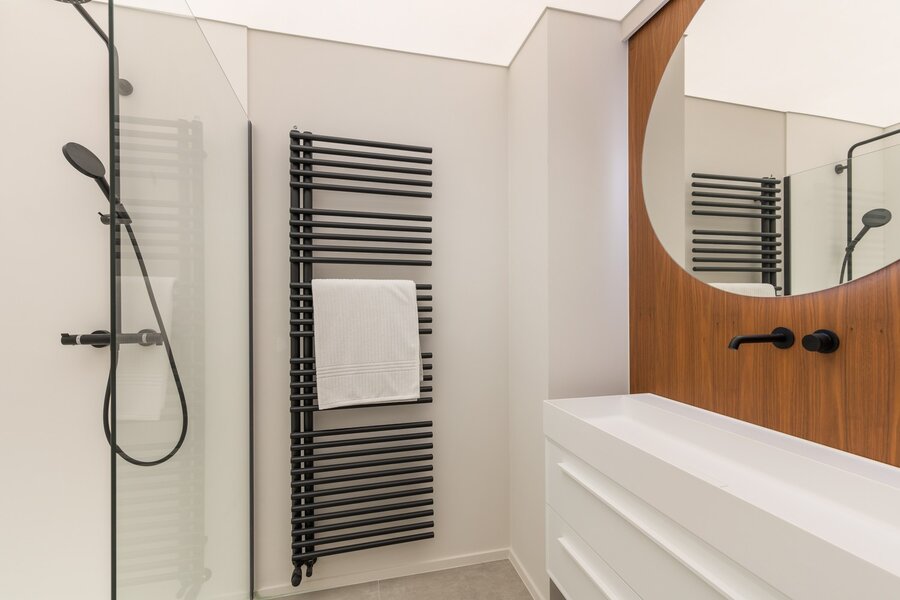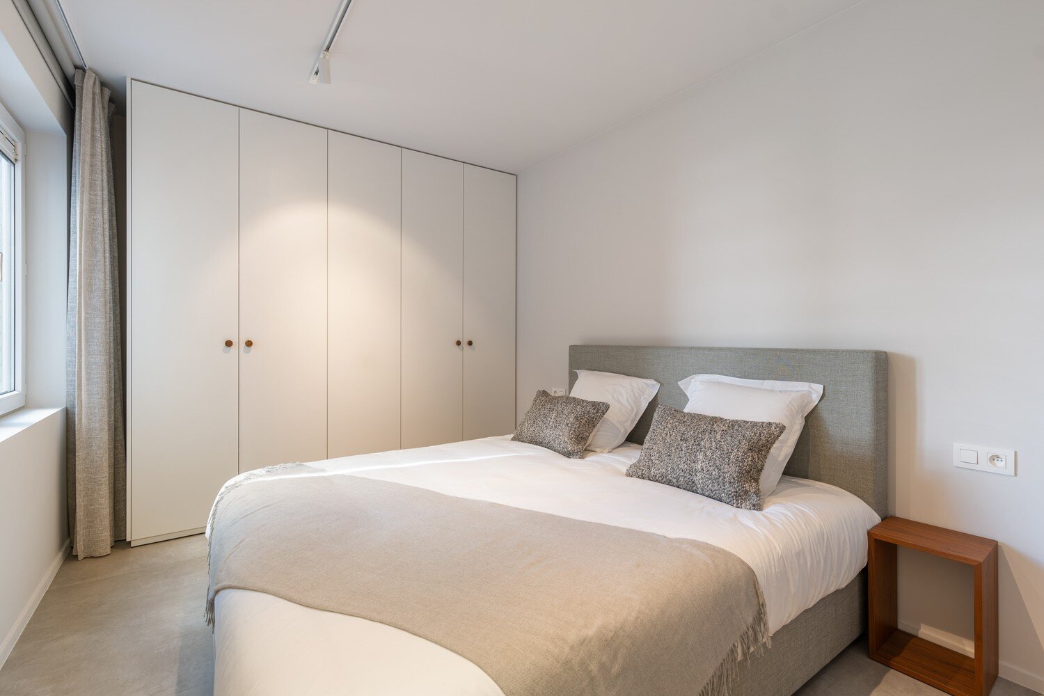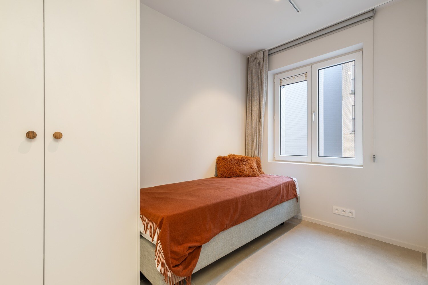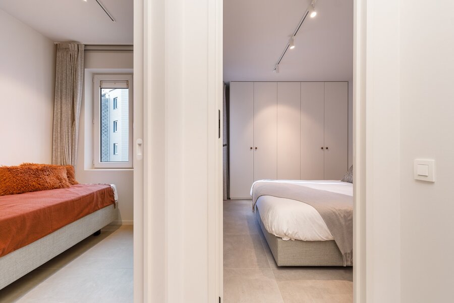 Het appartement beschikt over twee volwaardige slaapkamers, beide voorzien van ingemaakte kasten. De douchekamer met inloopdouche en wastafel werd modern en functioneel ingericht.