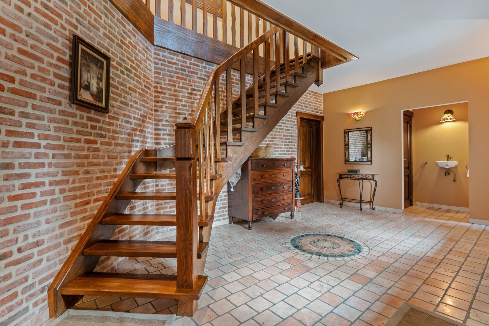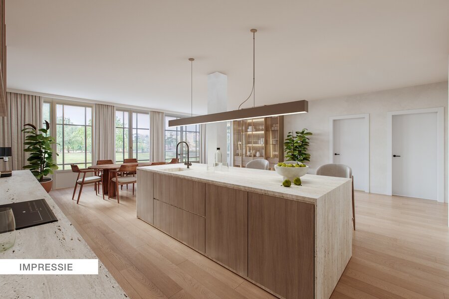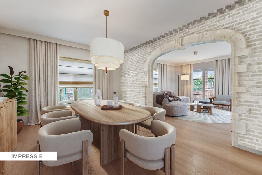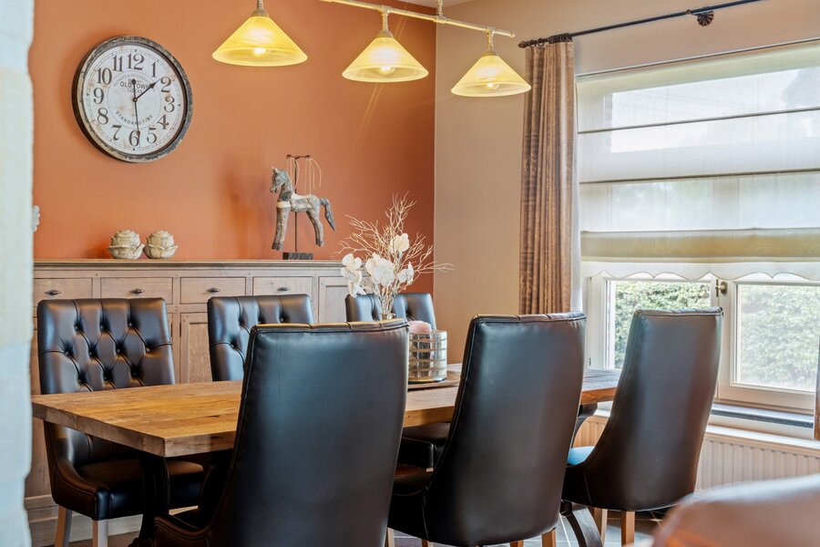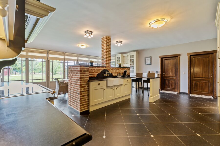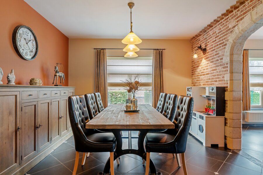 We betreden het pand via een ruime inkomhal met apart gastentoilet. Centraal treffen we de ruime leef-eetruimte met als kloppend hart de op maat gemaakte uiterst degelijke en stijlvolle keuken aan.