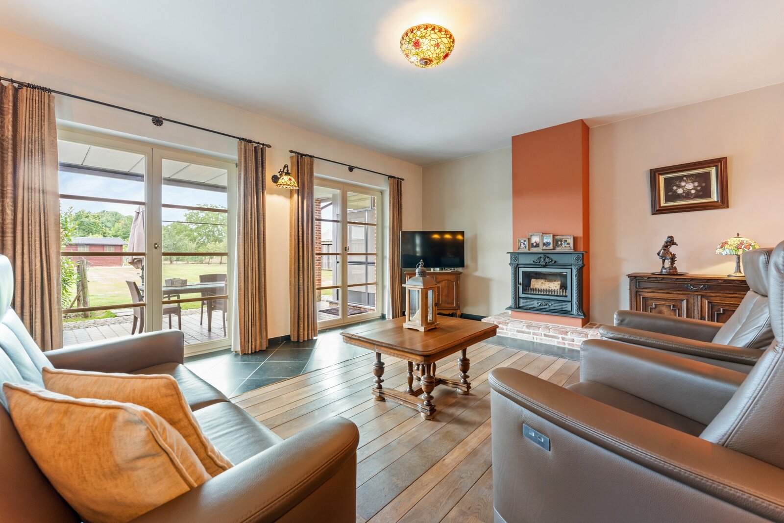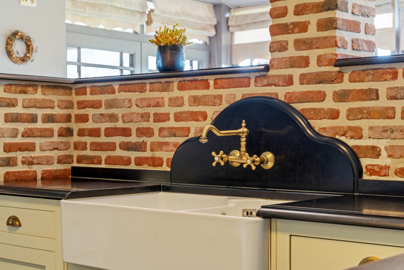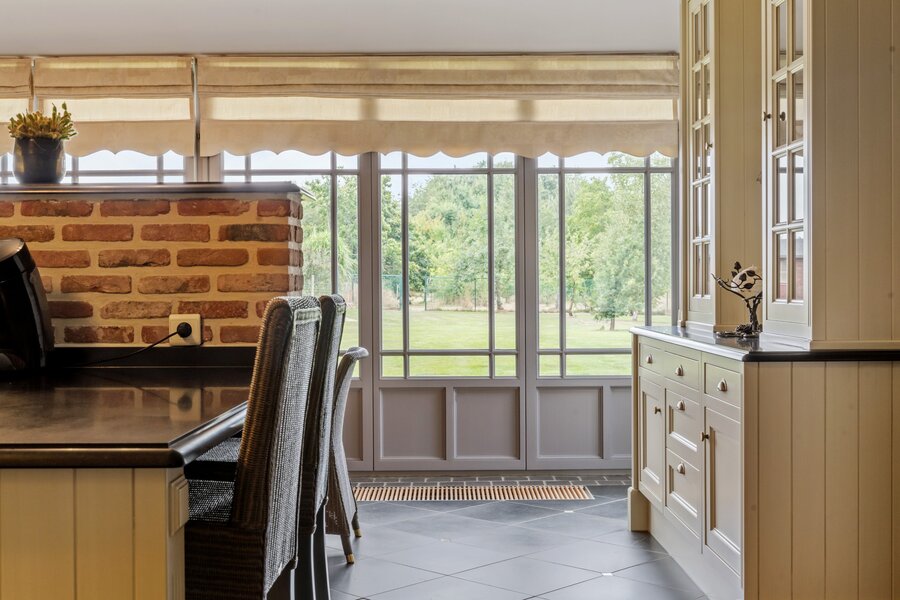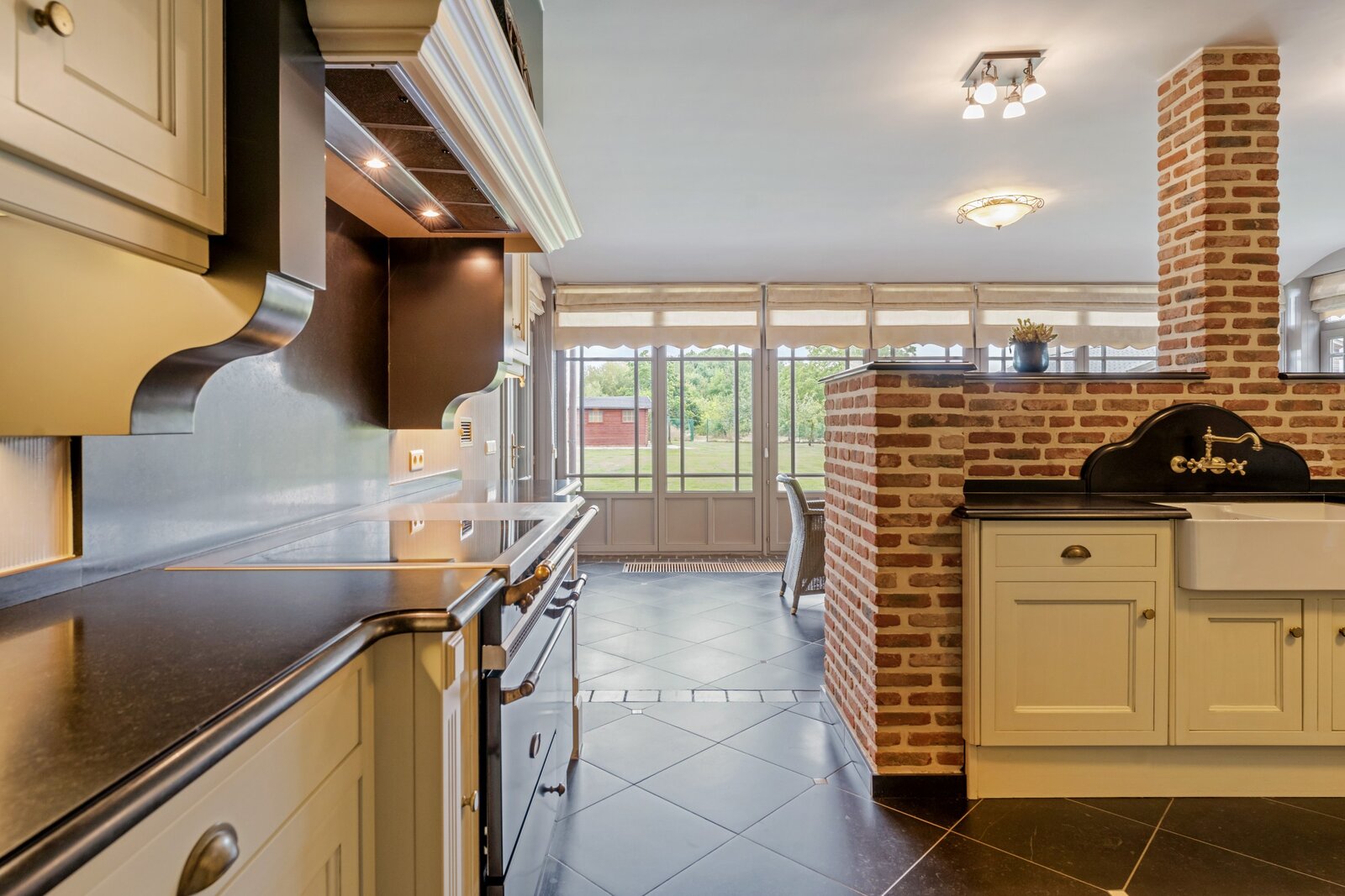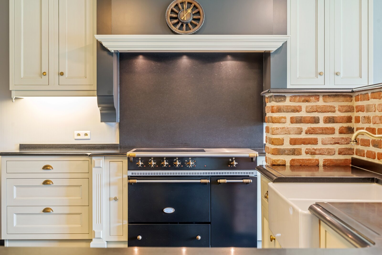 Het prachtige zwarte Lacanche vuur, porseleinen dubbele spoelbak met Engels kraanwerk, eetruimte met weids zicht, details maken dit plaatje af.