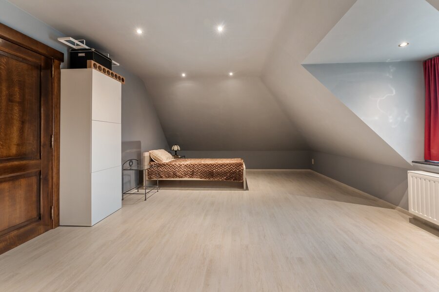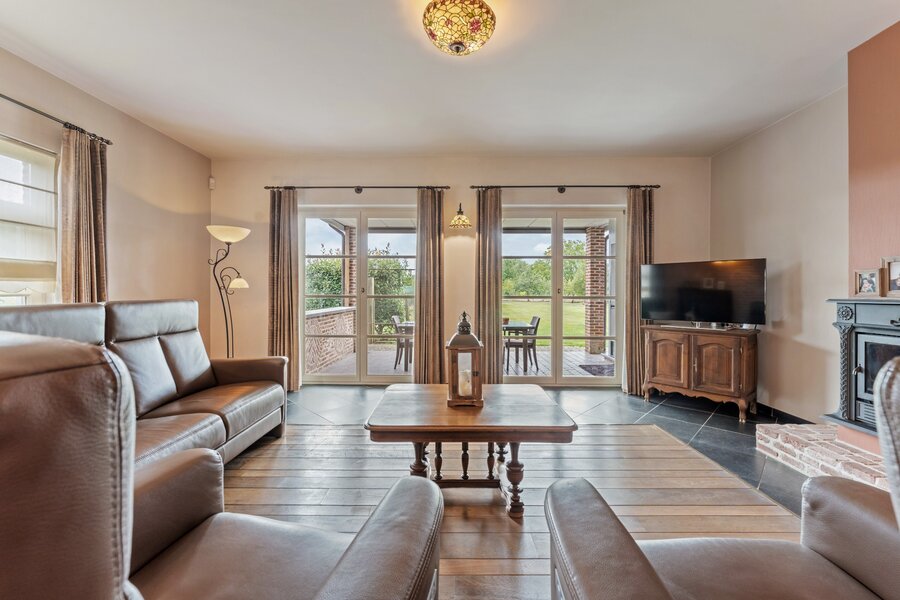 Aan de linkerzijde van de woning en aansluitend aan de centrale keuken is er de gezellige woon-leefkamer van +- 50m² met houthaard en connectie met de tuin/ overdekt terras. Verder aan deze zijde is er een bureauruimte met op maat gemaakte kasten van +-28m². Deze kan indien gewenst dienen als een gelijkvloerse slaapkamer. Ook ideaal te gebruiken als thuiskantoor. Aan de rechterzijde is er een multi-functionele ruimte met douche en toegang tot de tuin, de grote aansluitende wasplaats met toegang tot de dubbele garage. Via de massief eiken centrale trap zijn er drie grote slaapkamers, een dressing,. Een nog af te werken maar reeds verwarmde zolder van 50m² kan gebruikt worden als uiterst ruime extra slaapkamer/hobbykamer/andere. De ruime badkamer is voorzien van alle luxe. Een ruime extra carport van 60m2 zorgt buiten de vele opbergmogelijkheden in de woning voor een extra comfort.