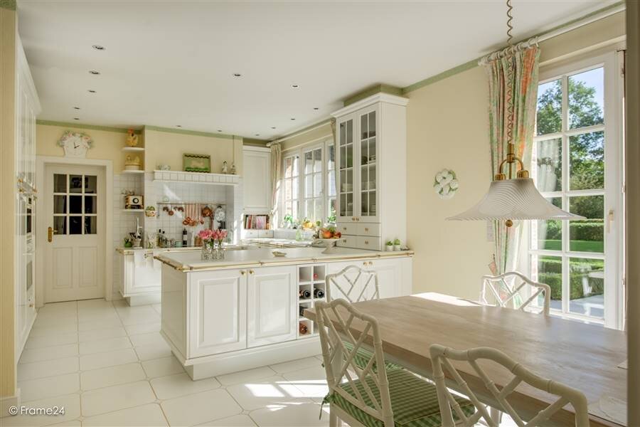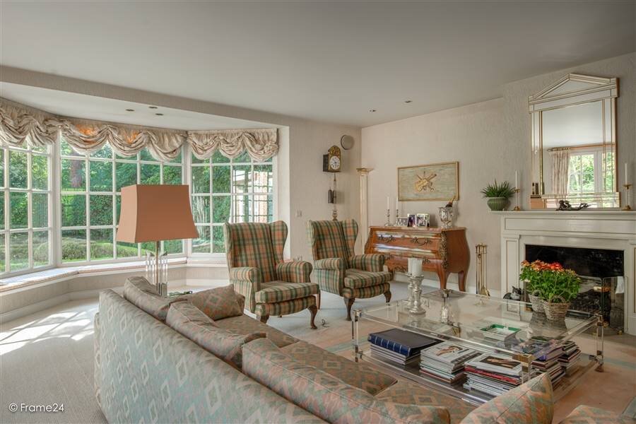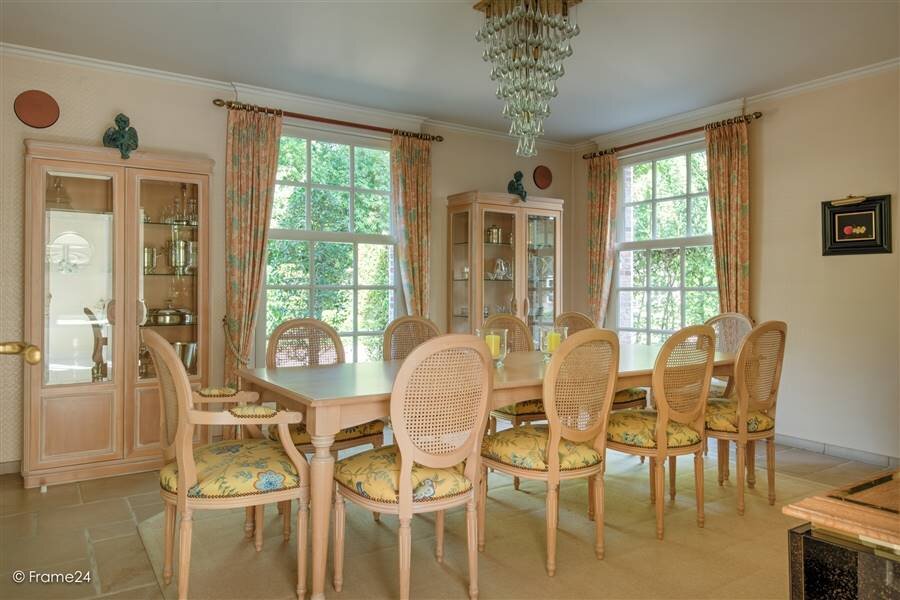 You enter the villa through the spacious central entrance hall with checkroom and guest toilet and stairs to the first floor. Through double door access to a spacious office with beautiful light and view of the garden, also connection to the living room. The living room is accessible from the entrance hall through a double door, has several doors to the garden and terrace and a bay window which offers a beautiful light. The living room has a fireplace. The living room is connected to the kitchen by a family room or relaxation area. The spacious kitchen has a breakfast room with French doors to the terrace and a spacious, fully equipped kitchen with various appliances. From the kitchen you also have access to the spacious dining room which is also connected to the entrance hall by a double door.