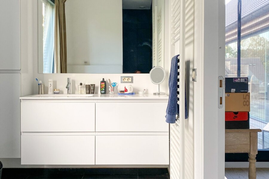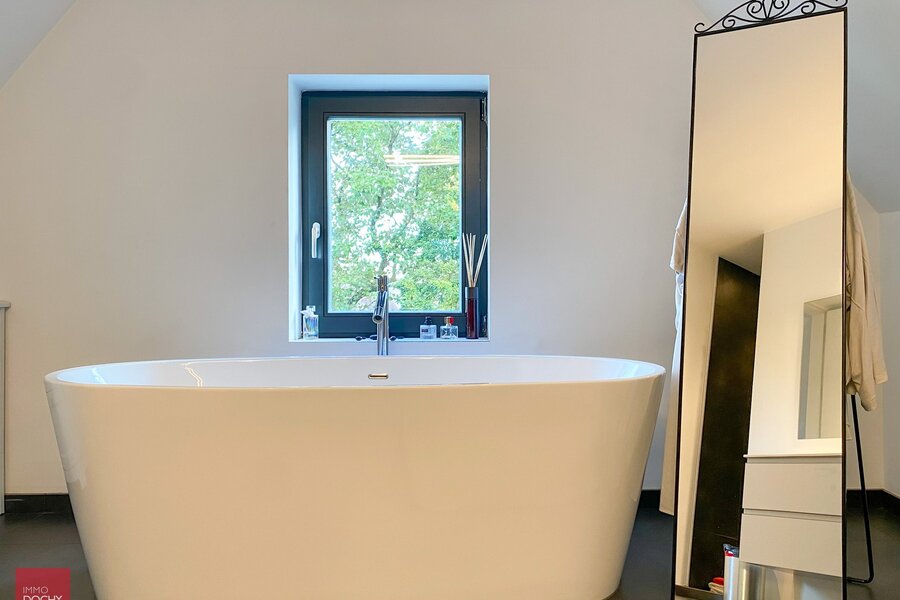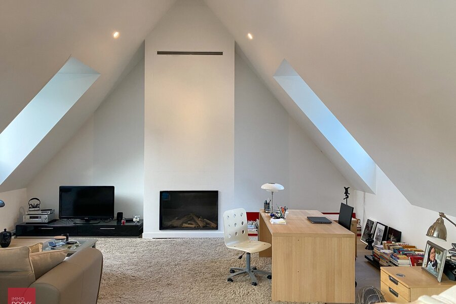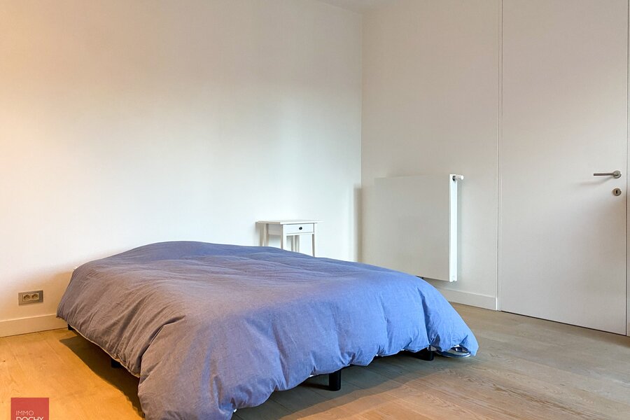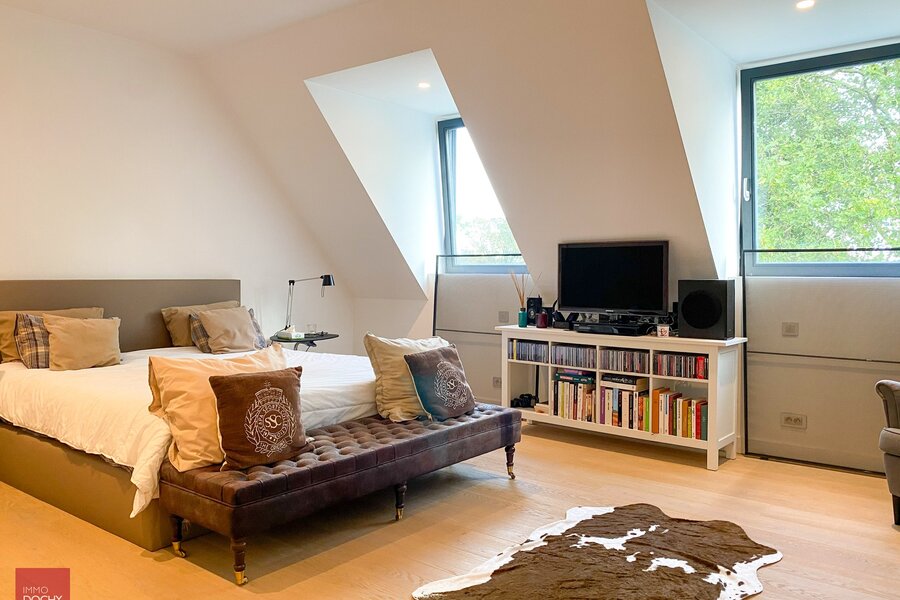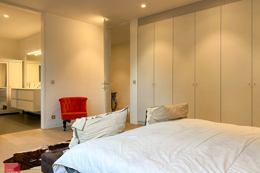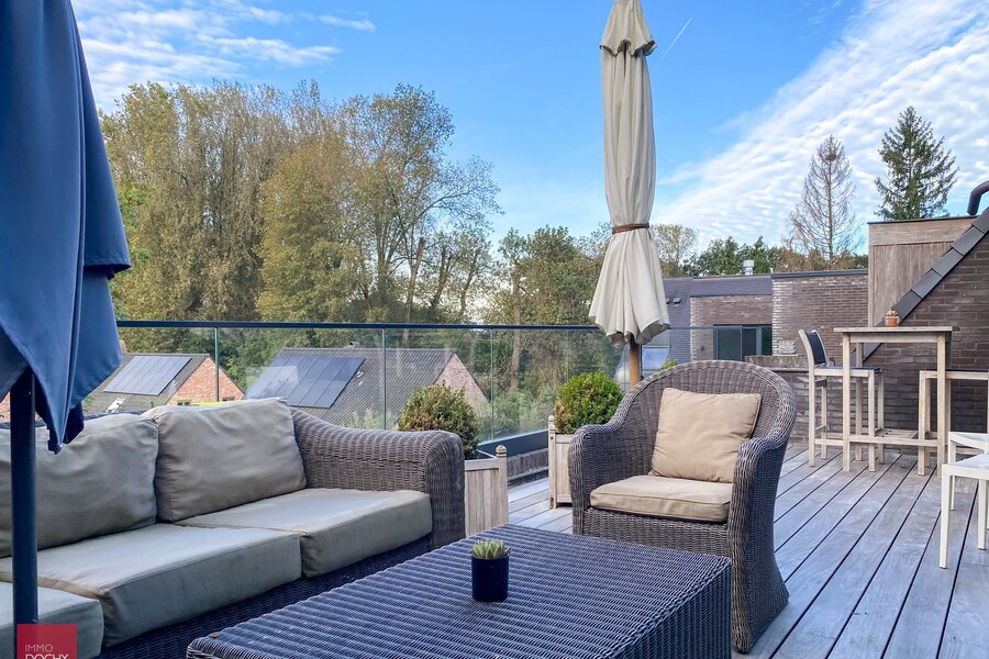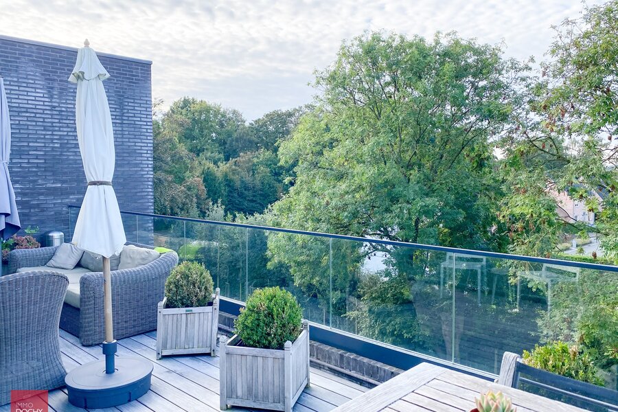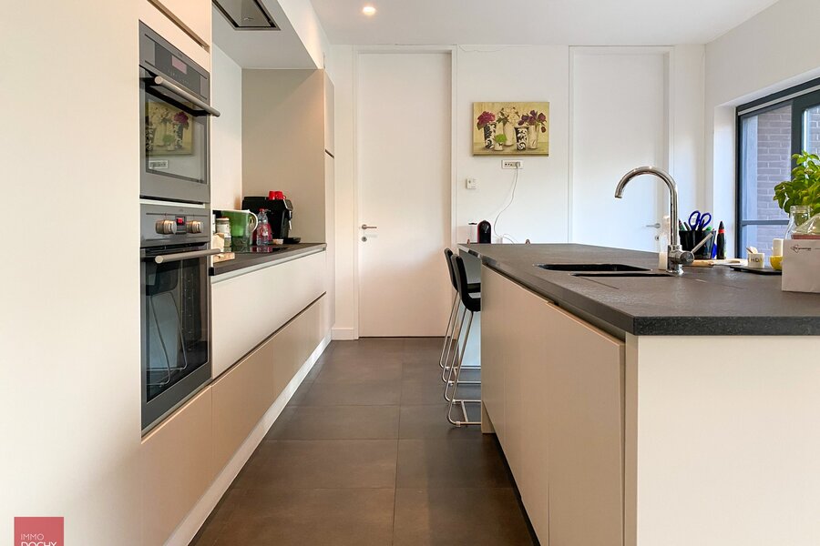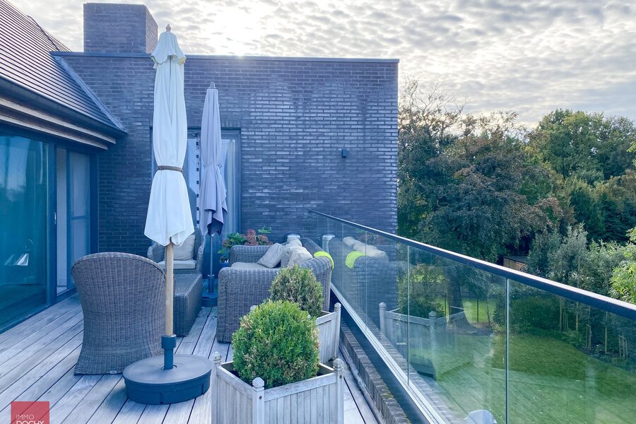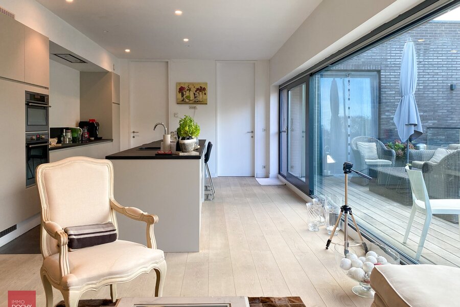 Recent gebouwd villa - appartement met 208m² binnenoppervlakte bestaande uit een inkomhall, toilet, living, ingerichte open keuken, berging, slaapkamer met douchecel annex, groot ZW-terras (24m²) met zicht op groen, slaapkamer met badkamer annex, mezzanine, ondergrondse brede parkeerplaats met kelderberging. In centrum en vlotte verbinding afritten E17