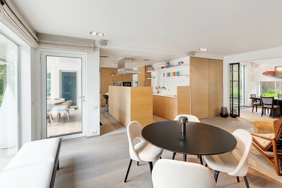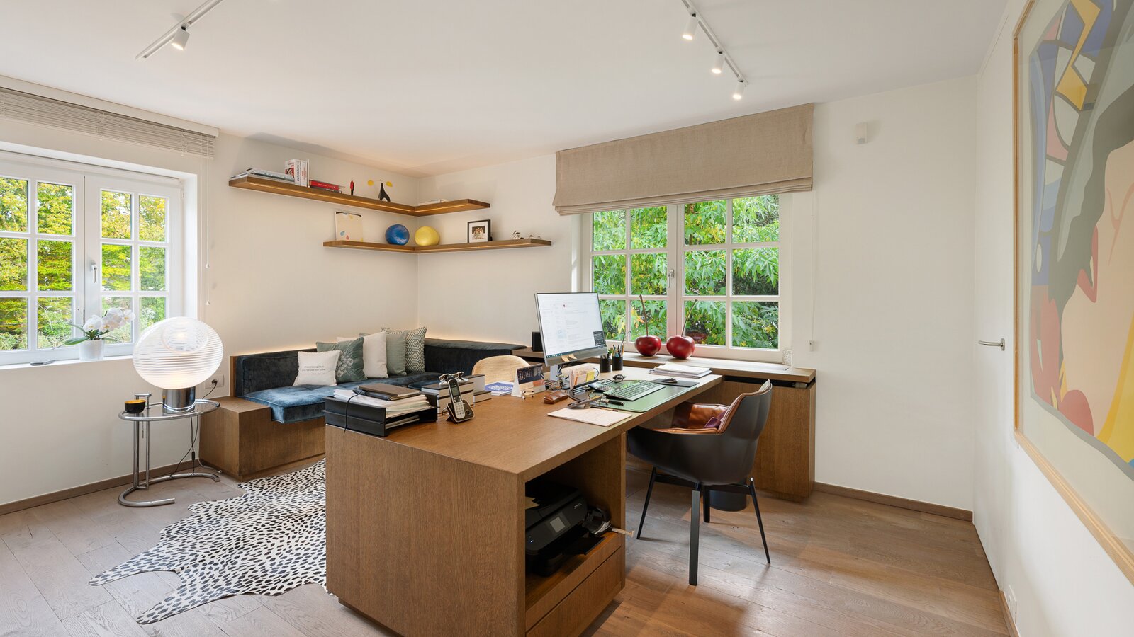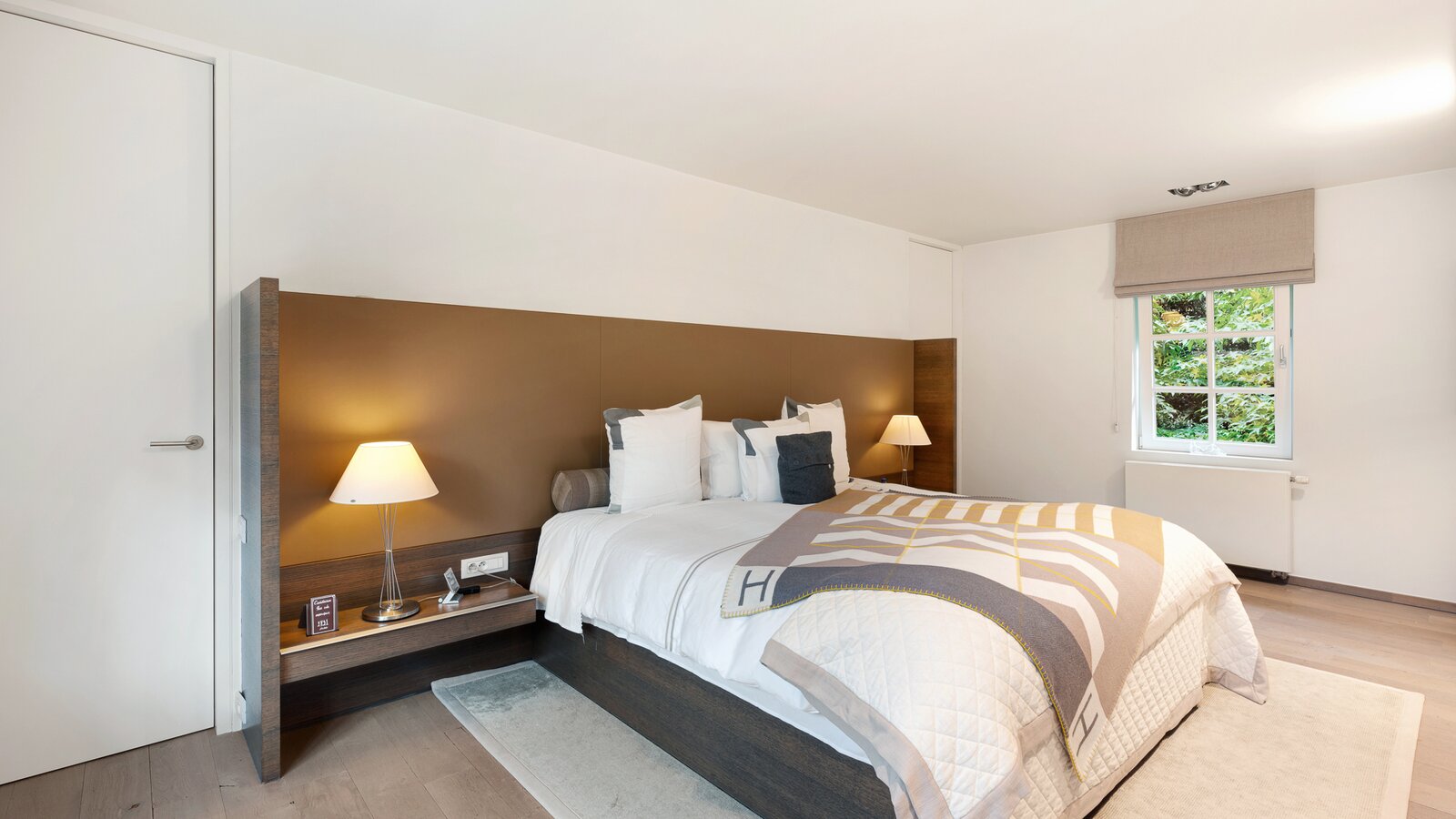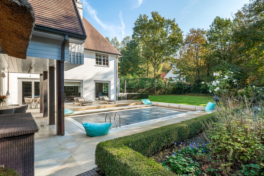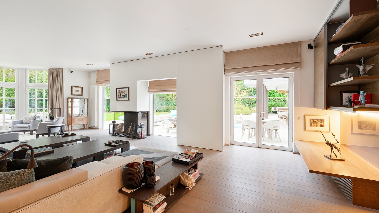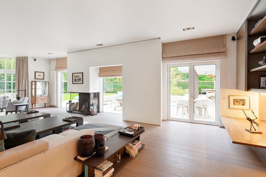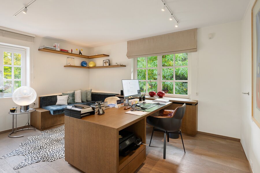 Entrance hall with checkroom and guest toilet. Spacious and luminous living room with fireplace opening onto the terrace with pool. Fully equipped open kitchen opening onto a covered terrace and adjoining dining room. Separate shower room, toilet and garage for 2 cars. On the second floor: Master bedroom with dressing room, shower room and bathroom. Two other spacious bedrooms, each with dressing room and bathroom. Office space. On the second floor: fully equipped guest house and a storage room. Fourth bedroom with bathroom. Beautiful sunny garden and spacious terraces with swimming pool. Very spacious outdoor parking lot with room for several cars. In the basement we find a technical room, laundry room, cool storage room and wine cellar. Rare offer!