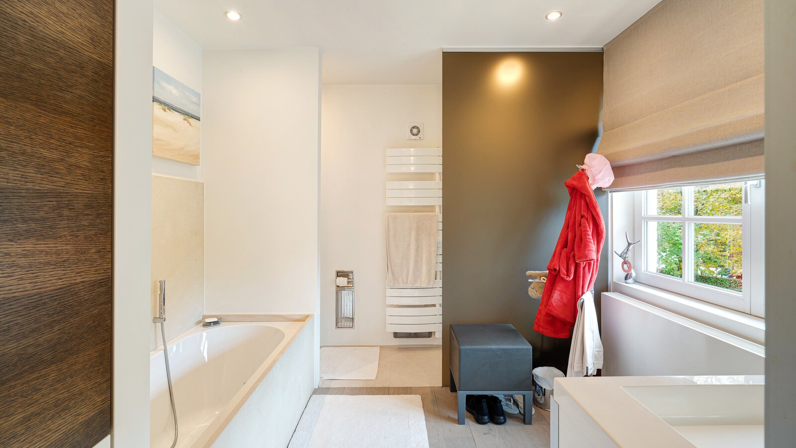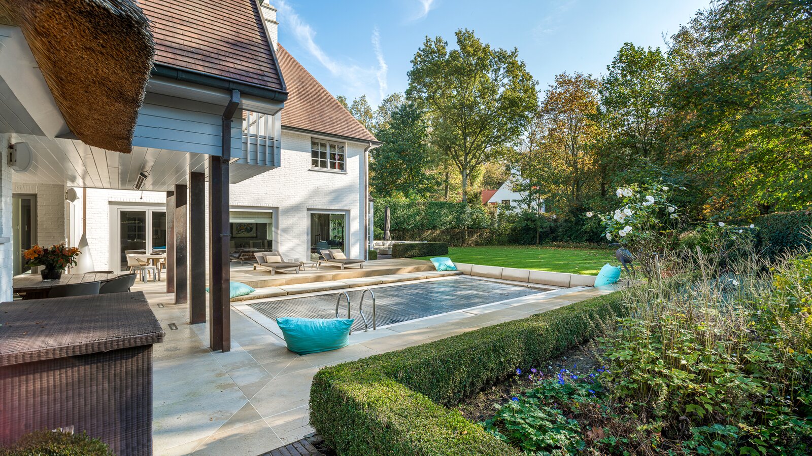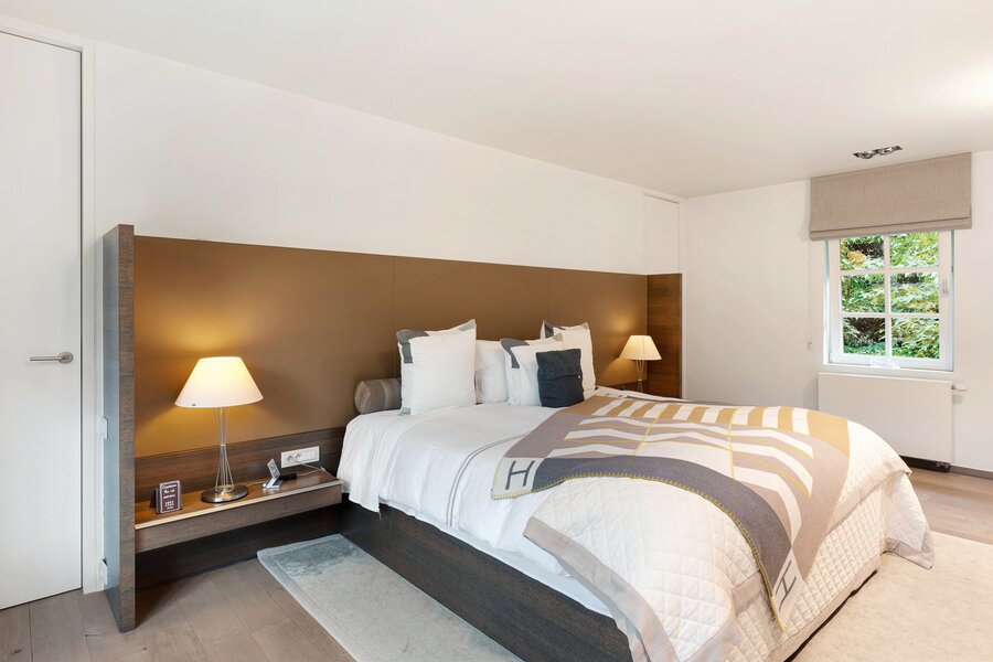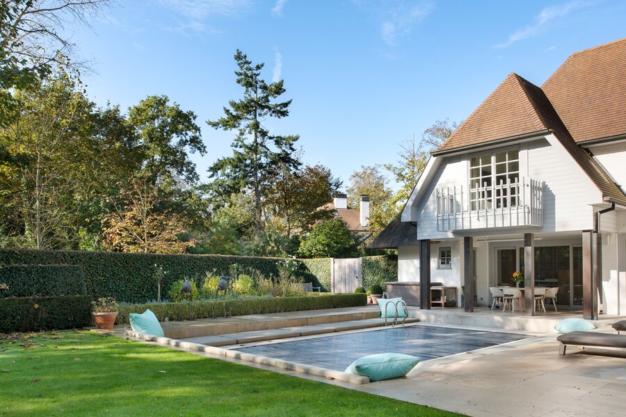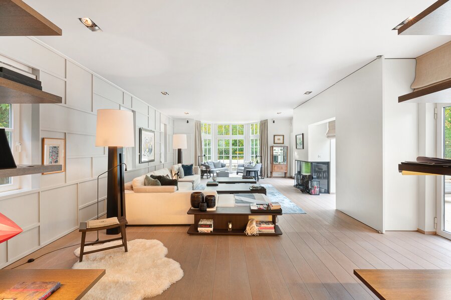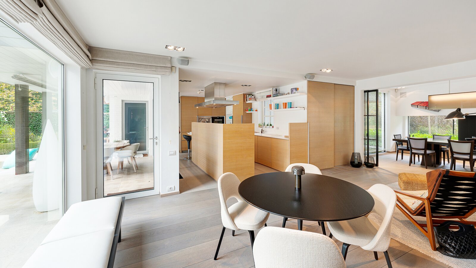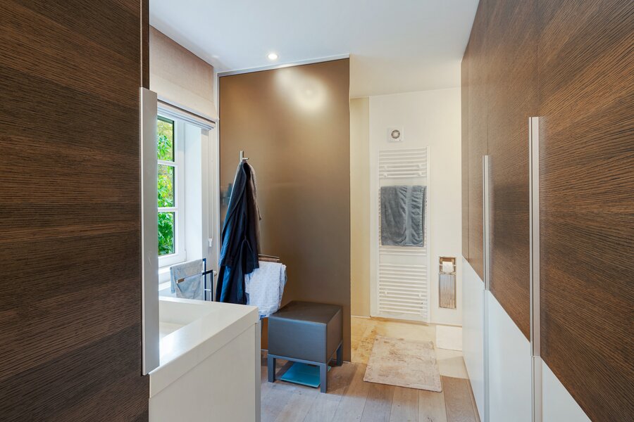 Entrance hall with checkroom and guest toilet. Spacious and luminous living room with fireplace opening onto the terrace with pool. Fully equipped open kitchen opening onto a covered terrace and adjoining dining room. Separate shower room, toilet and garage for 2 cars. On the second floor: Master bedroom with dressing room, shower room and bathroom. Two other spacious bedrooms, each with dressing room and bathroom. Office space. On the second floor: fully equipped guest house and a storage room. Fourth bedroom with bathroom. Beautiful sunny garden and spacious terraces with swimming pool. Very spacious outdoor parking lot with room for several cars. In the basement we find a technical room, laundry room, cool storage room and wine cellar. Rare offer!
