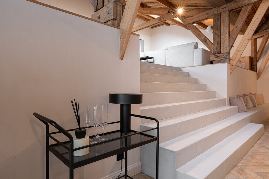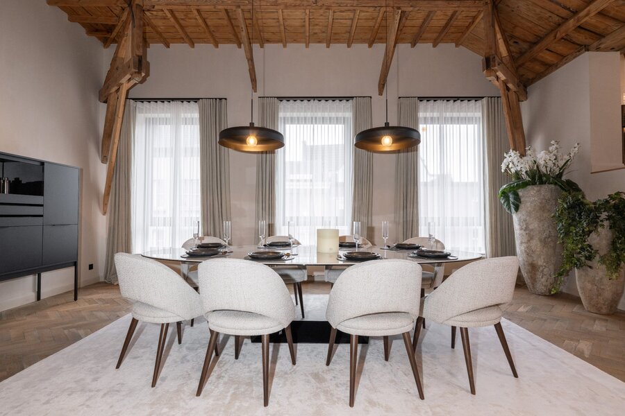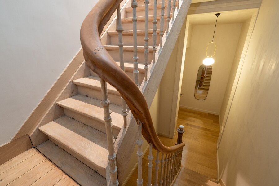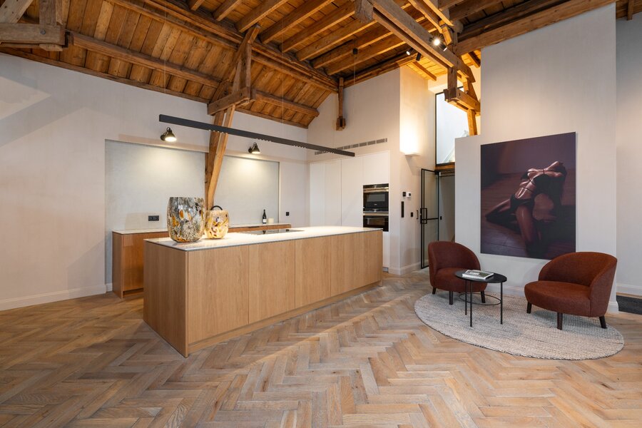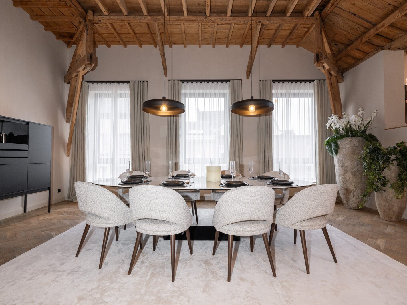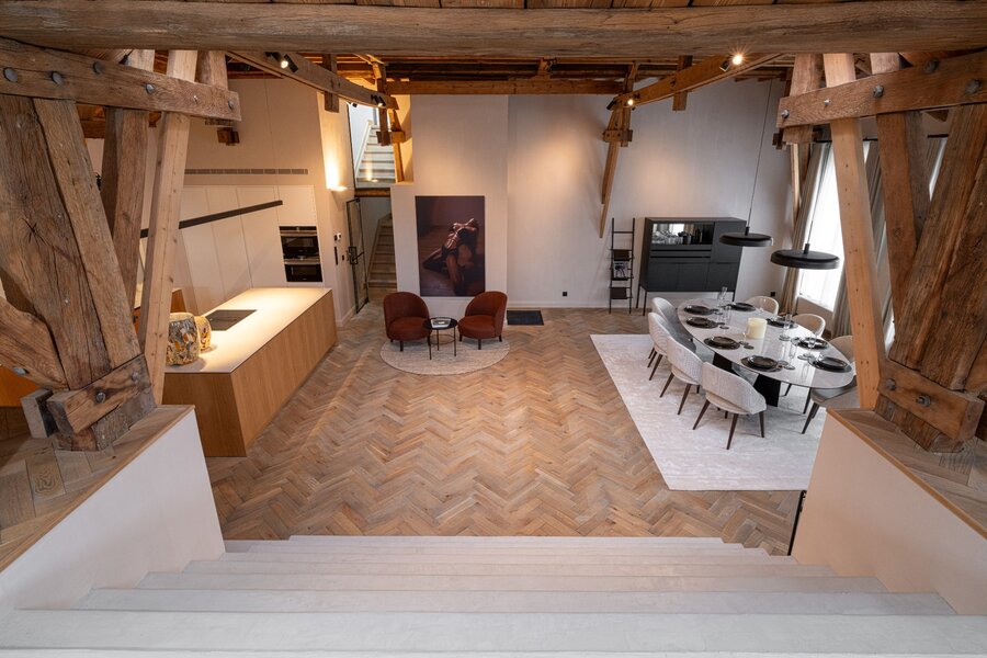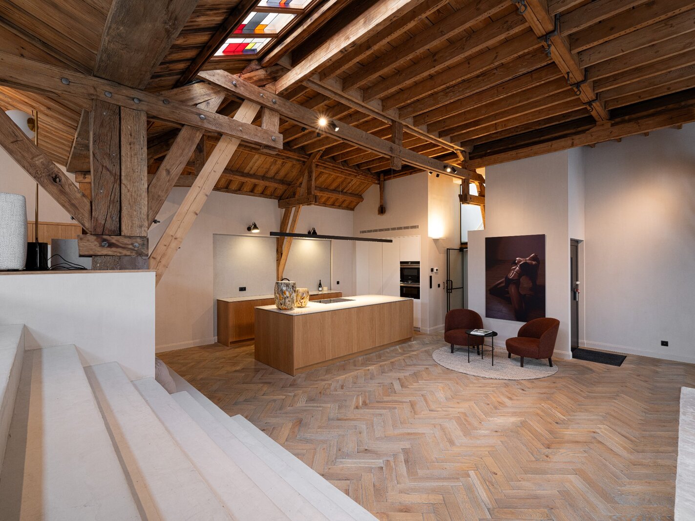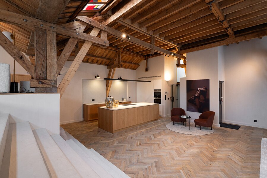 Loft van maar liefst 338 m² bewoonbare oppervlakte met 3 slaapkamers en evenveel badkamers maakt deel uit van een kleinschalig gebouw in neo-renaissancestijl op de hoek van de Mutsaardstraat/ Lange Noordstraat en straalt klasse en monumentaliteit uit. De loft werd in 2022 volledig vernieuwd en strekt zich uit over de tweede en derde verdieping van het gebouw Nottebohm.