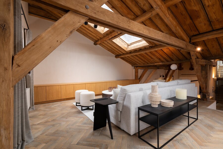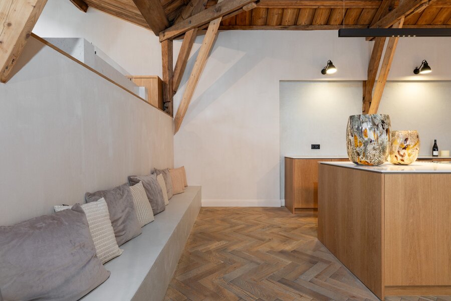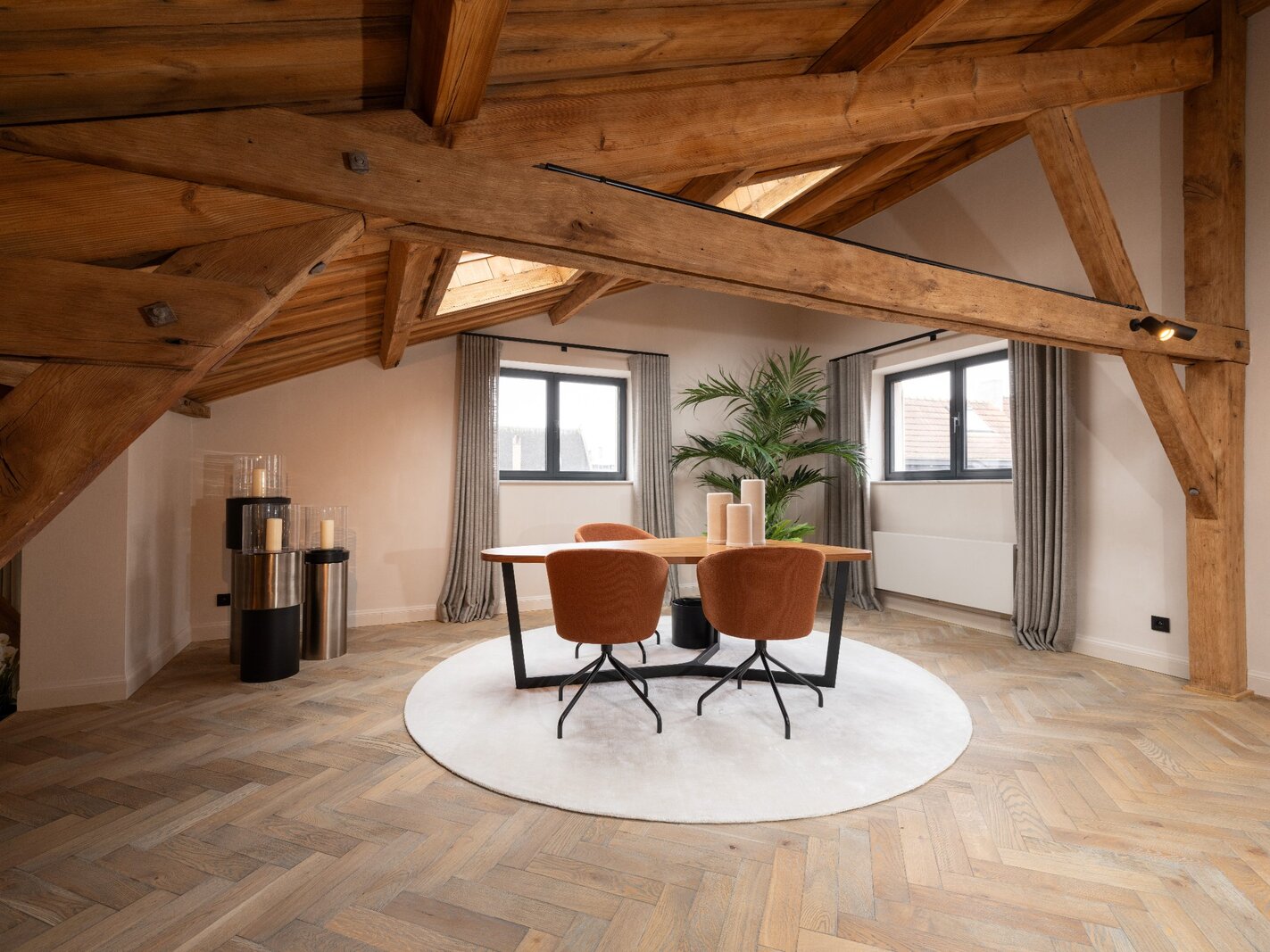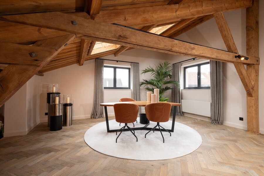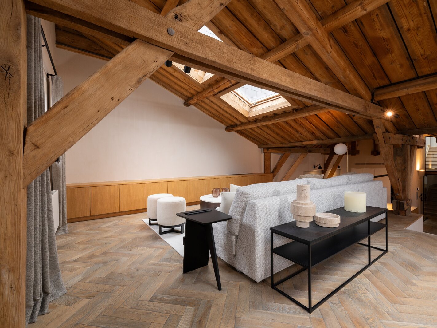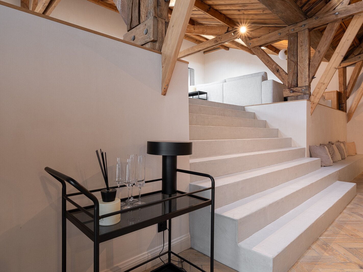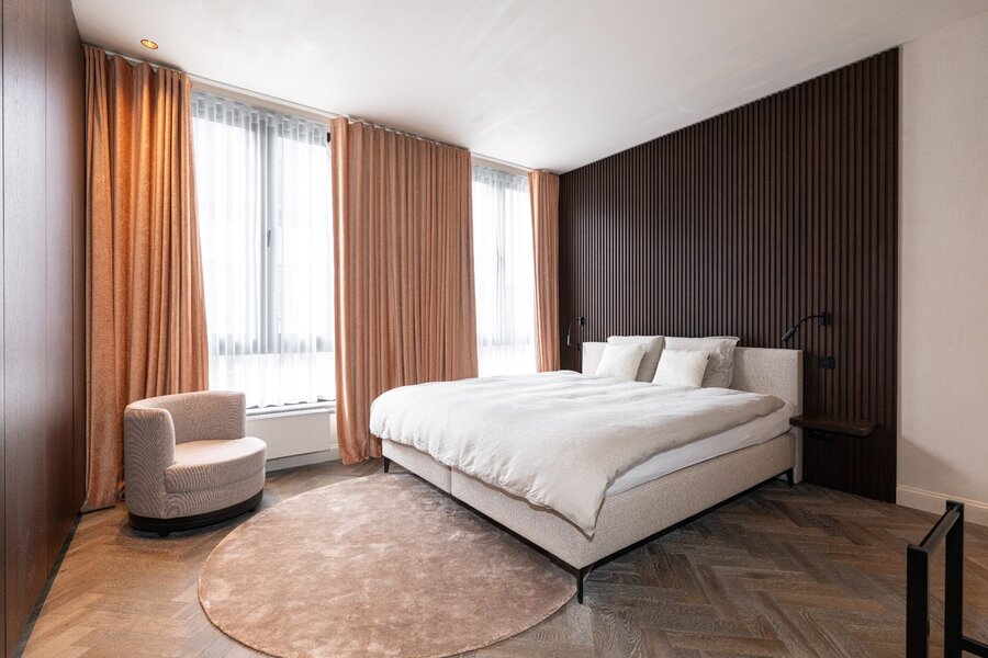 Loft van maar liefst 338 m² bewoonbare oppervlakte met 3 slaapkamers en evenveel badkamers maakt deel uit van een kleinschalig gebouw in neo-renaissancestijl op de hoek van de Mutsaardstraat/ Lange Noordstraat en straalt klasse en monumentaliteit uit. De loft werd in 2022 volledig vernieuwd en strekt zich uit over de tweede en derde verdieping van het gebouw Nottebohm.