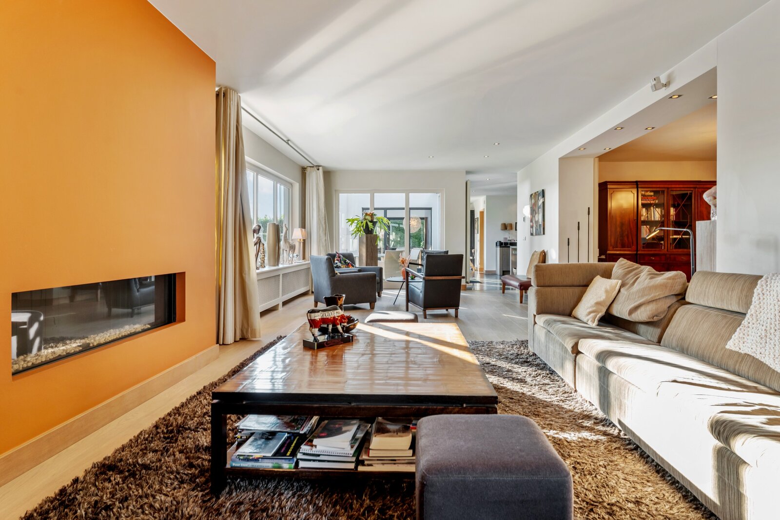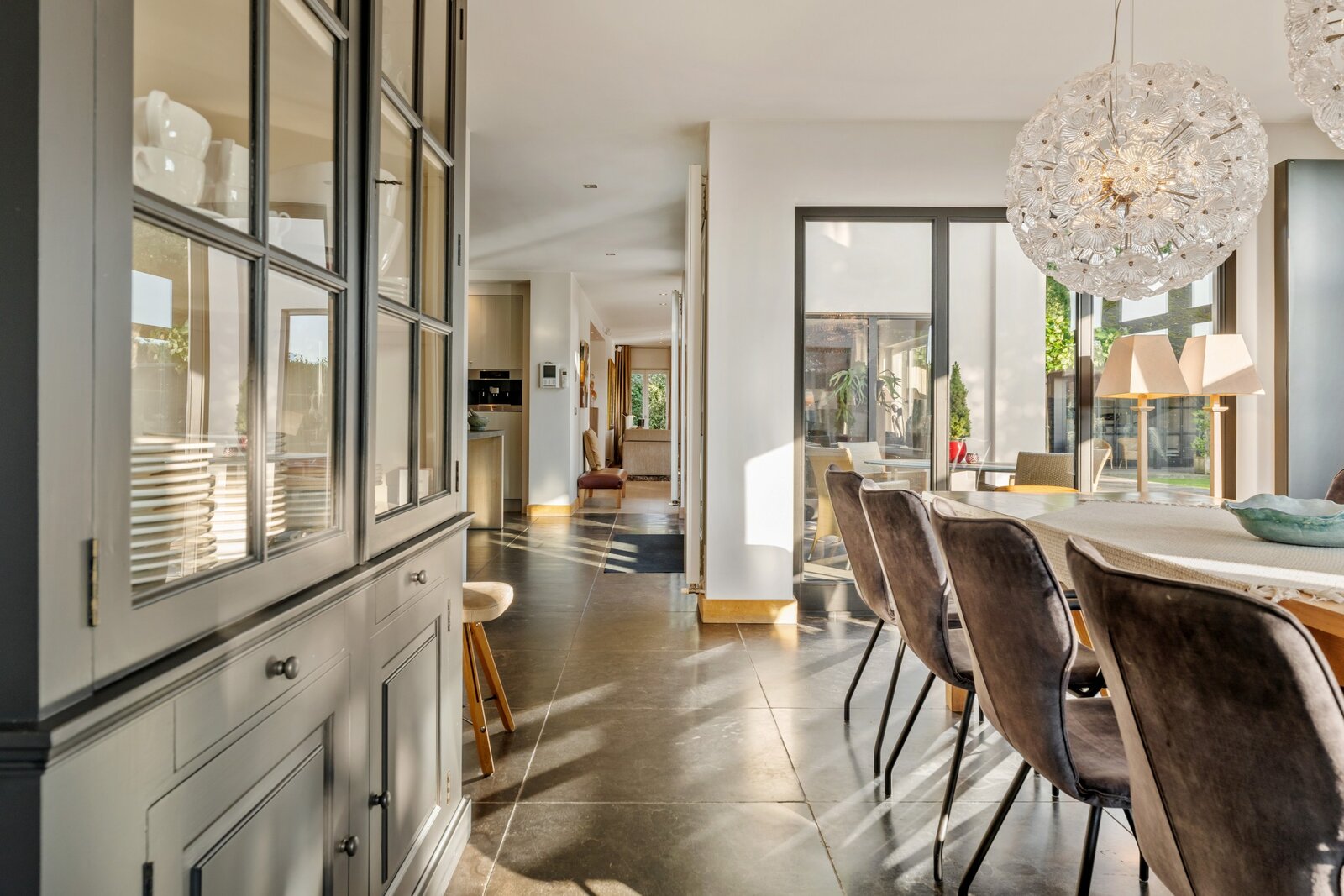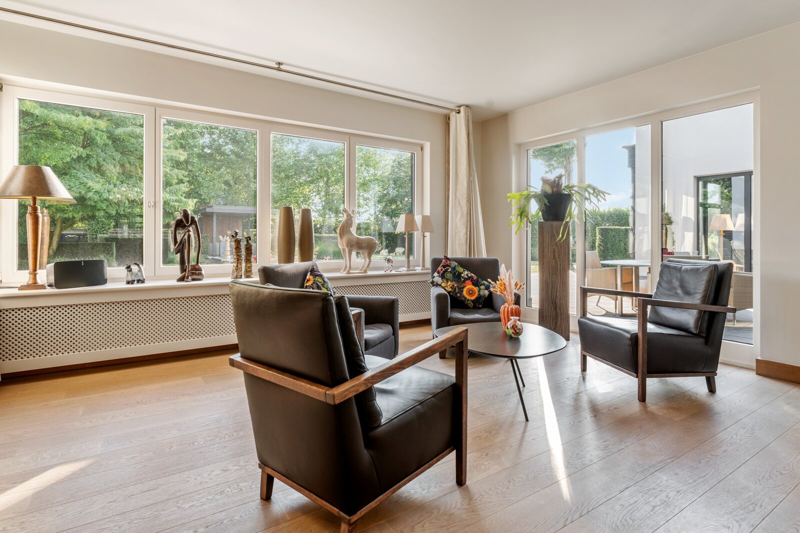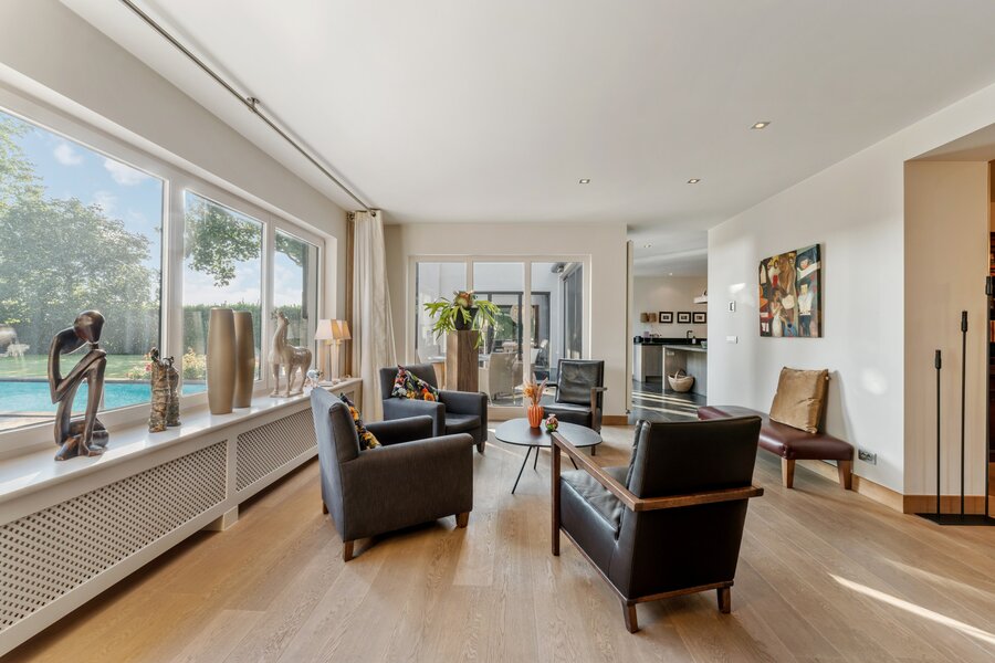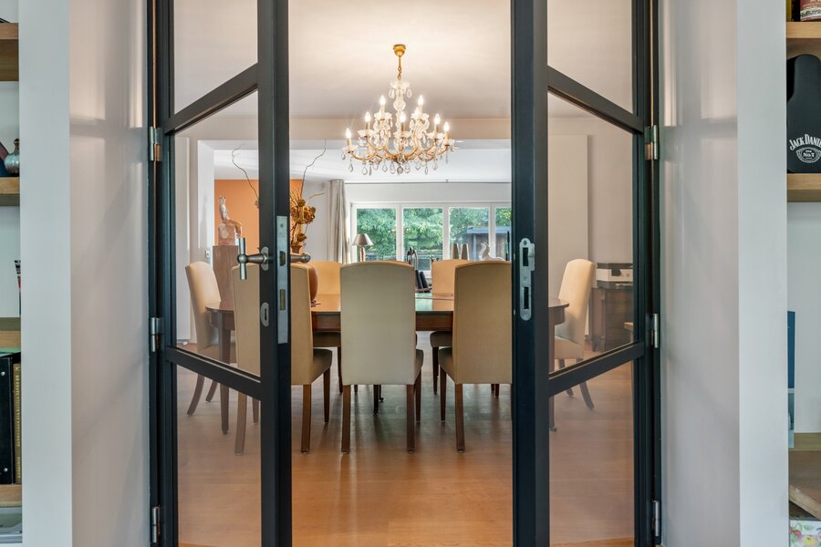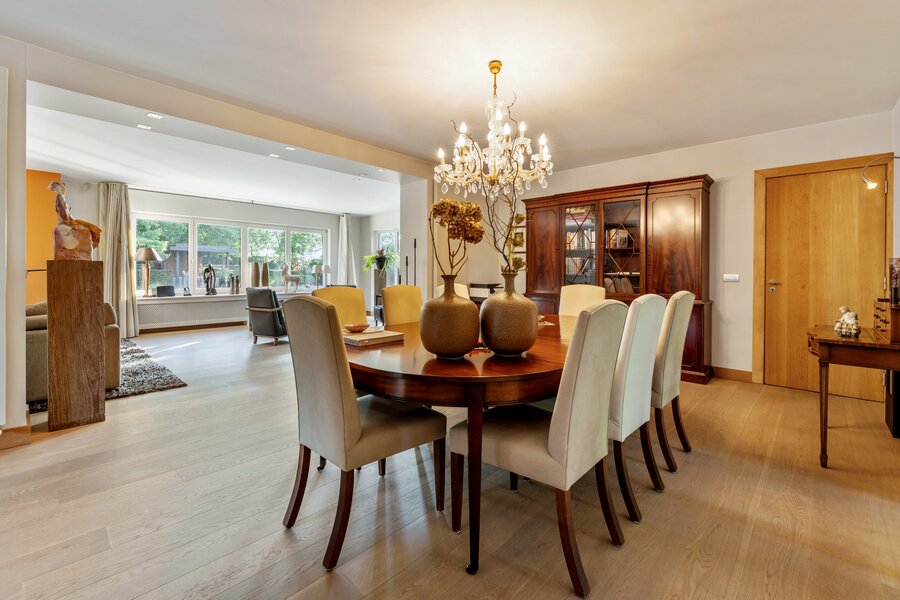 U betreedt de riante inkomhal met vestiaireruimte en ruim gastentoilet. De dubbel deur biedt toegang tot de leefkeuken die compleet is ingericht en mooi uitzicht biedt op de tuin en het zwembad. De keuken is compleet ingericht met Miele apparatuur en biedt alle comfort. Rechts van de keuken treft u een mooi eetkamer met veel lichtinval. Links van de villa bevinden zich de leefruimten op parket met oa een gezellige zithoek met gashaard, een eethoek, een tweede zithoek met zicht op de tuin, een bureau en vooraan een grote aparte ruimte - af te sluiten met dubbele glazen deur - eveneens met gashaard, dewelke dienst kan doen als kantoor, extra TV hoek,... Deze ruimte is ook toegankelijk vanuit de inkomhal.