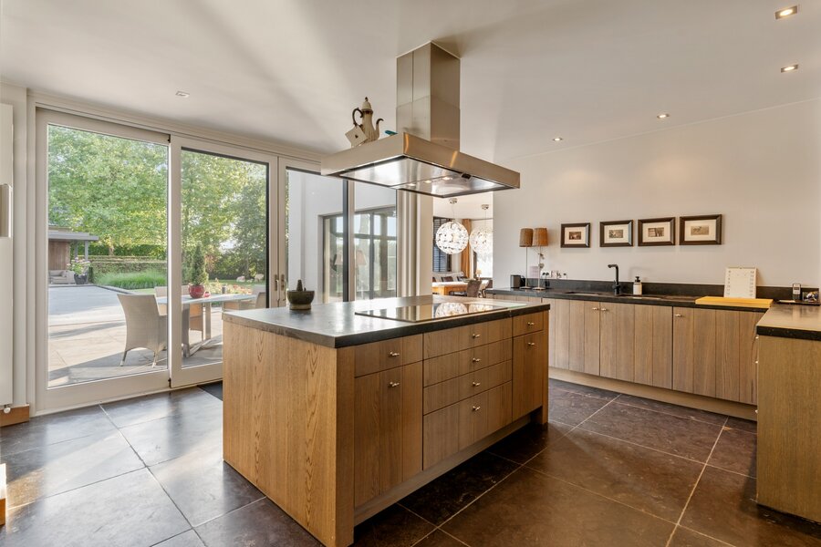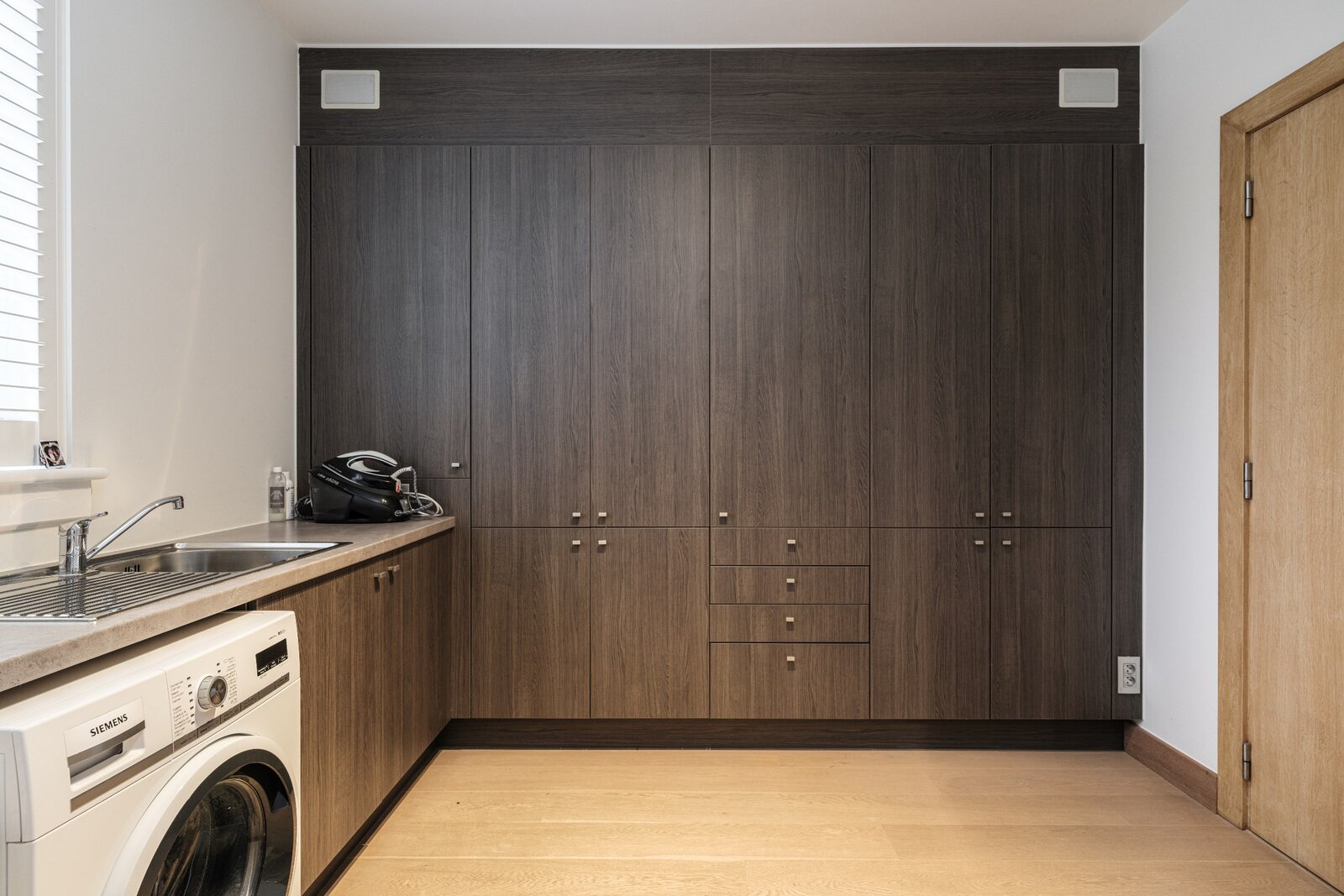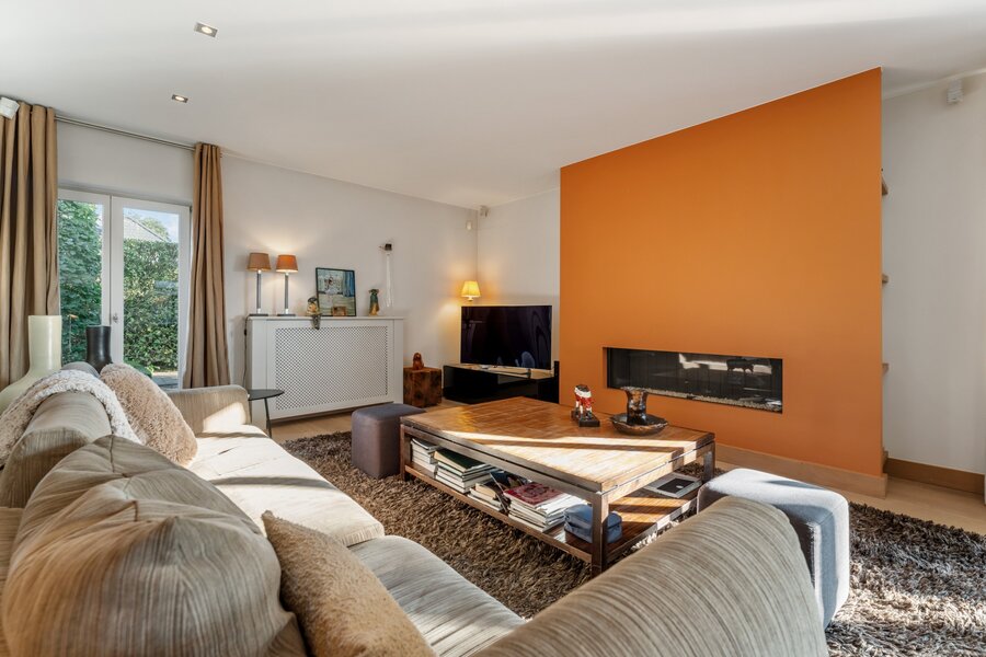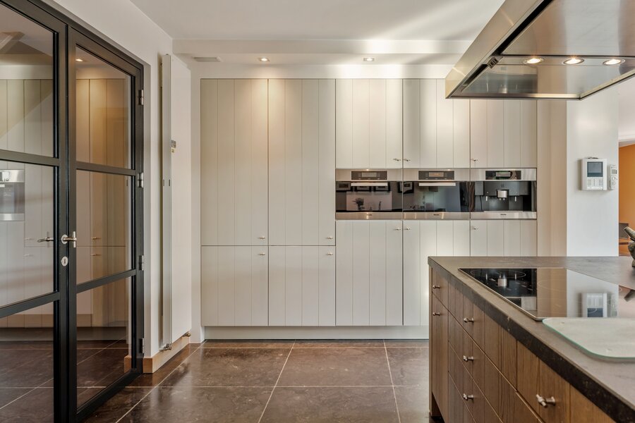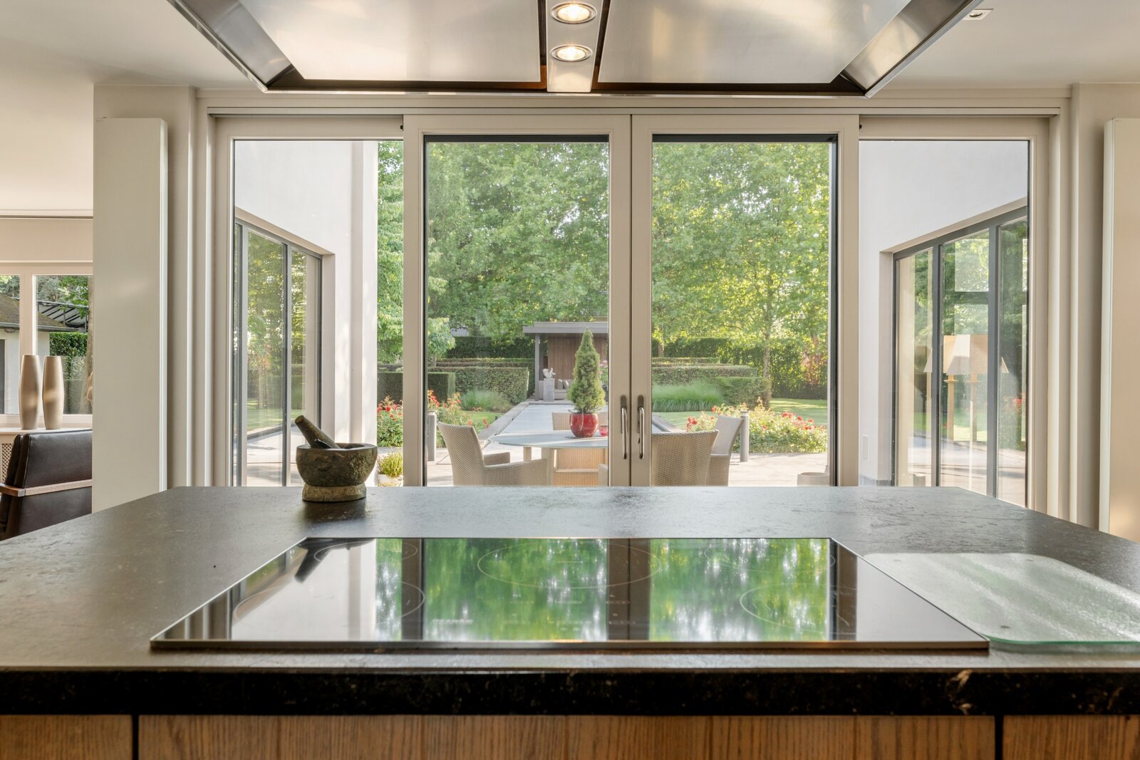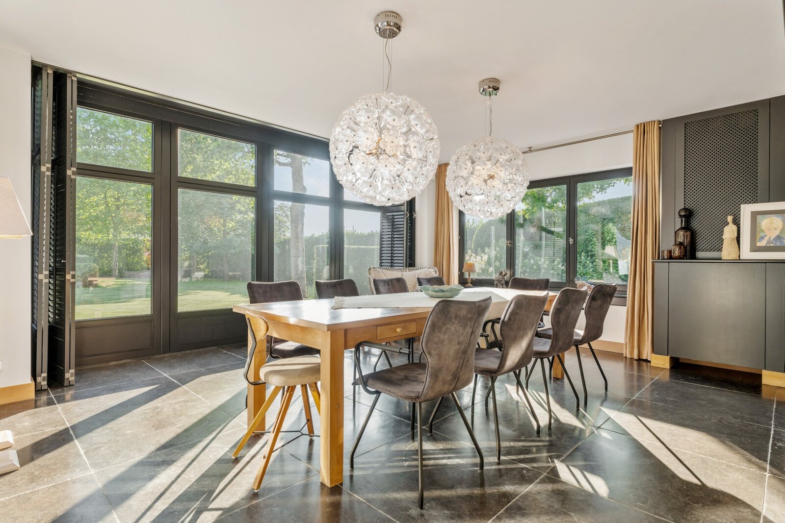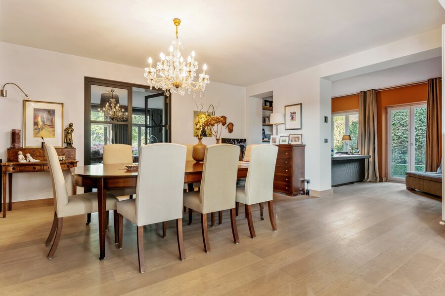 U betreedt de riante inkomhal met vestiaireruimte en ruim gastentoilet. De dubbel deur biedt toegang tot de leefkeuken die compleet is ingericht en mooi uitzicht biedt op de tuin en het zwembad. De keuken is compleet ingericht met Miele apparatuur en biedt alle comfort. Rechts van de keuken treft u een mooi eetkamer met veel lichtinval. Links van de villa bevinden zich de leefruimten op parket met oa een gezellige zithoek met gashaard, een eethoek, een tweede zithoek met zicht op de tuin, een bureau en vooraan een grote aparte ruimte - af te sluiten met dubbele glazen deur - eveneens met gashaard, dewelke dienst kan doen als kantoor, extra TV hoek,... Deze ruimte is ook toegankelijk vanuit de inkomhal.