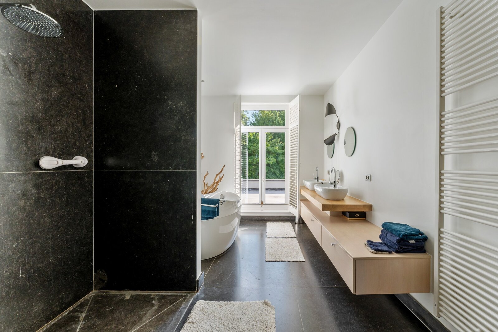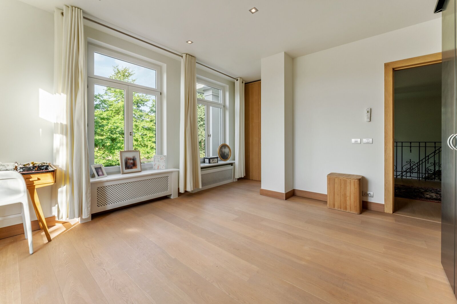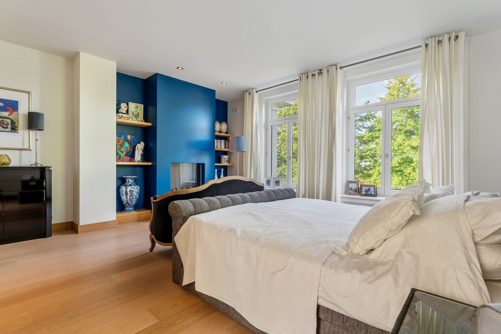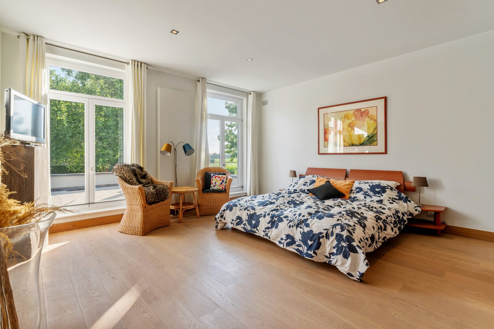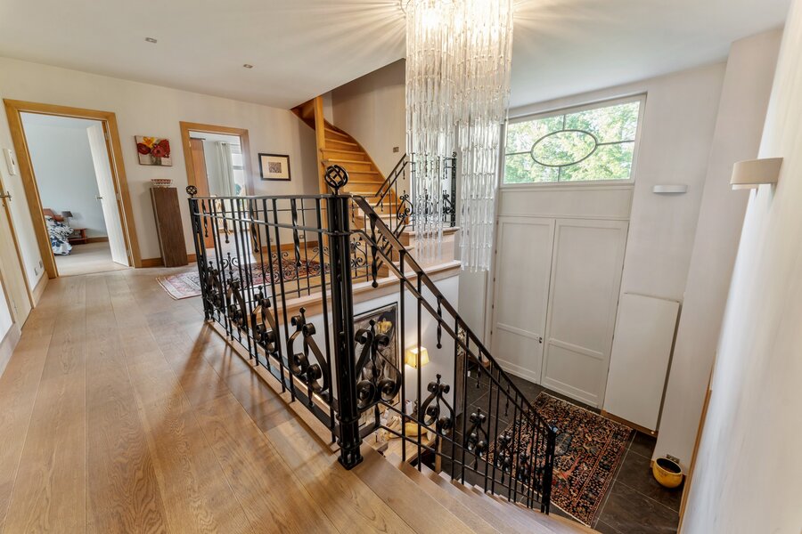 De brede trap brengt u tot de bovenverdieping. De ruime overloop biedt toegang tot de masterbedroom met gashaard, ruime aanpalende dressing en badkamer voorzien van inloopdouche, ligbad en dubbele lavabo. De ruime wasplaats met inbouwkasten bevindt zich zeer praktisch naast de dressingroom. Verder op deze verdieping nog 2 slaapkamers, waarvan er één grenst aan een badkamer voorzien van ligbad, douche en lavabo.
