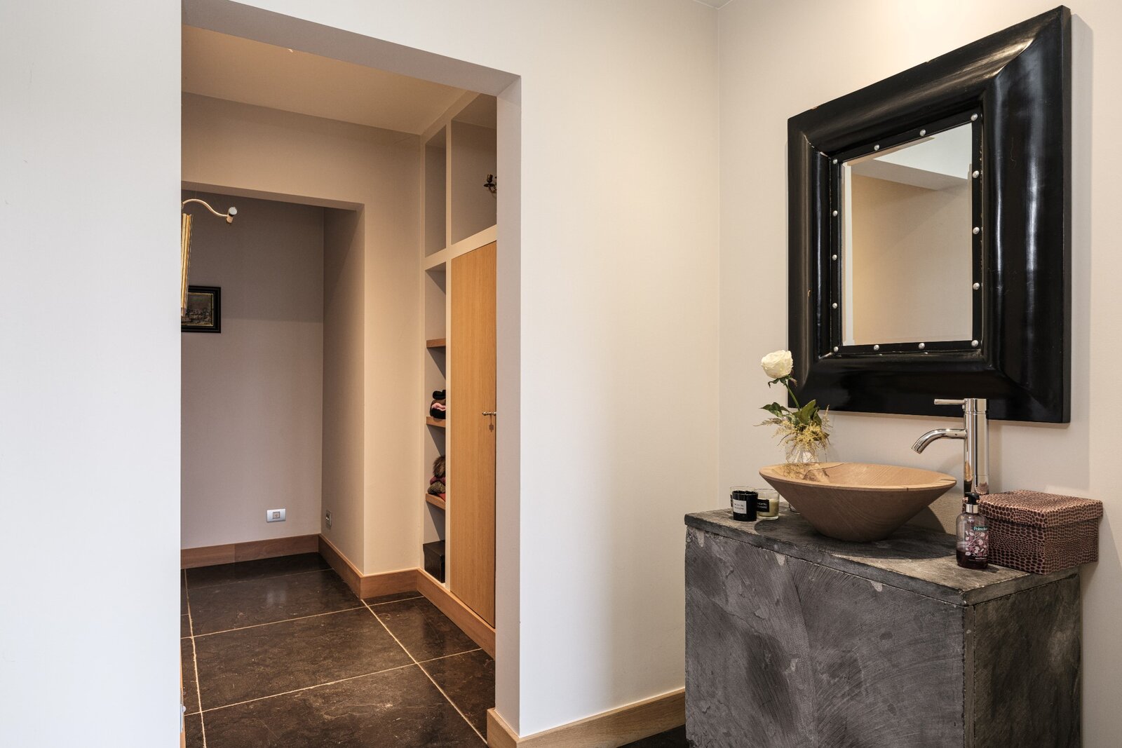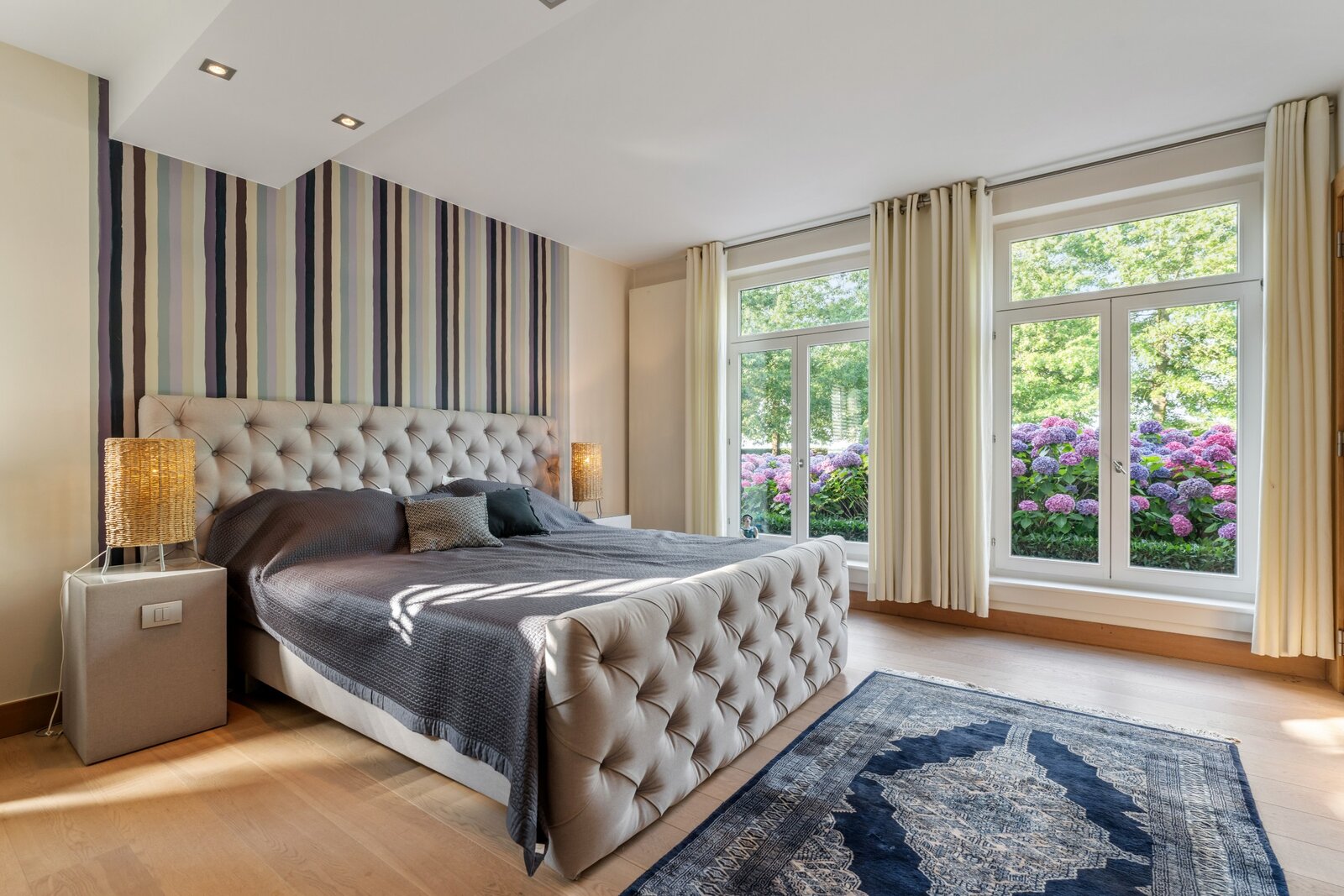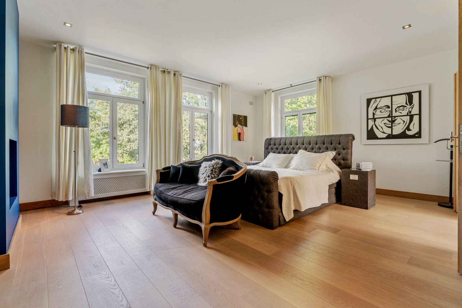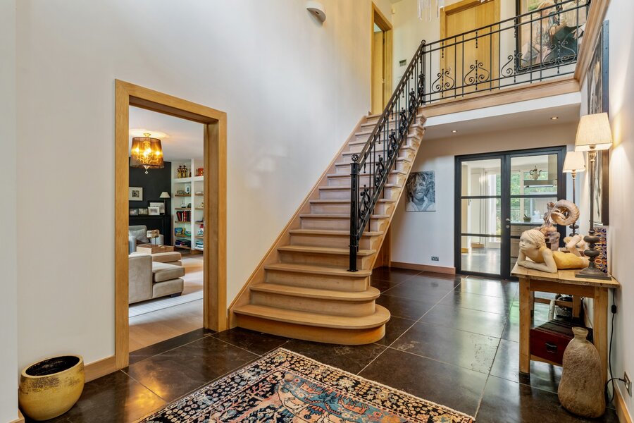 De brede trap brengt u tot de bovenverdieping. De ruime overloop biedt toegang tot de masterbedroom met gashaard, ruime aanpalende dressing en badkamer voorzien van inloopdouche, ligbad en dubbele lavabo. De ruime wasplaats met inbouwkasten bevindt zich zeer praktisch naast de dressingroom. Verder op deze verdieping nog 2 slaapkamers, waarvan er één grenst aan een badkamer voorzien van ligbad, douche en lavabo.