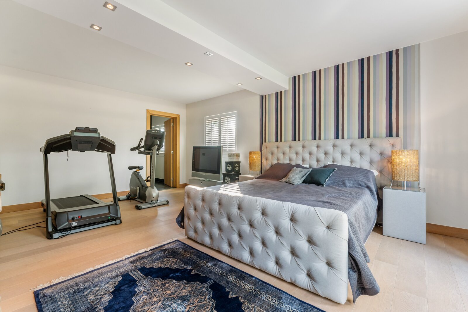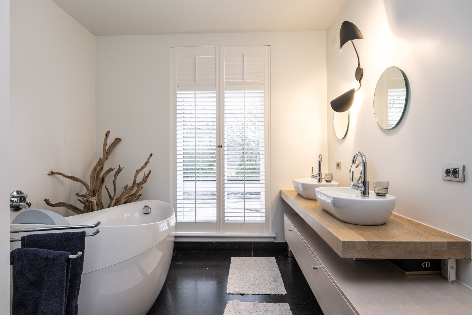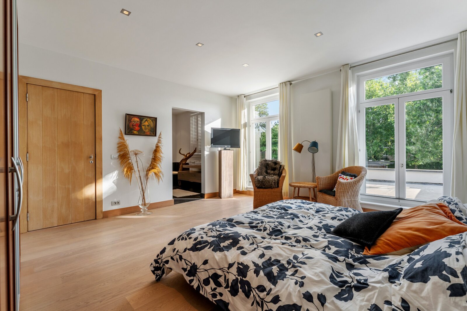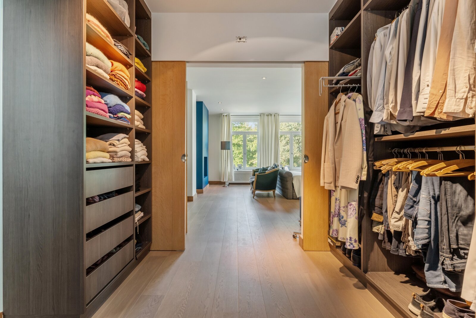 De brede trap brengt u tot de bovenverdieping. De ruime overloop biedt toegang tot de masterbedroom met gashaard, ruime aanpalende dressing en badkamer voorzien van inloopdouche, ligbad en dubbele lavabo. De ruime wasplaats met inbouwkasten bevindt zich zeer praktisch naast de dressingroom. Verder op deze verdieping nog 2 slaapkamers, waarvan er één grenst aan een badkamer voorzien van ligbad, douche en lavabo.
