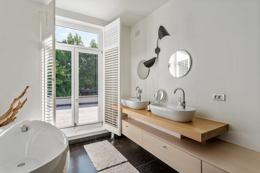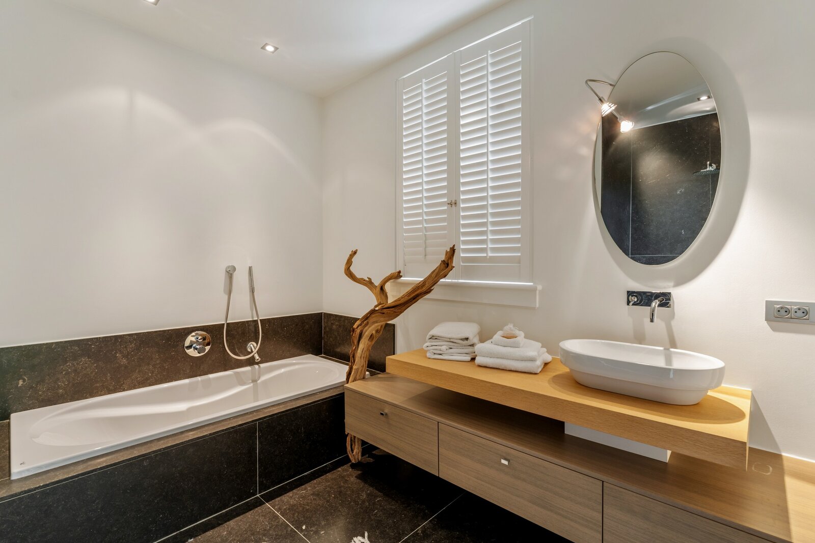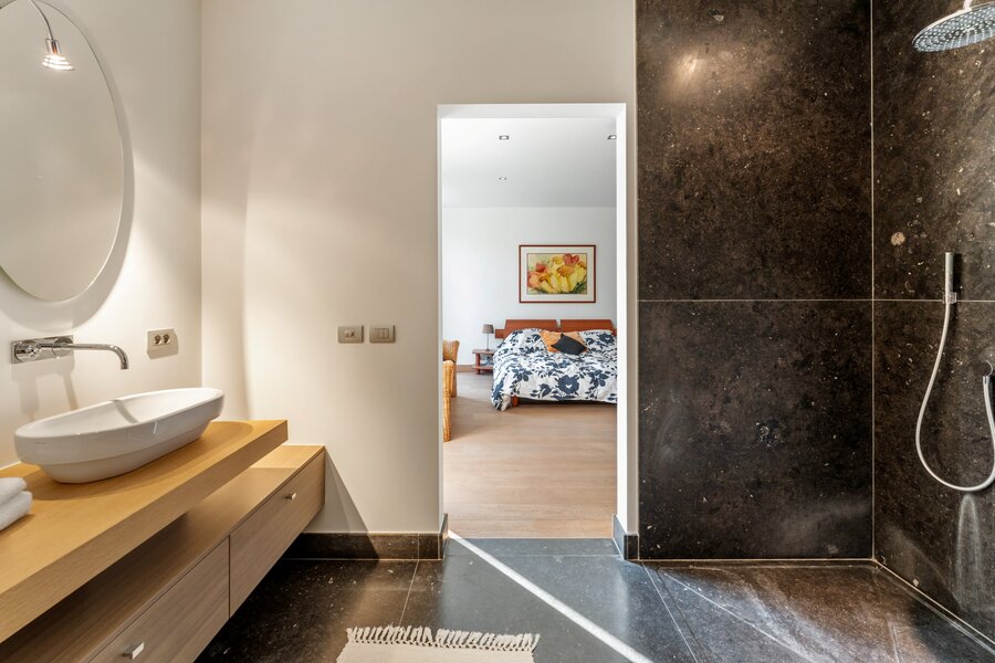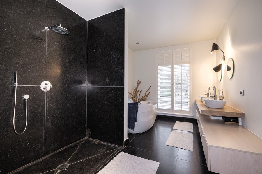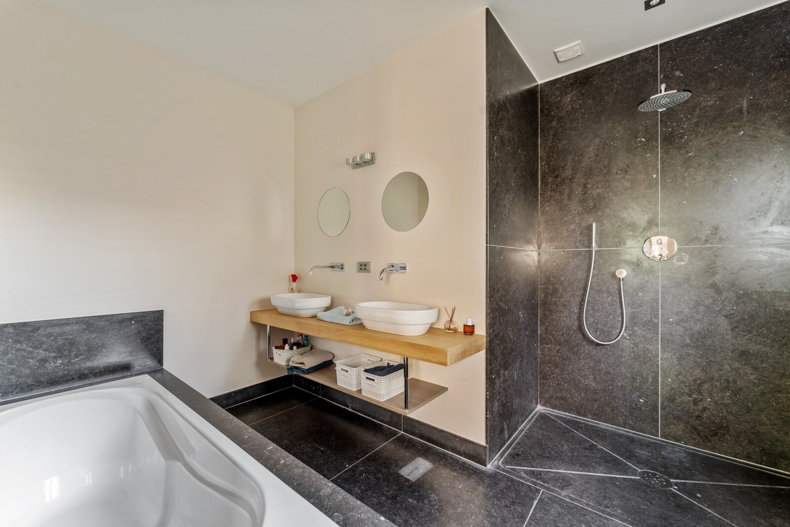 Verder op het gelijkvloers vindt u een slaapkamer op parket met aanpalende badkamer voorzien van inloopdouche, dubbele lavabo en ligbad.